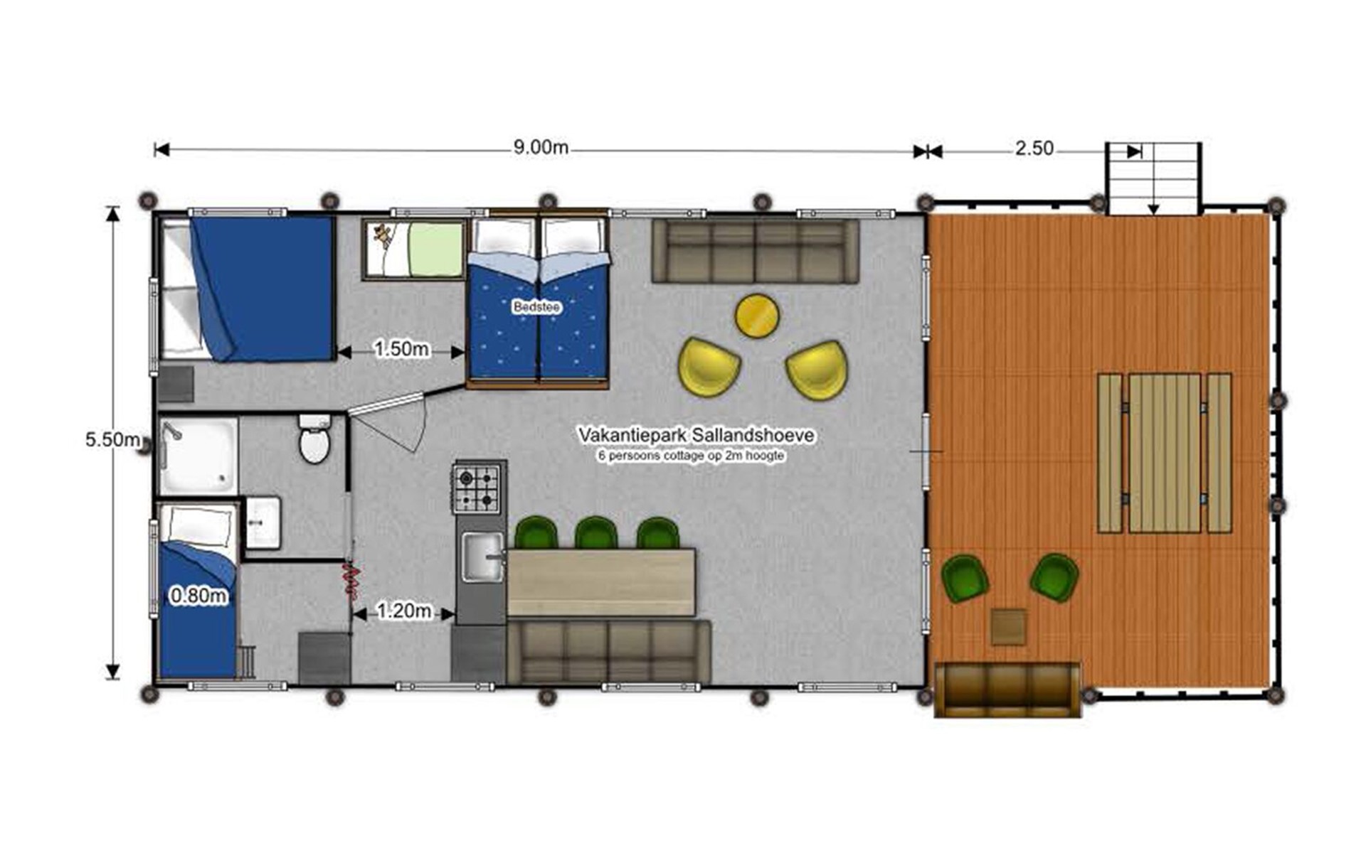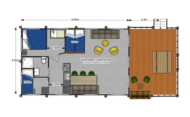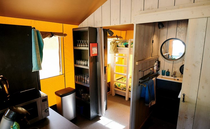 Diese Safarihütte für 6 Personen ist ein Safarizelt auf Stelzen! Bei einer Höhe von 2 Metern haben Sie einen freien Blick auf den Teich und den Strand. Diese Safarihütte für 6 Personen bereitet Ihnen einen wundervollen Aufenthalt. Auf der Veranda mit Sitzmöglichkeiten und Picknicktisch können Sie von oben die Ruhe und den Platz genießen. Es gibt eine offene Küche mit einem großen Esstisch, die für jeden genug Platz bietet. Neben dem Hauptschlafraum gibt es ebenfalls ein Schlafzimmer mit Etagenbetten und ein Loft-Schlafzimmer für 2 Personen. Sehr gemütlich!