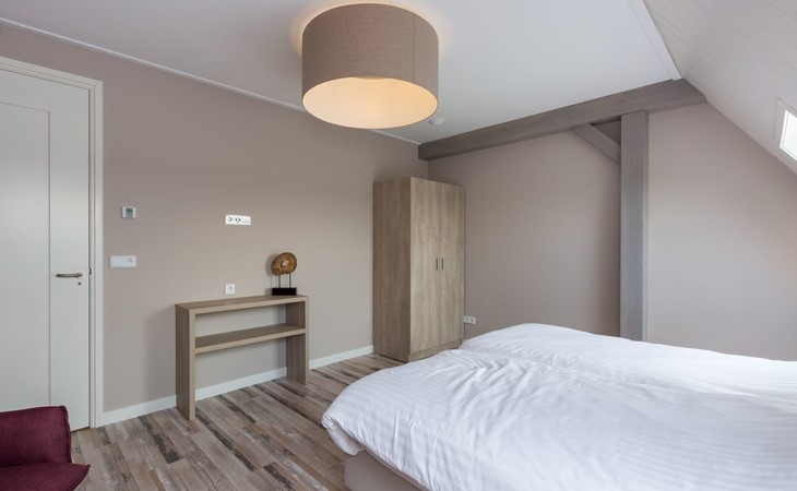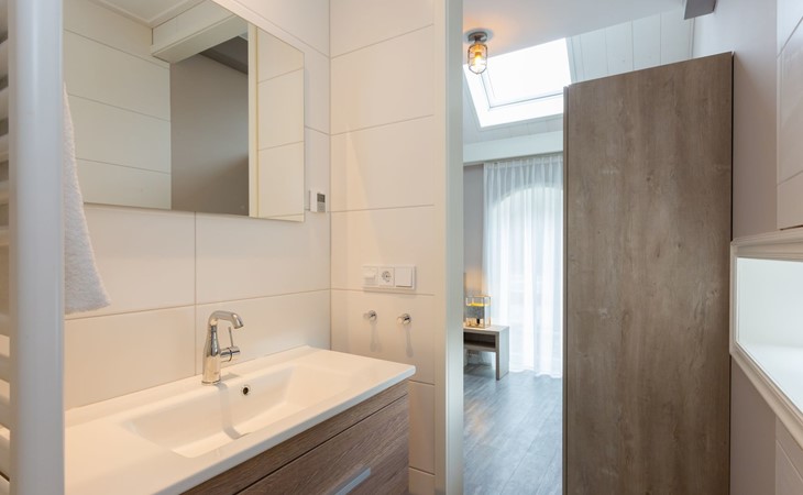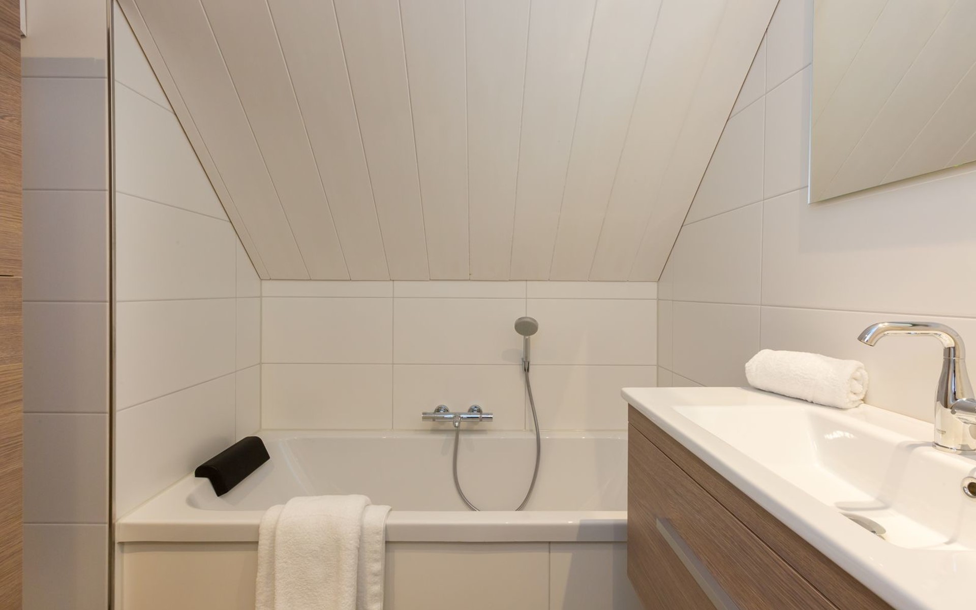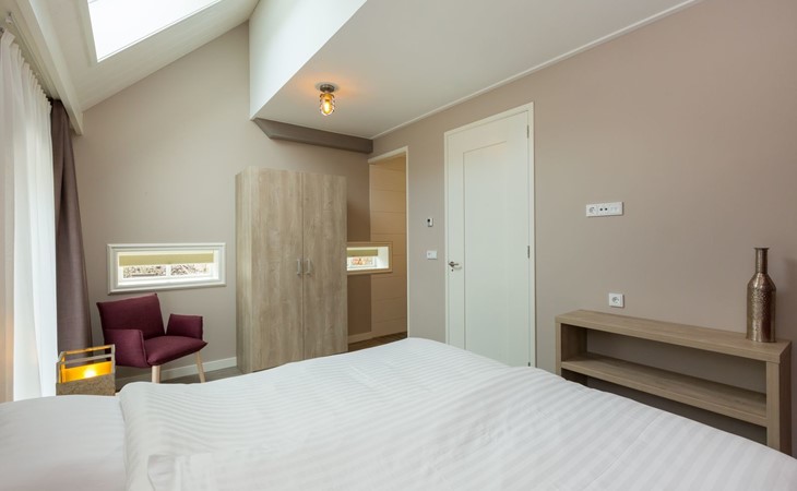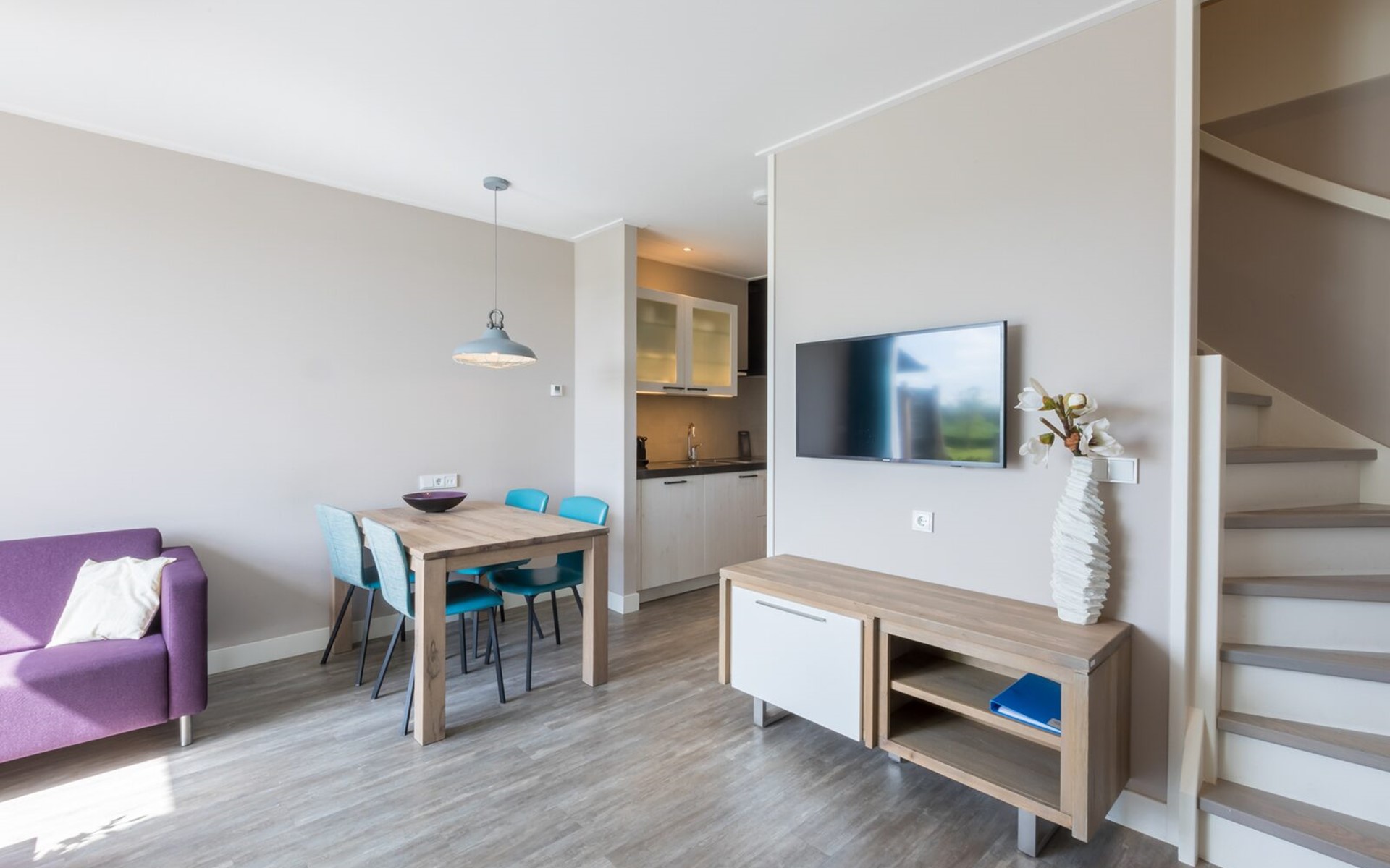 Im Erdgeschoss befindet sich ein gemütliches L-förmiges Wohnzimmer mit offener Küche, ausgestattet mit allen Annehmlichkeiten. Ebenfalls im Erdgeschoss befindet sich ein Schlafzimmer, das über 2 Einzelbetten und eine kleine Sitzgelegenheit verfügt und mit einem Waschbecken und einer eigenen Dusche ausgestattet ist. Das WC liegt direkt gegenüber dem Schlafzimmer im Flur. Das zweite Schlafzimmer auf der ersten Etage verfügt über 2 Einzelbetten und eine Sitzgelegenheit. Des Weiteren befindet sich auf der ersten Etage ein geräumiges Badezimmer, das mit einem WC, einem Waschbecken, einer Dusche mit Sunshower und einer Badewanne ausgestattet ist. Alle Schlafzimmer sind mit Boxspringbetten ausgestattet. Darüber hinaus verfügen diese beiden Appartements über ein Babyschlafzimmer.