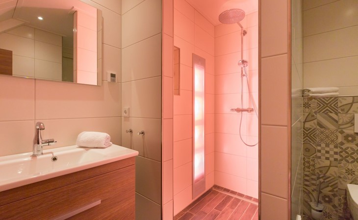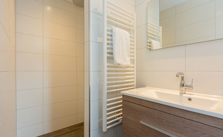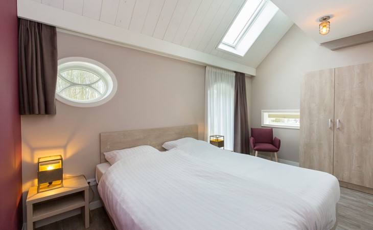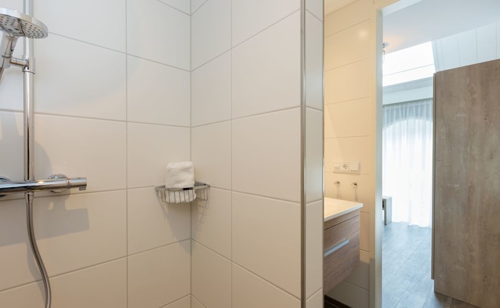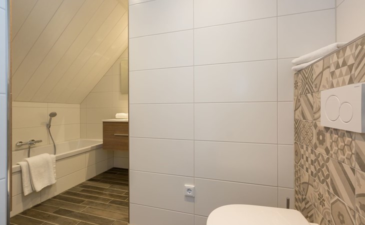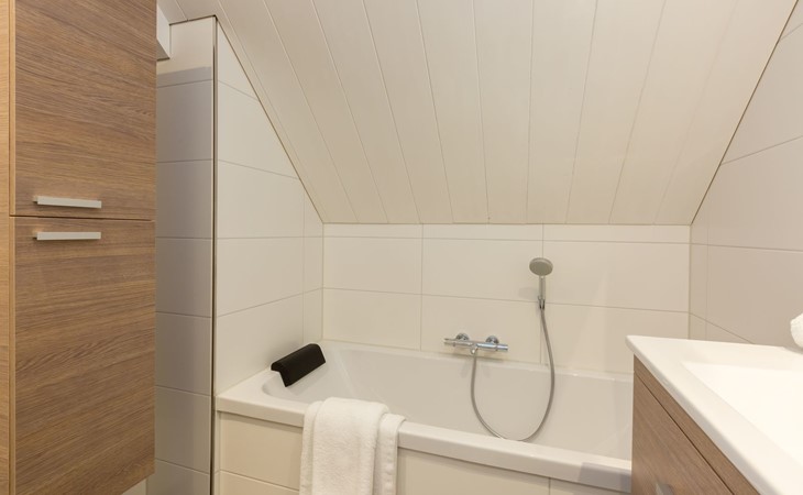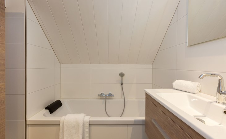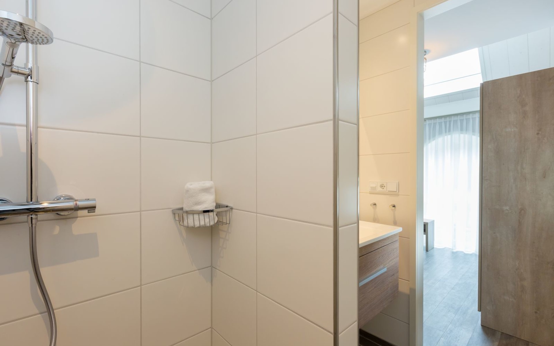 Im Erdgeschoss befindet sich ein gemütliches L-förmiges Wohnzimmer mit offener Küche, ausgestattet mit allen Annehmlichkeiten. Ebenfalls im Erdgeschoss befindet sich ein Schlafzimmer, das über 2 Einzelbetten und eine kleine Sitzgelegenheit verfügt und mit einem Waschbecken und einer eigenen Dusche ausgestattet ist. Das WC liegt direkt gegenüber dem Schlafzimmer im Flur. Das zweite Schlafzimmer auf der ersten Etage verfügt über 2 Einzelbetten und eine Sitzgelegenheit. Des Weiteren befindet sich auf der ersten Etage ein geräumiges Badezimmer, das mit einem WC, einem Waschbecken, einer Dusche mit Sunshower und einer Badewanne ausgestattet ist. Alle Schlafzimmer sind mit Boxspringbetten ausgestattet. Darüber hinaus verfügen diese beiden Appartements über ein Babyschlafzimmer.