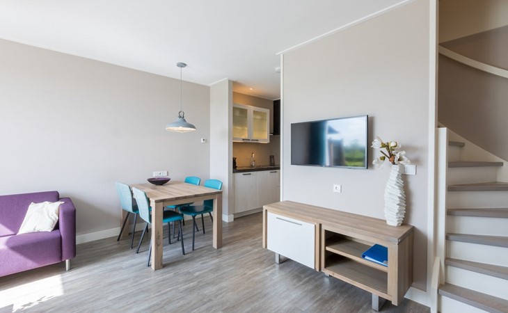 Im Erdgeschoss befindet sich ein gemütliches Wohnzimmer mit offener Küche, ausgestattet mit allen Annehmlichkeiten. Das WC liegt in ein Portal im Halle im Flur. Zwei Schlafzimmer befinden sich auf der ersten Etage und verfügen ebenfalls über 2 Einzelbetten und eine Sitzgelegenheit. Des Weiteren befindet sich auf der ersten Etage ein geräumiges Badezimmer, das mit einem WC, einem Waschbecken, einer Dusche mit Sunshower und einer Badewanne ausgestattet ist. Alle Schlafzimmer sind mit Boxspringbetten ausgestattet. Haustieren sind nur erlaubt auf Anfrage und nach Zustimmung von Rezeption.