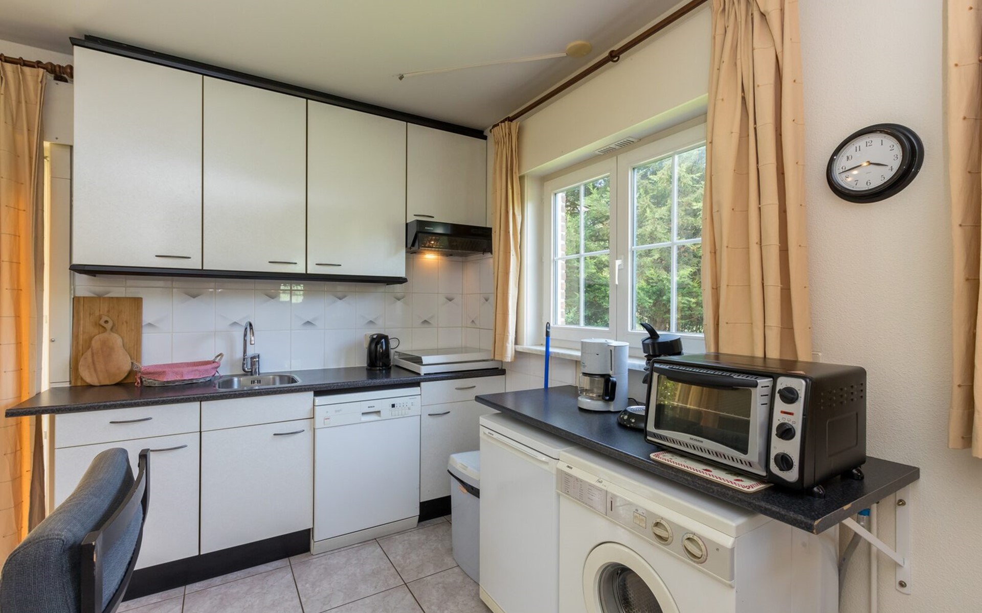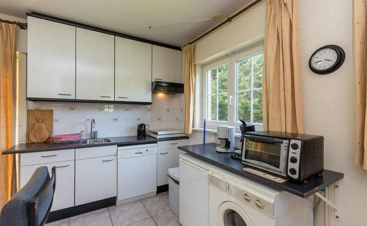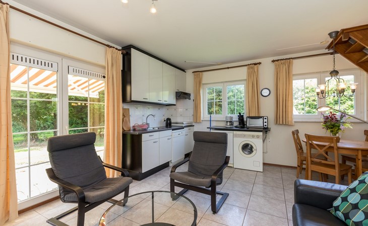 Gemütliches Apartment für 4 Personen mit einem geräumigen Sitzbereich mit Türen zum großen Garten, einem Essbereich und einer Küche. Von diesem Raum ist das 2-Personen-Schlafzimmer im Obergeschoss (mit Waschbecken) und das 2-Personen-Schlafzimmer im Erdgeschoss zugänglich. Das Badezimmer mit Toilette, Waschbecken und Toilette befindet sich im Erdgeschoss. Die Küche ist komplett ausgestattet mit Waschmaschine, Filter Kaffeemachine, Geschirrspüler, Nespresso und kleinem Backofen. Ein Babybett, Hochstuhl und Treppengitter sind vorhanden.