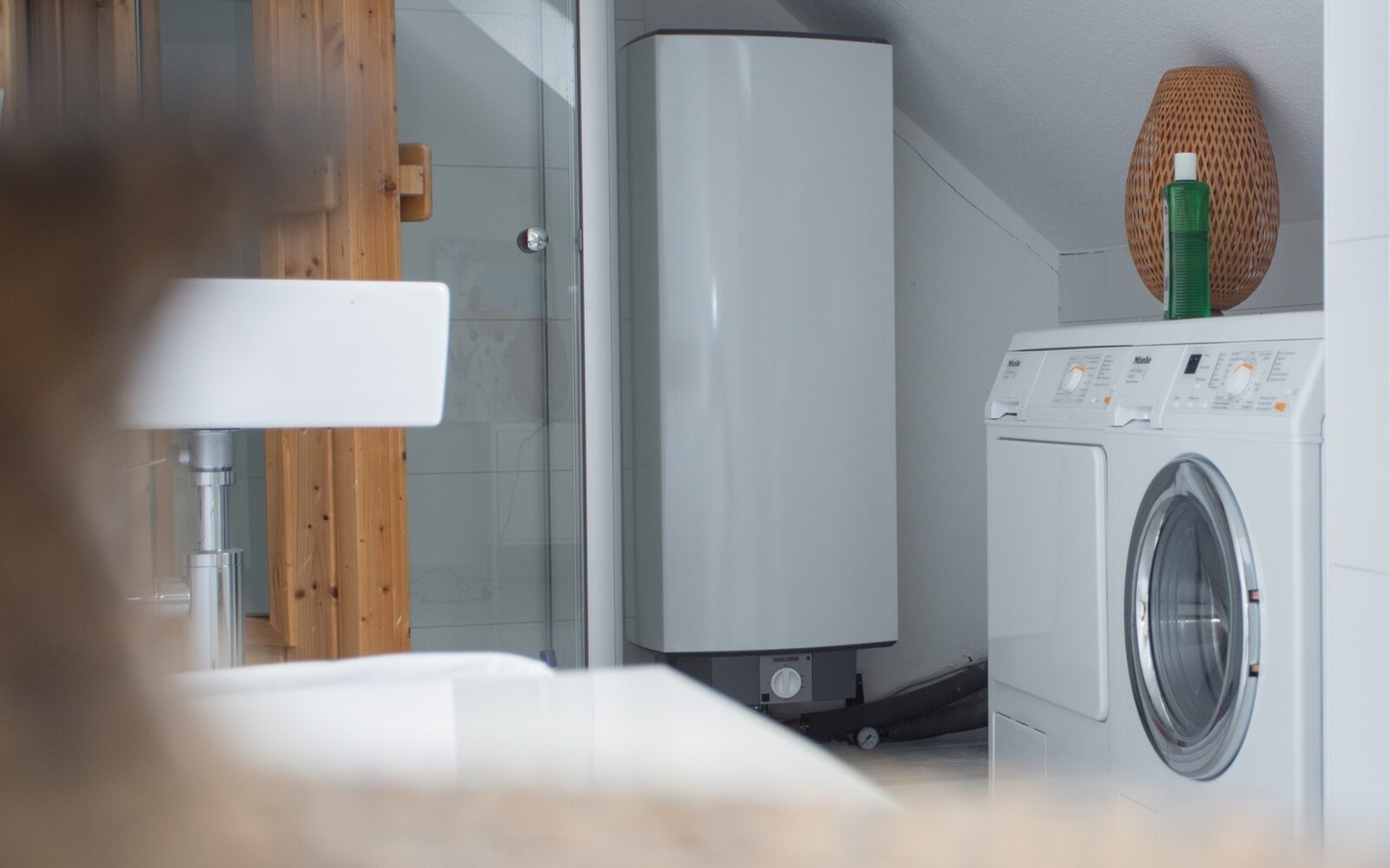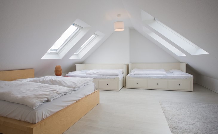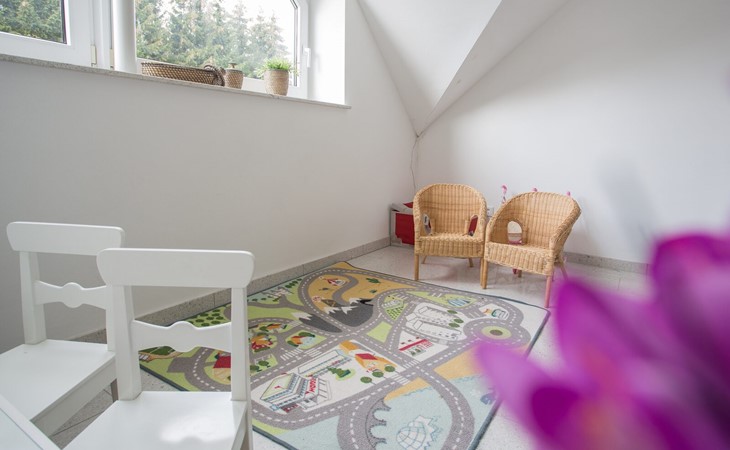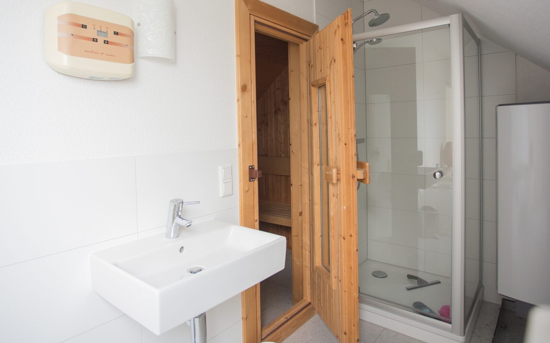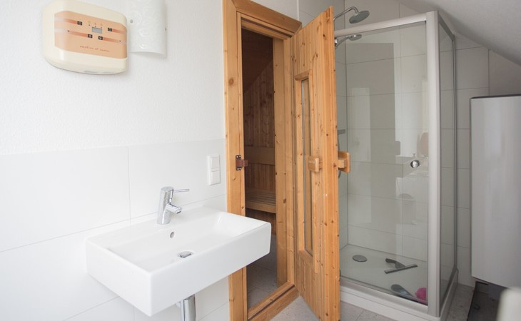 Im zweiten Stock befindet sich die Sauna mit Dusche. Waschmaschine und Trockner sind vorhanden. Hier gibt es ein weiteres geräumiges Schlafzimmer mit drei Doppelbetten. Im Keller steht ein abschließbarer Ski- und Fahrradkeller zur Verfügung.
