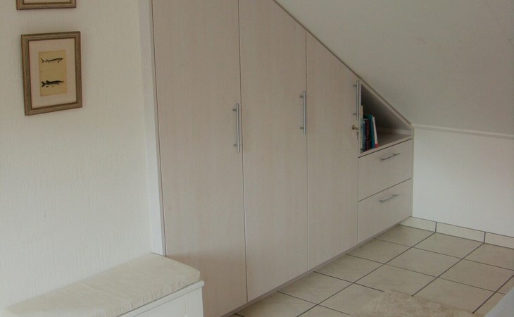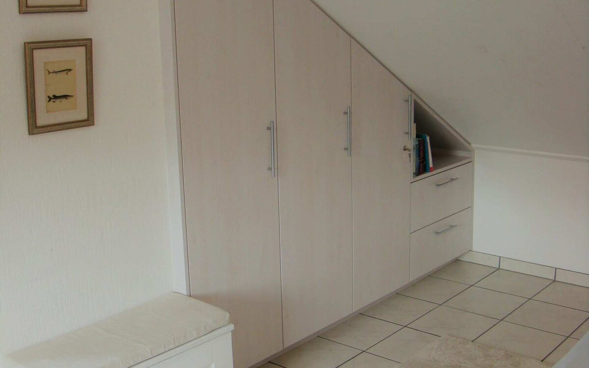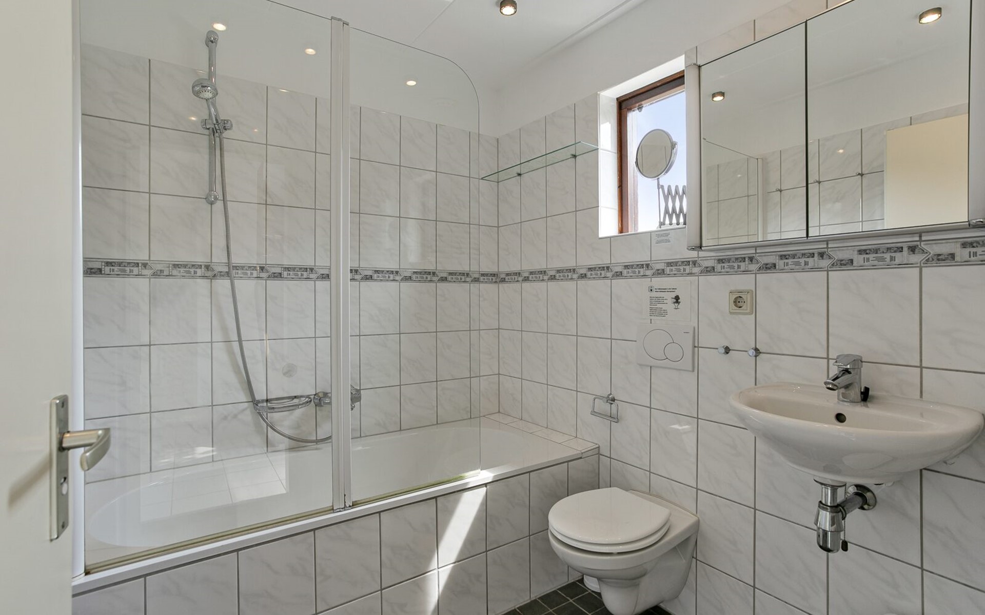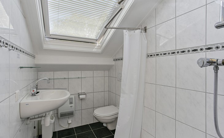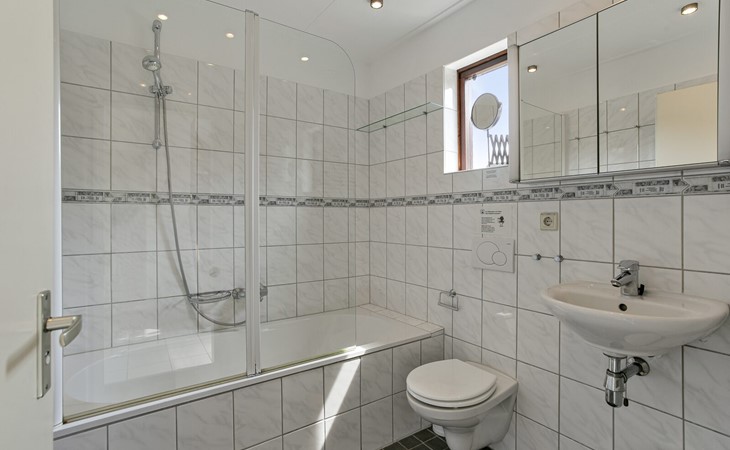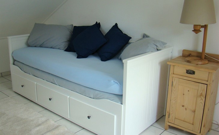 Wenn Sie das Haus durch den Haupteingang betreten, befindet sich gleich rechts das Badezimmer mit kombinierter Dusche/Badewanne, Toilette und Waschbecken. Allen Gästen, denen das Treppensteigen nicht mehr so leichtfällt, bietet das angrenzende Schlafzimmer, ausgestattet mit einem Doppelbett 160 x 200 cm, einen hohen Komfort.