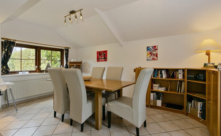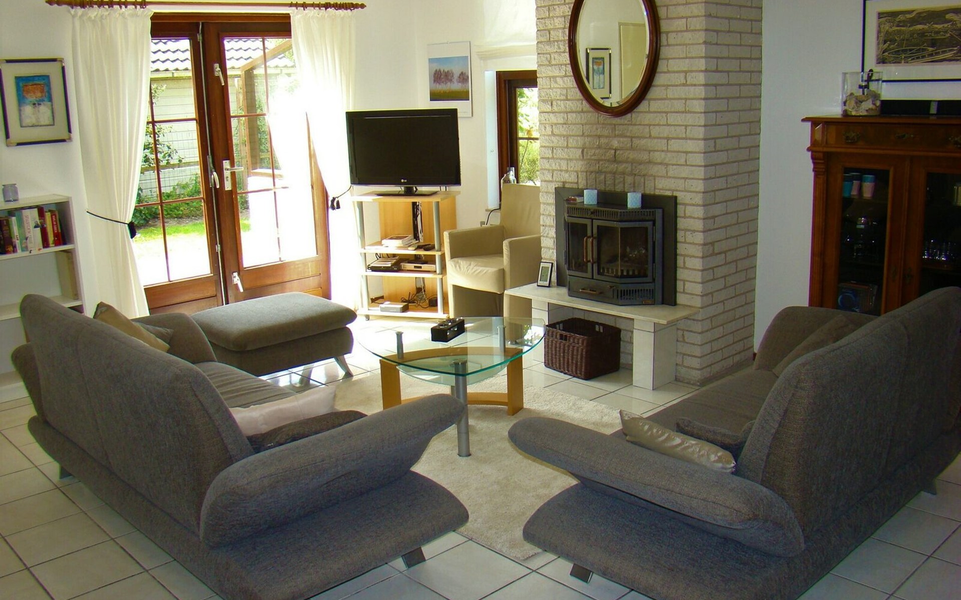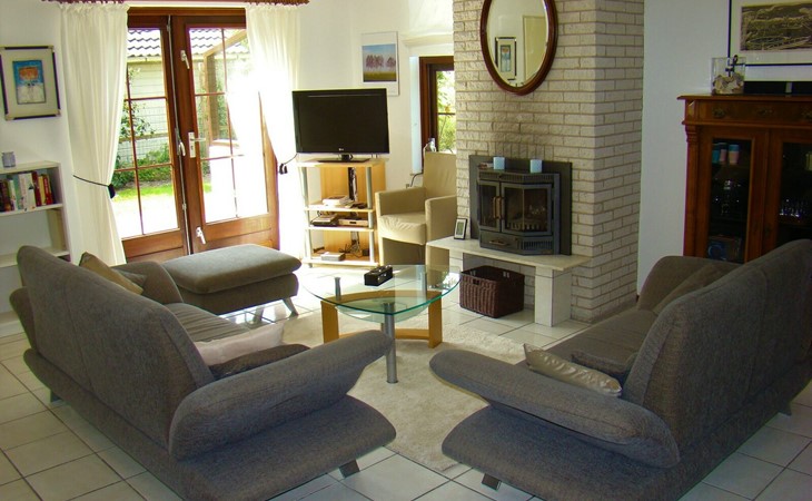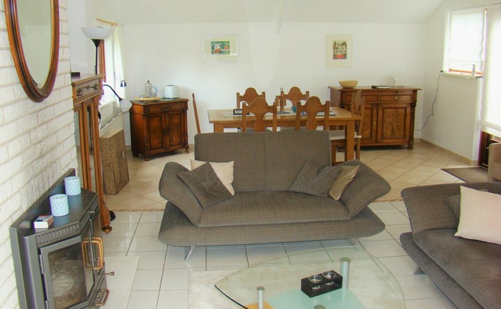Vom Flur gelangen Sie auch in den grosszügigen Wohn-/Esszimmerbereich. Gemütliches zusammensitzen in den 2 bequemen Stoffsofas, dem Flammenspiel im Holz-Kamin zusehen und dabei die wohltuende Wärme spüren, also einfach Entspannung erleben! Der große Esstisch bietet Platz für 6 Personen. In der relativ kleinen halboffenen Küche finden Sie dennoch alles, um ein köstliches Mahl zuzubereiten. Ein zusätzlicher Kühlschrank finden Sie in einem kleinen Nebenraum.