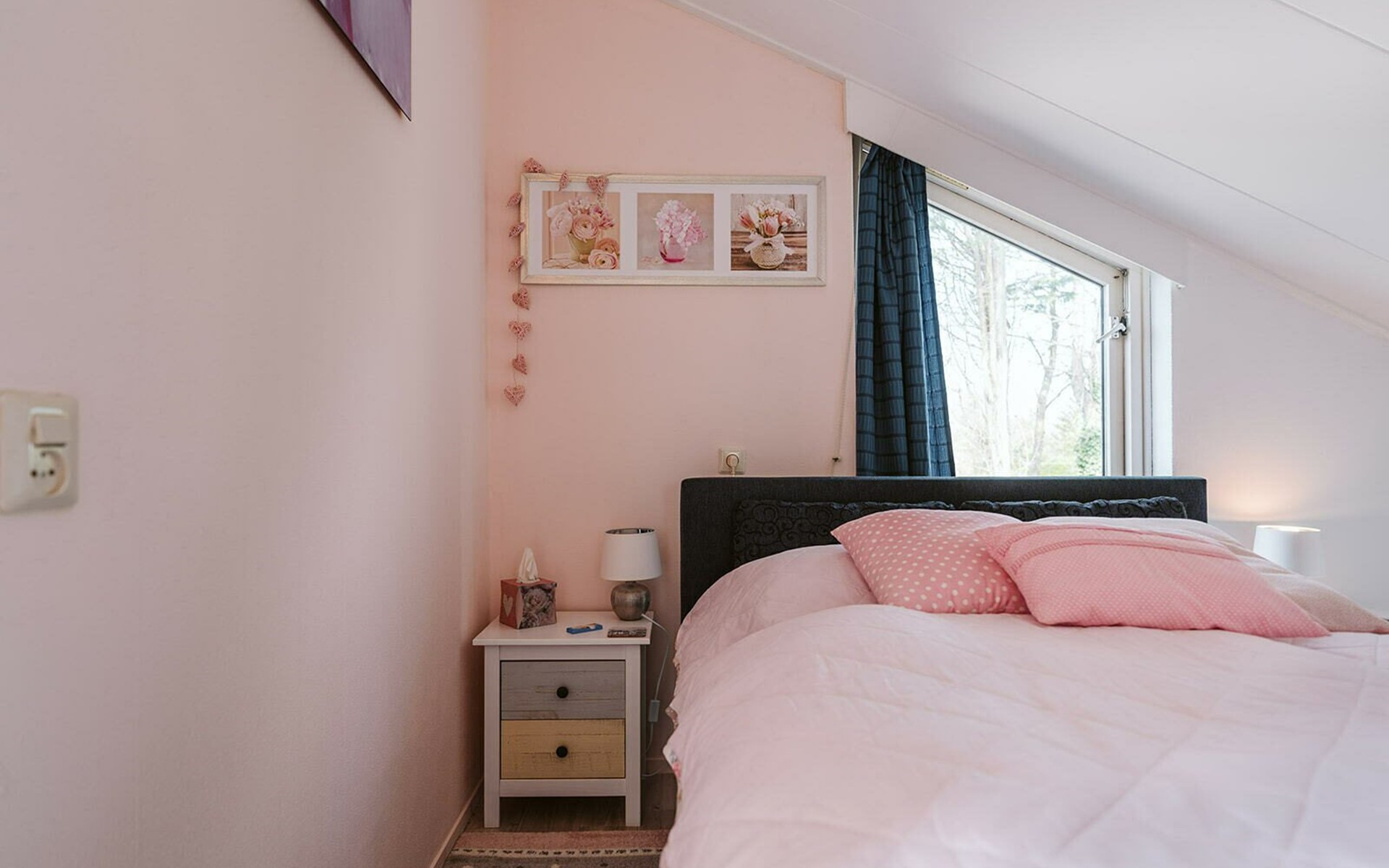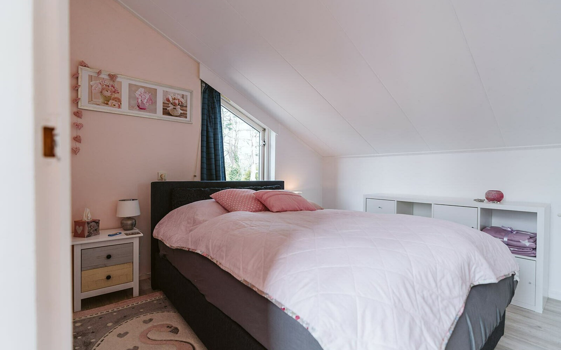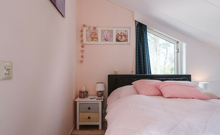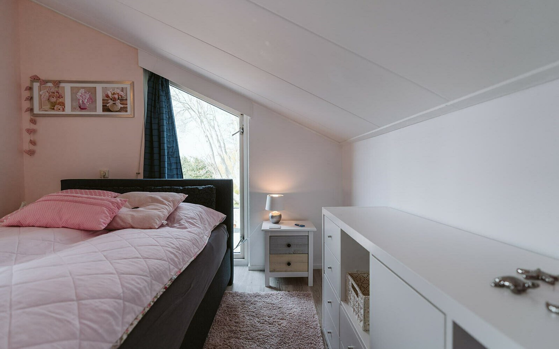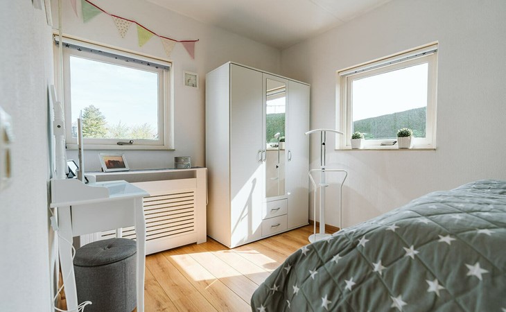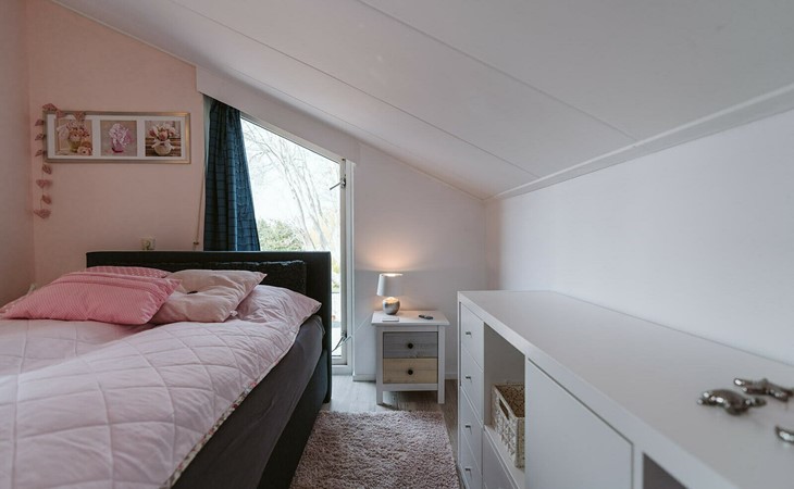 Im Obergeschoss finden 2 weitere Personen in einem Schlafraum, ausgestattet mit einem Doppel-Box-Springbett 140 x 200 cm, ihre wohlverdiente Nachtruhe.