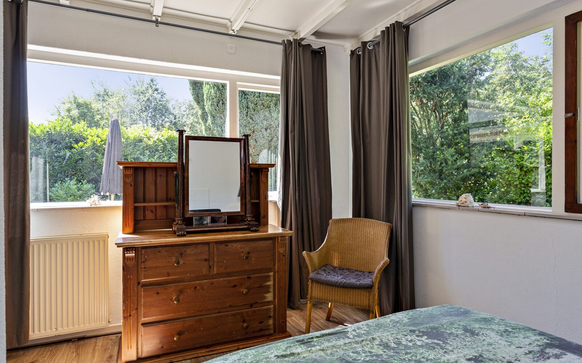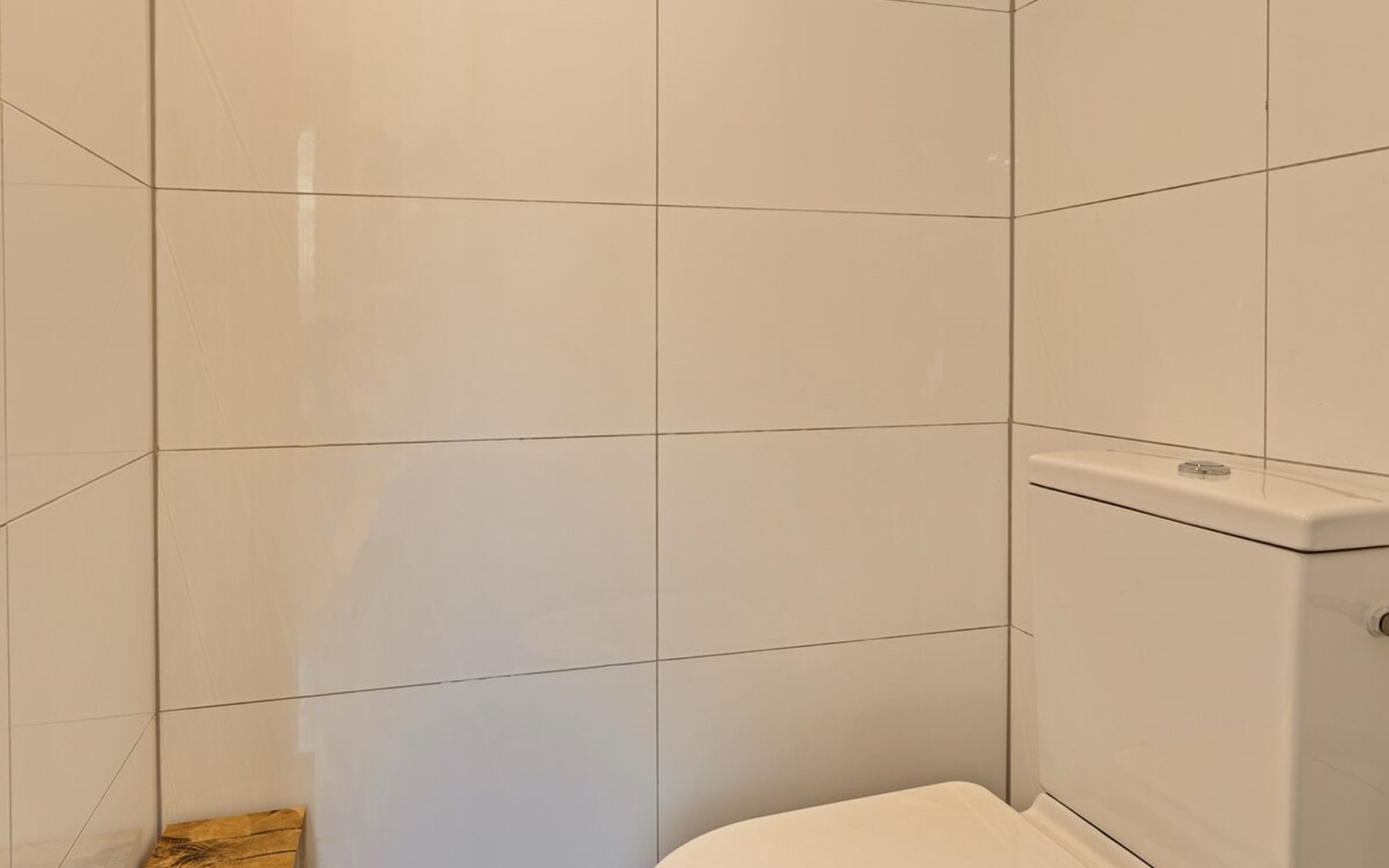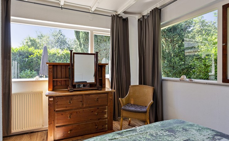 Auf dem Weg durch den Hausflur zu den 2 Schlafzimmern, ausgestattet mit je einem Doppel-Box-Springbett 140 x 200 cm, finden Sie auch die separate Toilette und das kleine Badezimmer mit bodengleicher Dusche und Waschbecken.