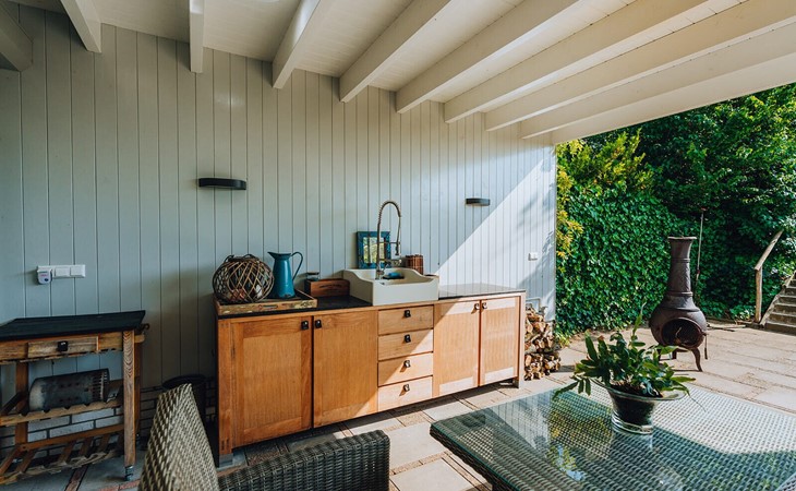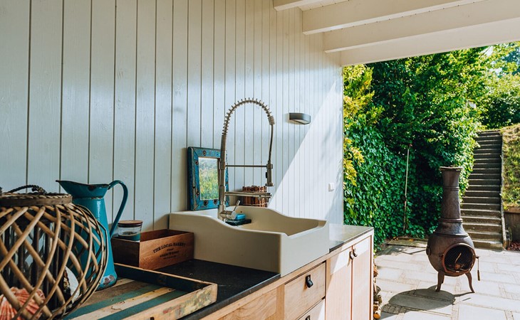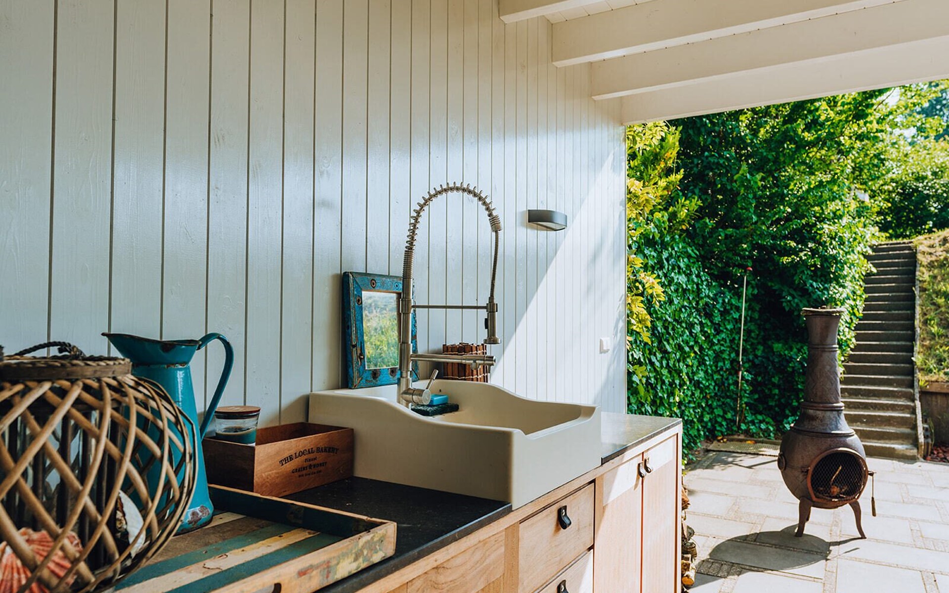 Bei der Hauseinteilung wurde eine separate Toilette mit Handwaschbecken und das Badezimmer mit ebenerdiger Dusche und Waschbecken, im Eingangsbereich geplant. Eine weitere Tür führt Sie in den Koch-/Essbereich. Durch eine sehr gut ausgestattete offene Küche haben sie die Möglichkeit, jederzeit schnell und unkompliziert ihre Mahlzeiten zuzubereiten und diese dann am runden Esstisch zu genießen. Um den Geschirrspüler danach zu füllen, geht es dann in die Nebenküche, die im Freien direkt neben dem Haupteingang erreichbar ist.