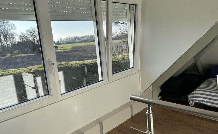 Eine offene Wendeltreppe führt in das Obergeschoss, wo sich 2 Schlafzimmer befinden: ein Schlafzimmer mit 2 Betten 90 x 2.00 und ein Schlafzimmer mit einem Bett 90 x 2.00.