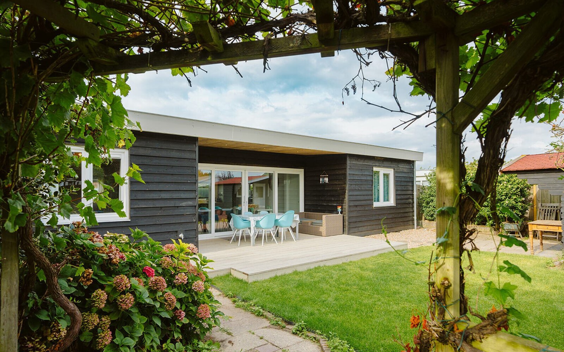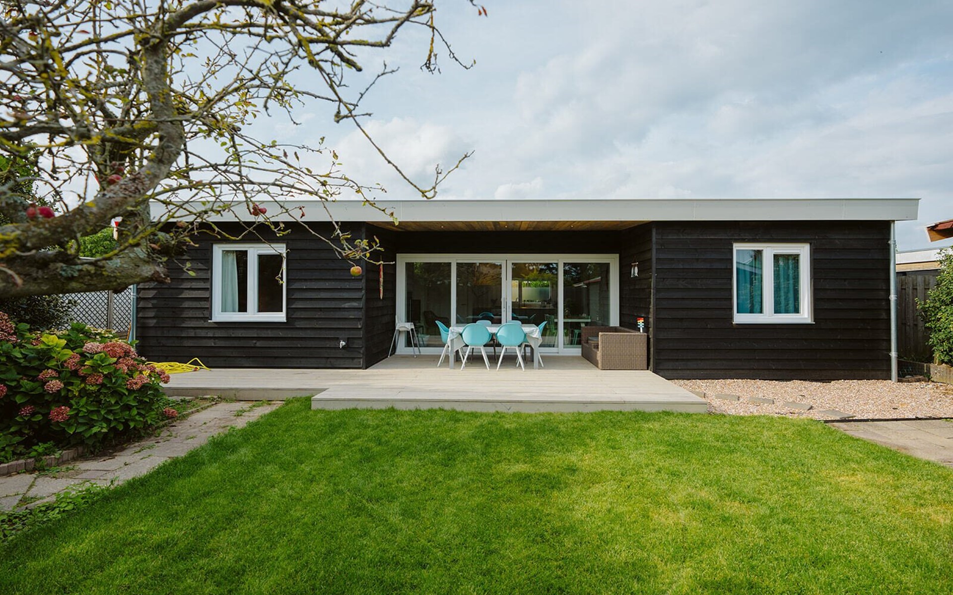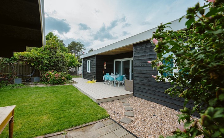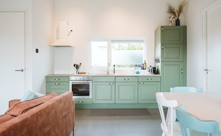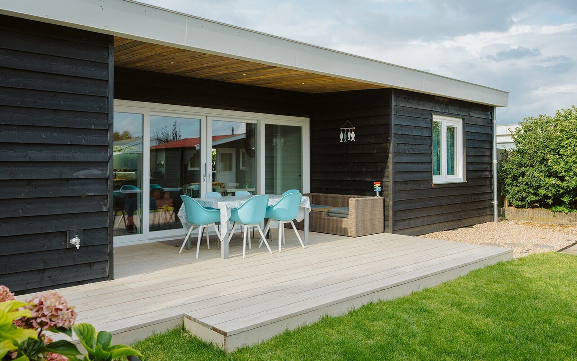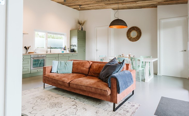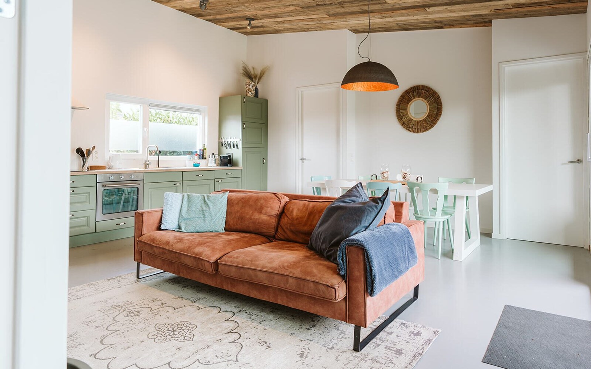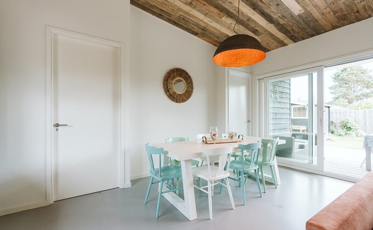 Sie betreten den Bungalow von der überdachten Terrasse direkt in den geräumigen Wohn-/Essbereich. Freuen Sie sich auf eine trendige Einrichtung mit bequemem Sofa und großem Esstisch. Die offene Küche bietet alles, was man für die Zubereitung einer leckeren Mahlzeit braucht.
