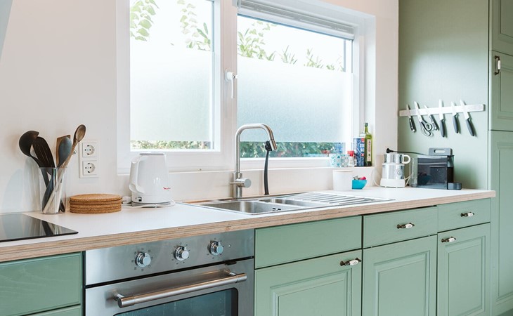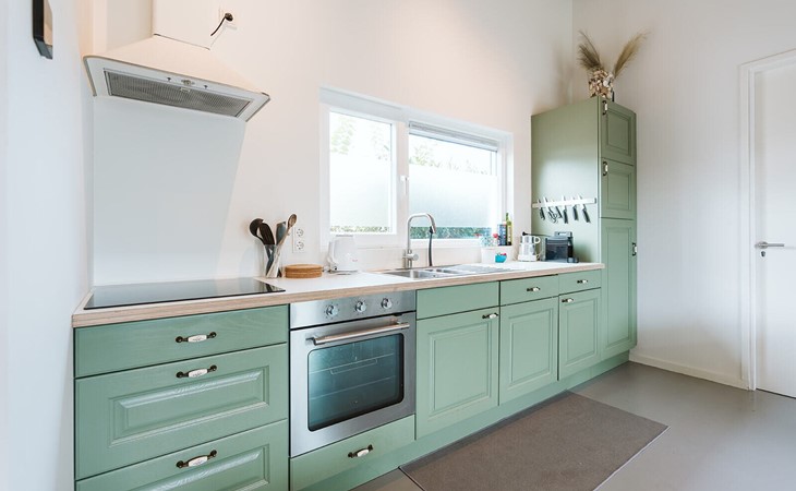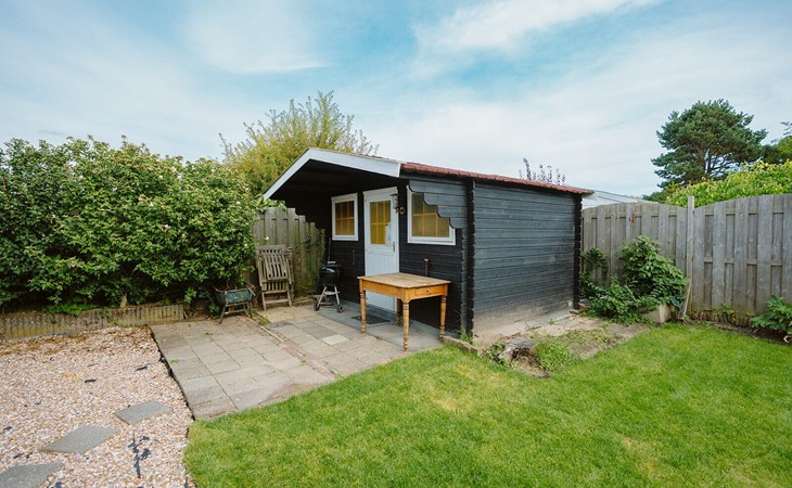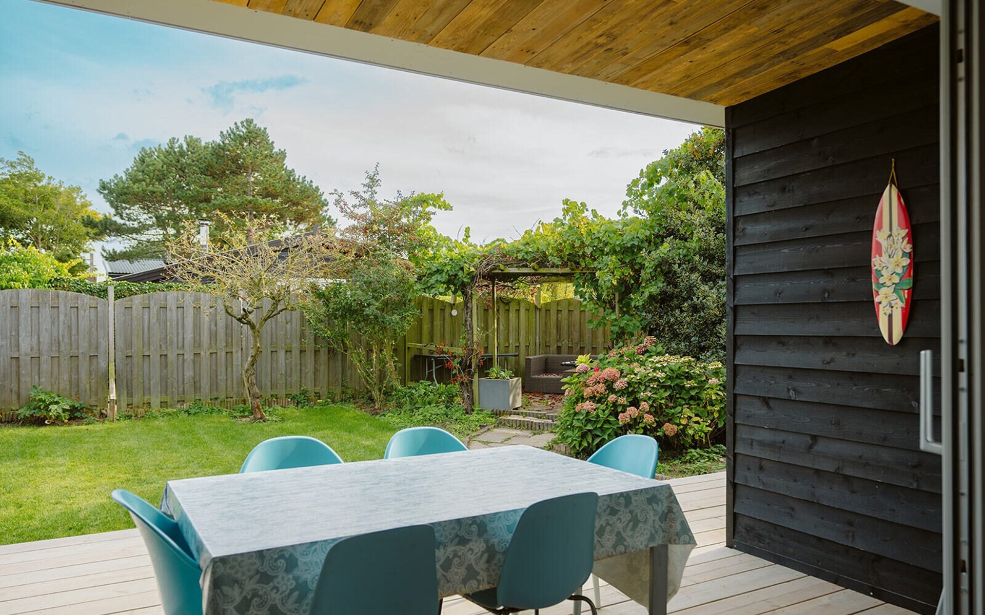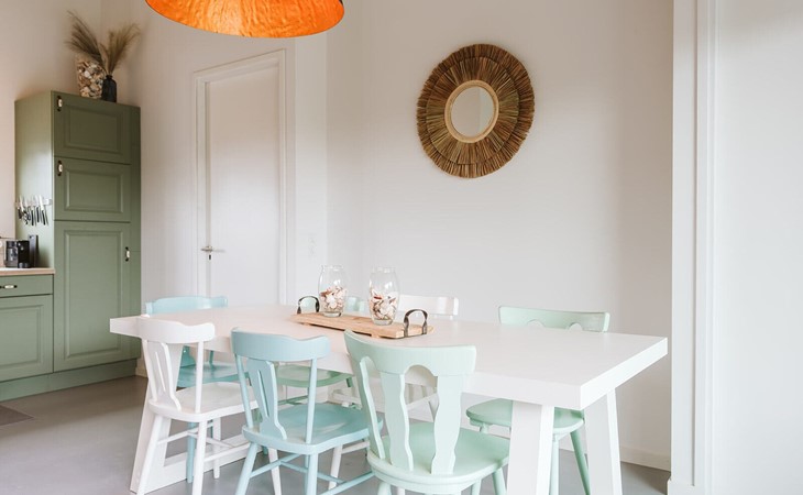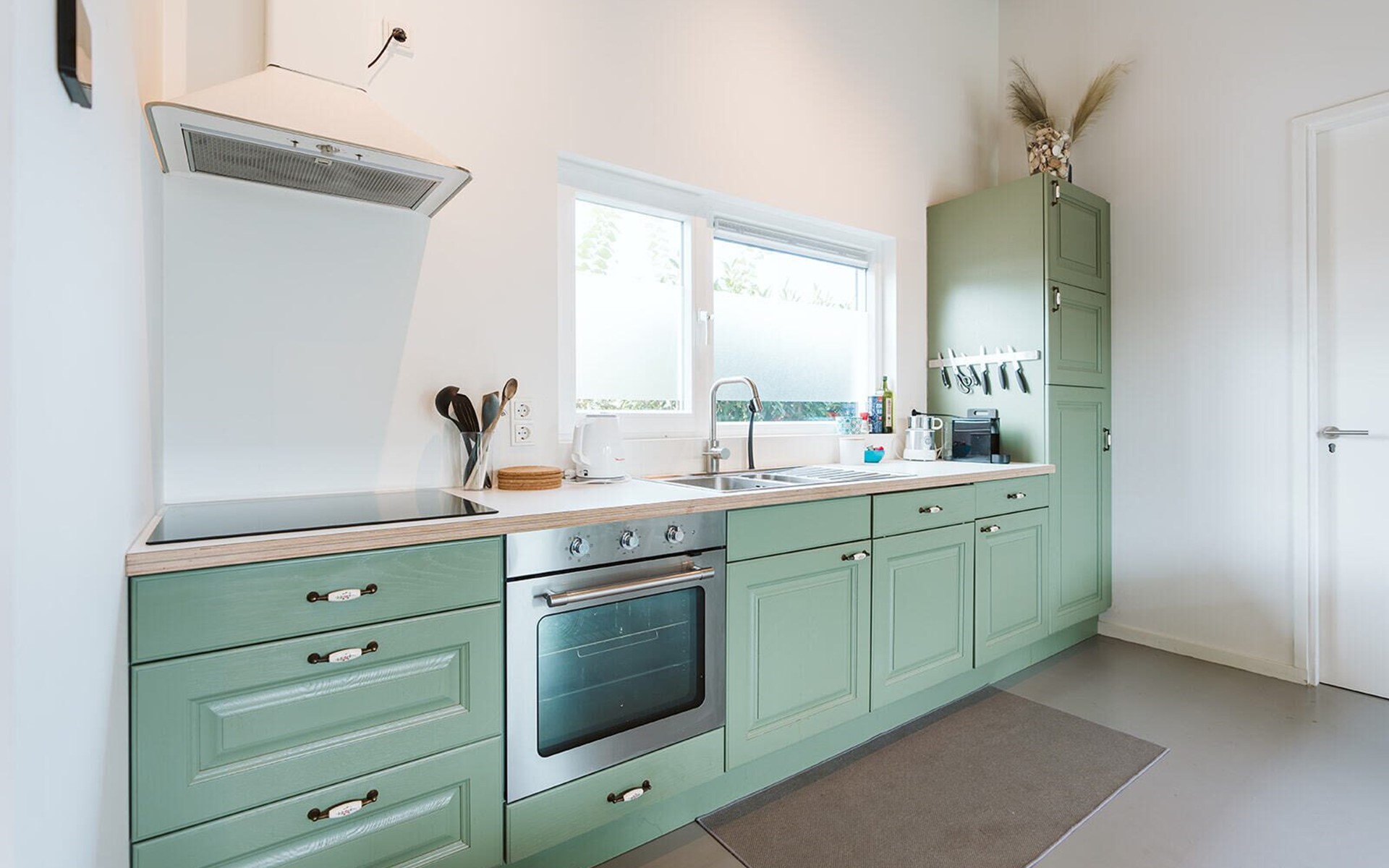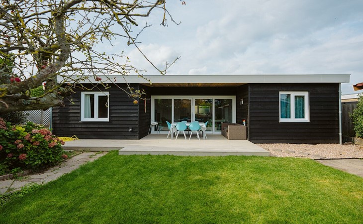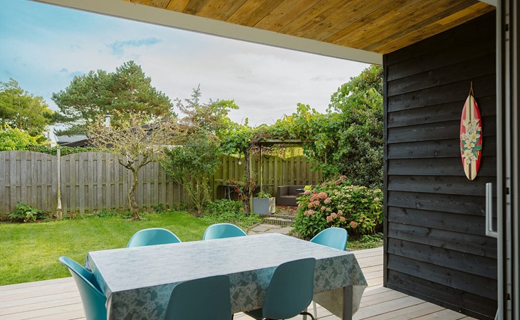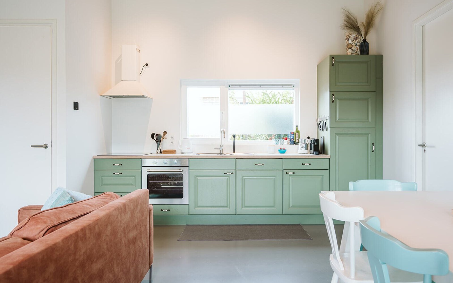 Sie betreten den Bungalow von der überdachten Terrasse direkt in den geräumigen Wohn-/Essbereich. Freuen Sie sich auf eine trendige Einrichtung mit bequemem Sofa und großem Esstisch. Die offene Küche bietet alles, was man für die Zubereitung einer leckeren Mahlzeit braucht.
