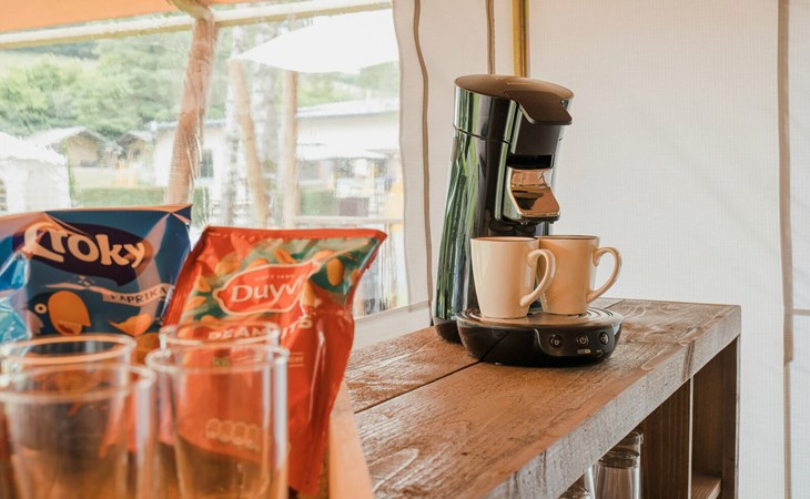 Im Lodgezelt finden Sie einen geräumigen und gemütlichen Wohnbereich mit Kochgelegenheit. Die Küche ist komplett ausgestattet und verfügt unter anderem über eine Kaffeemaschine, eine Mikrowelle, Kochutensilien und einen Kühlschrank mit Gefrierfach. Das Lodgezelt verfügt über zwei Schlafzimmer, eines mit einem Doppelbett und eines mit einem Etagenbett und einem Einzelbett. Es gibt auch eine Heizung, damit Sie bei etwas kälterem Wetter warm sitzen können.