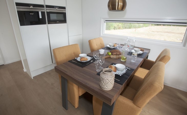 Dieses atemberaubende 65 m² große L-förmige Ferienhaus ist mit allen Annehmlichkeiten ausgestattet: Badezimmer mit Waschbecken, bodengleiche Dusche und Toilette sowie eine weitere separate Toilette. Kochen wird zum Vergnügen in der Luxusküche mit Kochbereich, kombinierter Mikrowelle, Geschirrspüler und Kühlschrank mit Gefrierfach. In den Wintermonaten können Sie im geräumigen und hellen Wohnzimmer mit Blick auf das Feuer im Gaskamin entspannen. Im Sommer genießen Sie die große gekachelte Terrasse.