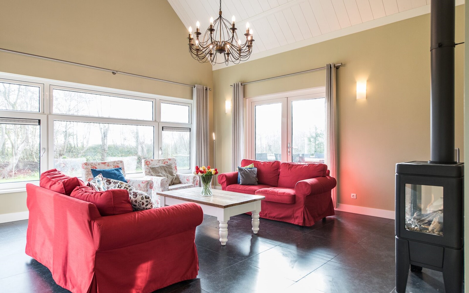 Es gibt ein helles, geräumiges Wohnzimmer mit Sitzecke, Flachbild-Smart-TV und Gaskamin.