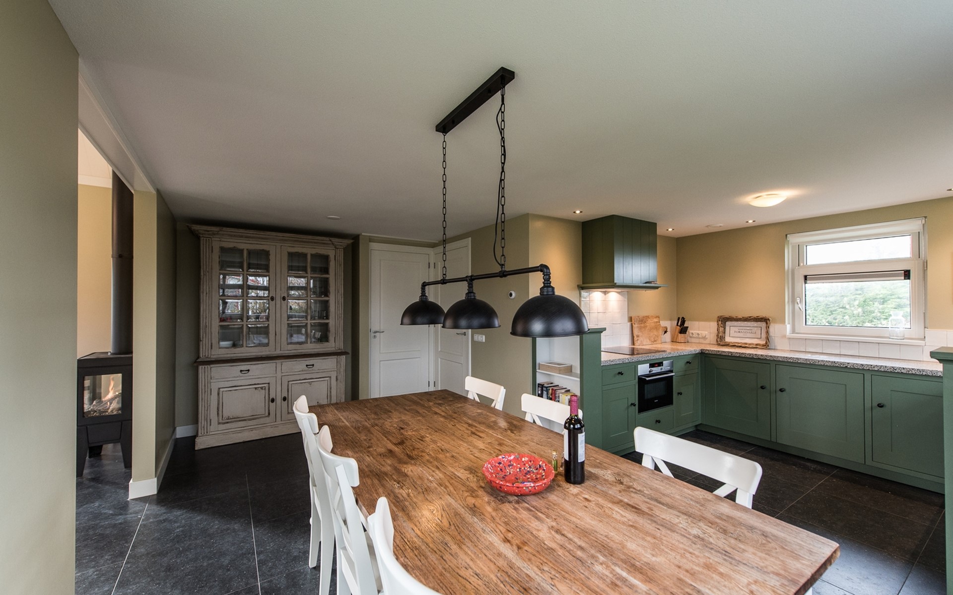 Die offene Küche mit großem Esstisch ist mit Geschirrspüler, Kombibackofen mit Mikrowelle, Kühlschrank und separatem Gefrierfach ausgestattet.