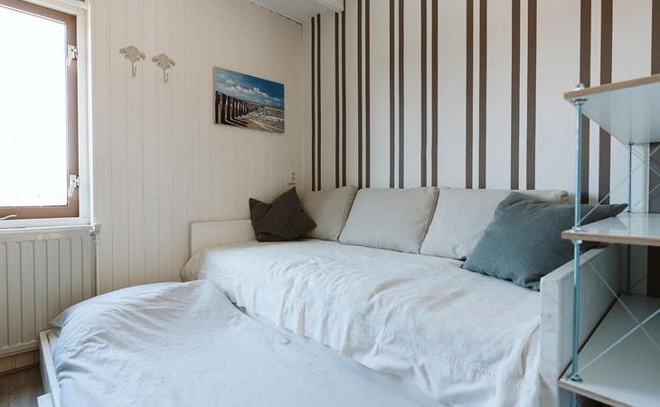 Ausgehend vom Wohnzimmer finden Sie auch die beiden Schlafräume. Das große Zimmer ist ausgestattet mit einem Doppelbett 180 x 200cm. Im kleinen Zimmer befindet sich ein Ausziehbett 1 x 90 x 200 cm u. 1 x 80 x 200 cm und der Fernseher (Kein Fernseher im Wohnzimmer, aber Sie können den Fernseher ins Wohnzimmer rollen!). Bei einer Nutzung des zweiten Bettes wird es sehr eng in diesem Raum! Pelletofen kann nicht verwendet werden.