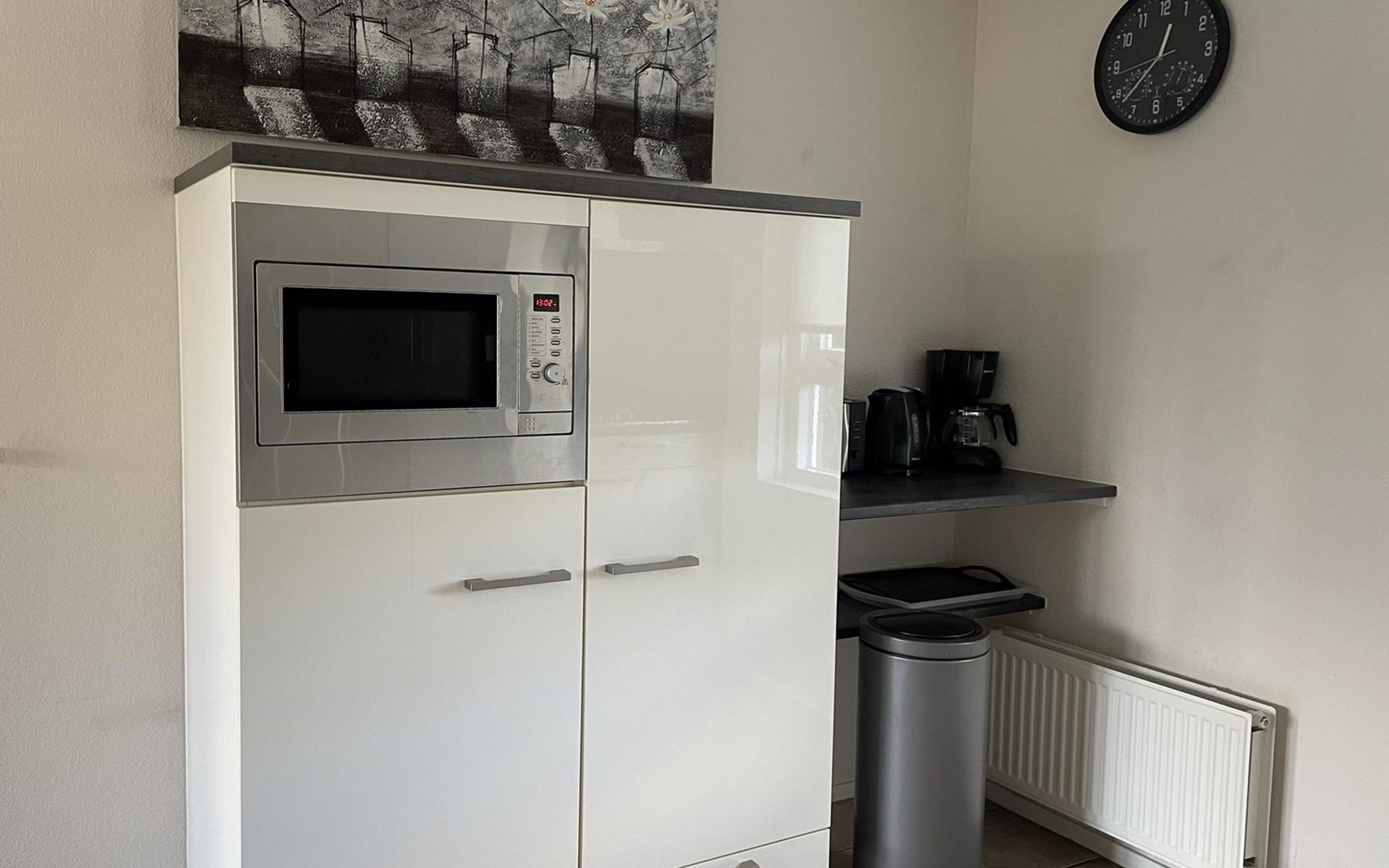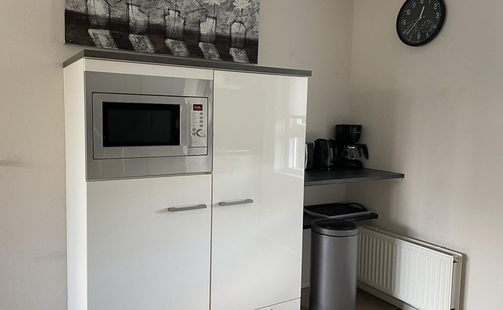 Die offene Küche verfügt über eine Kühl-Gefrierkombination, eine Spülmaschine, einen Mikrowellen-Kombi-Herd oder Ofen, einen Gasherd, eine Kaffeemaschine (Filter) und einen Wasserkocher.