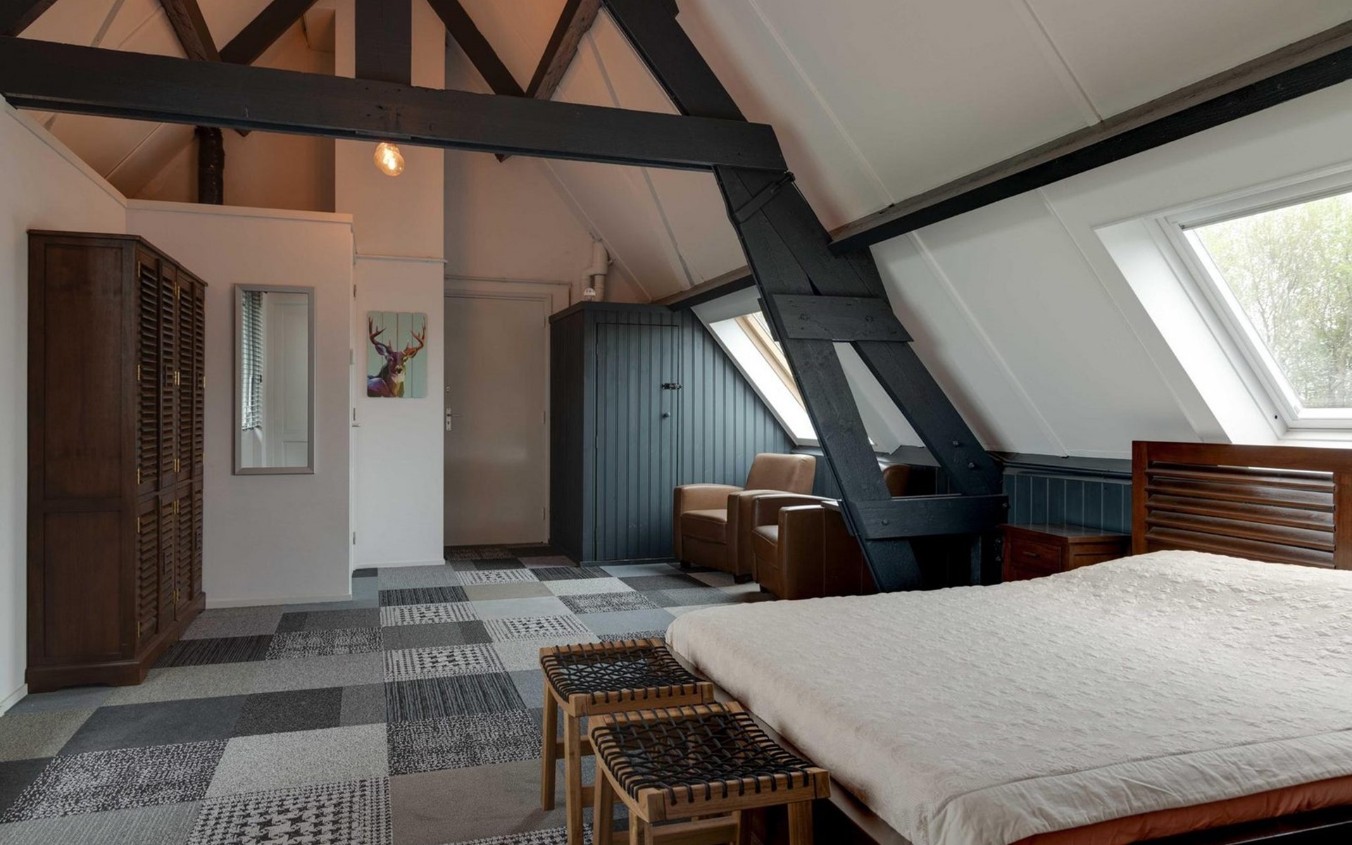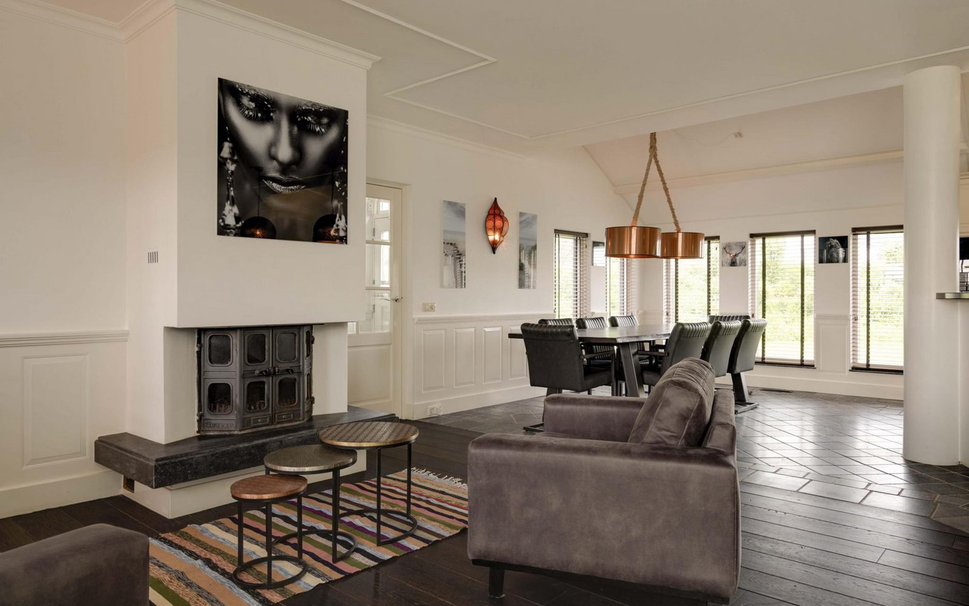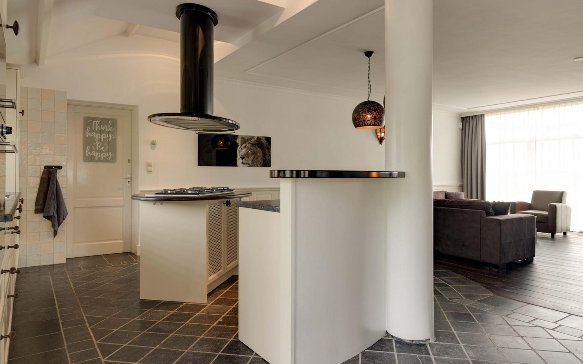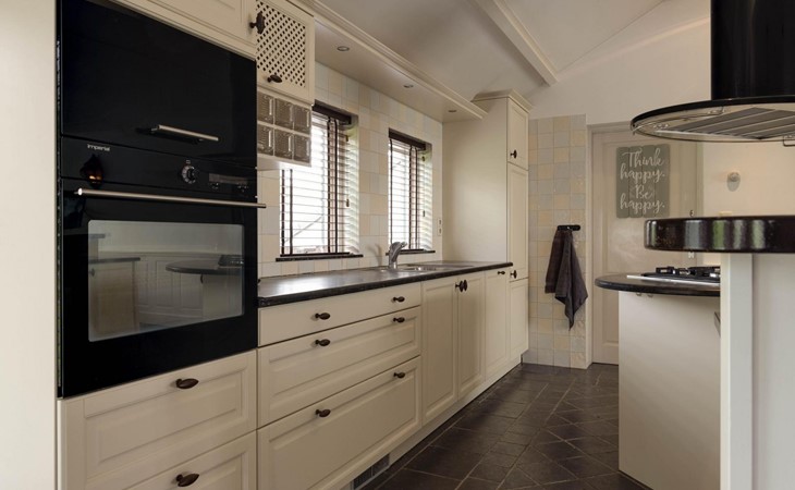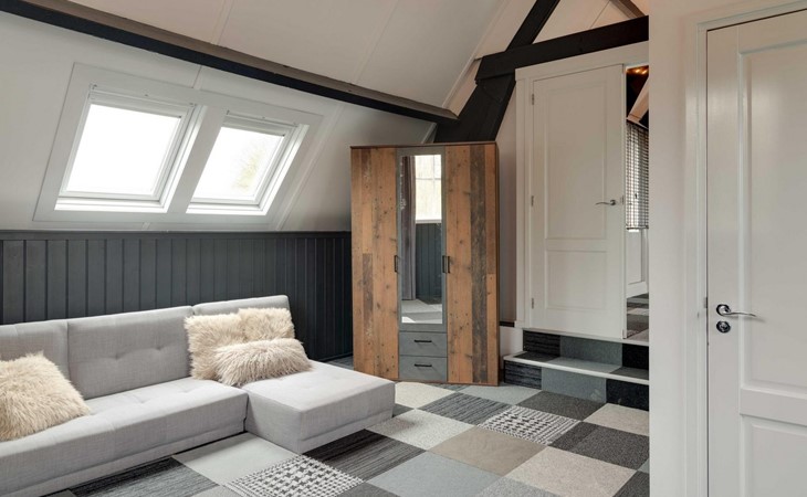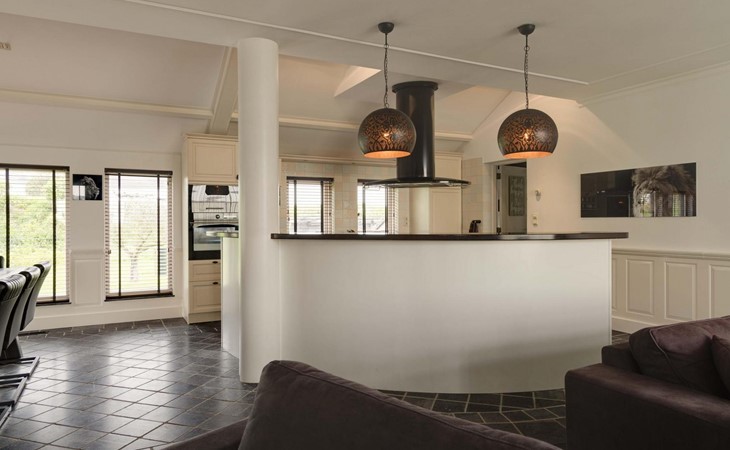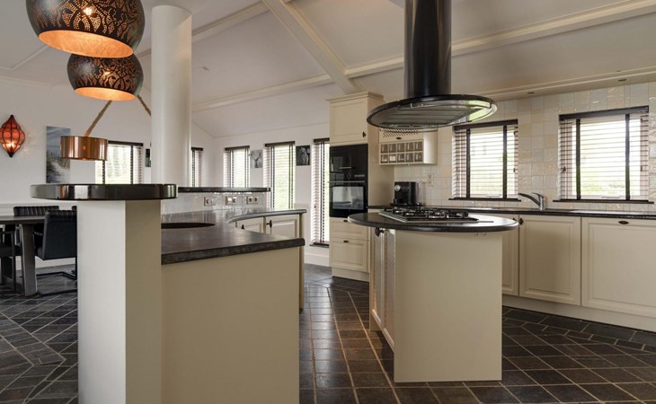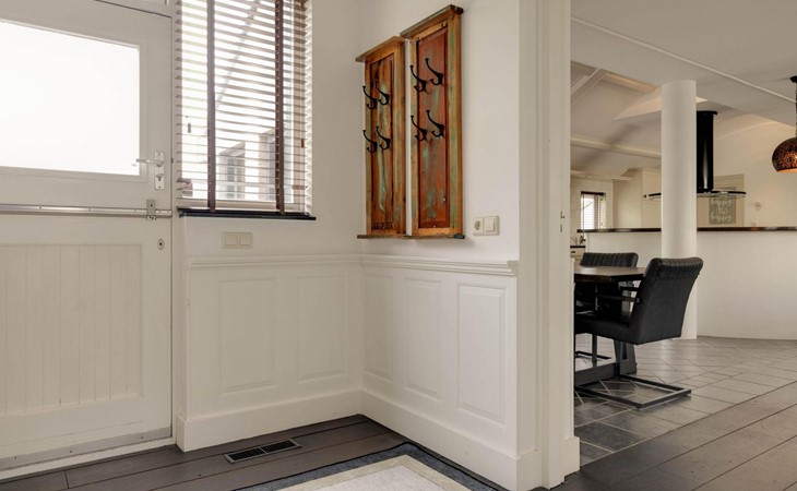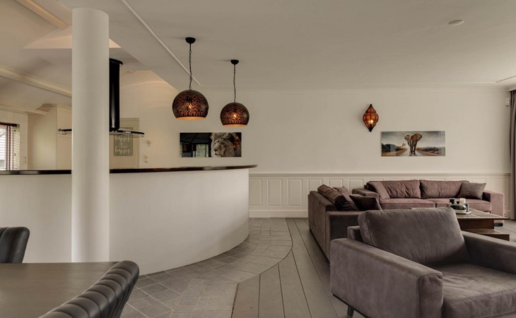 Die Eingangstür ist gleichzeitig der Zugang zum Garten auf der Südseite sowie in einen langen Flur. Von diesem führen weitere 5 Türen in verschiede Räume. So finden Sie ein Schlafzimmer mit Doppel-Box-Spring-Bett 180 x 200 cm und großem Fernseher. Daneben ist ein Badezimmer mit Dusche, Doppel-Waschbecken und Toilette sowie zusätzlich ein zweiter Toilettenraum mit WC, Wandurinal und Handwaschbecken. Eine weitere Tür führt in den Nord-Garten und die Fünfte in den komfortablen Wohn-/Essbereich. In der gigantischen, sehr gut ausgestatteten Küche mit Kochinsel und Stehbar, lassen sich köstliche Menüs für die ganze Belegschaft zubereiten, die dann gemeinsam am großen Esstisch genossen werden. Ebenfalls finden alle Platz in der sehr bequemen XXL-Polstergruppe für angeregt Diskussionen oder bei einem Film über Netflix mit ihrem eigenen Konto. Aber noch viel entspannter ist es einfach das lodernde Feuer im Kamin zu betrachten und dem Knistern des brennenden Holzes zu lauschen.