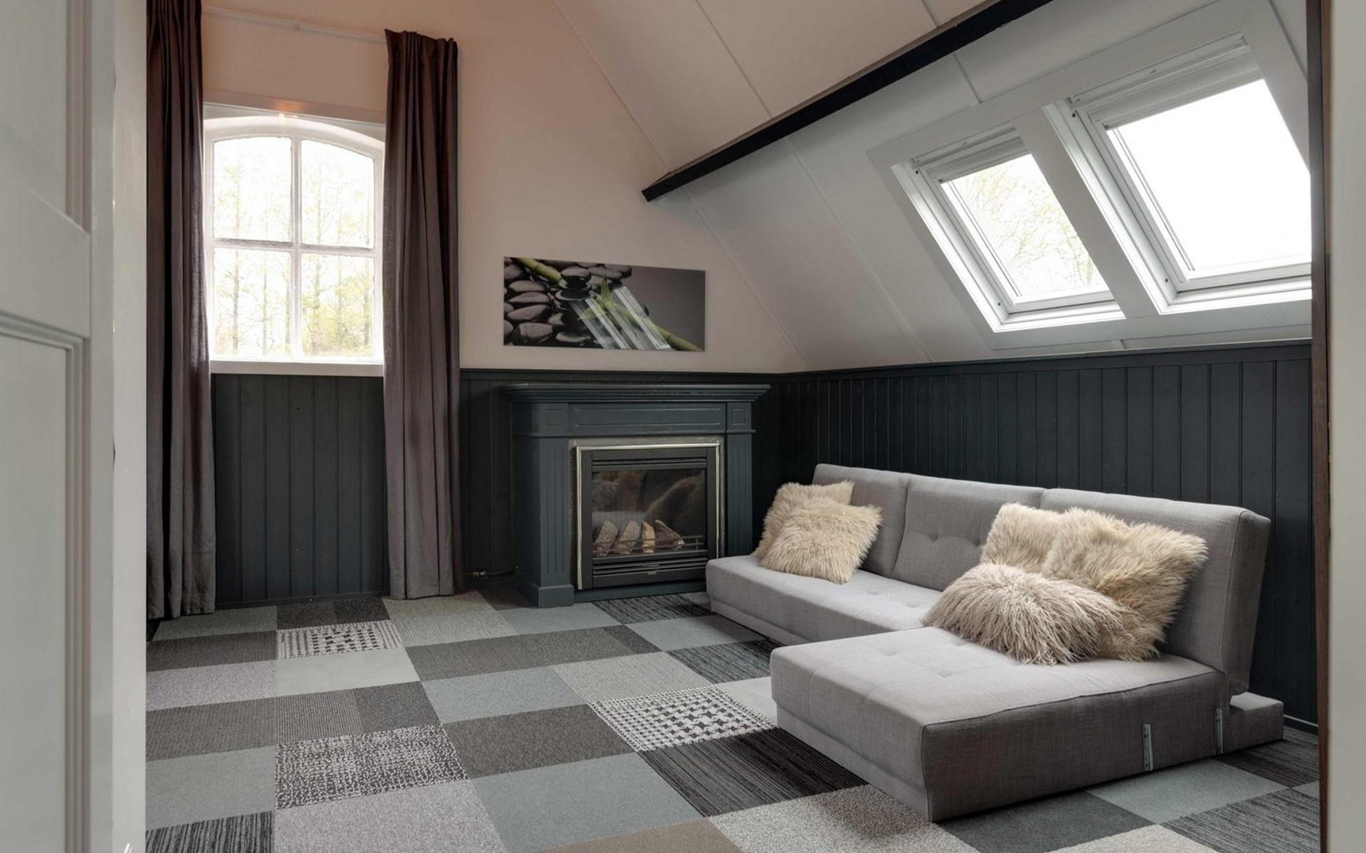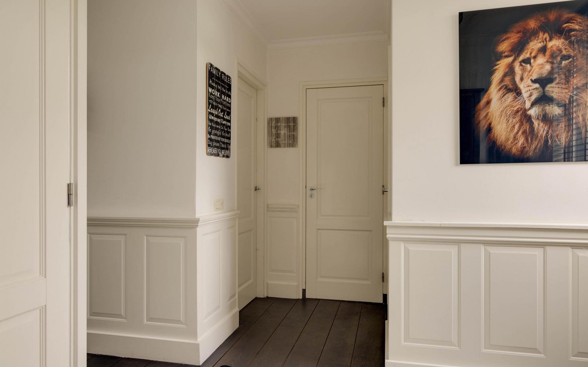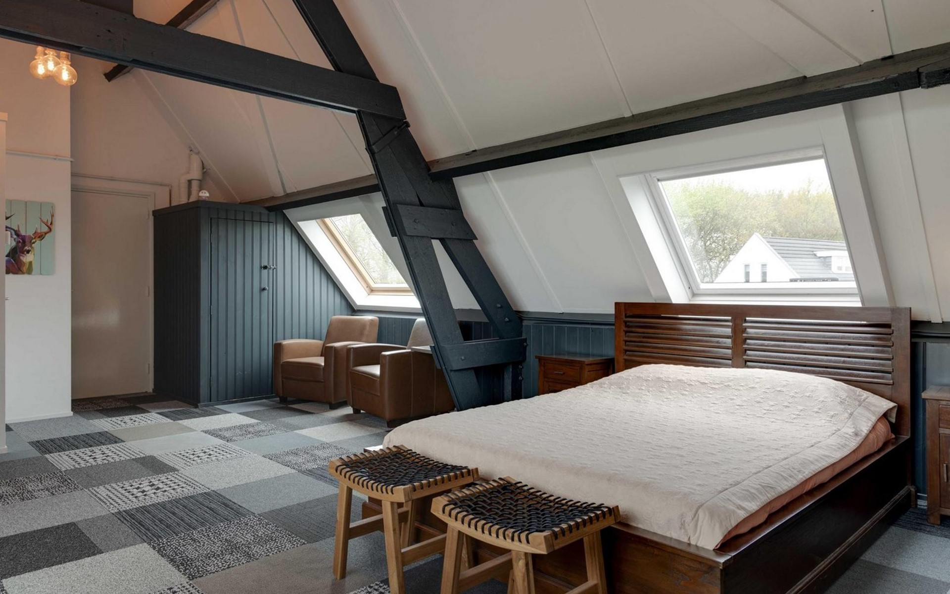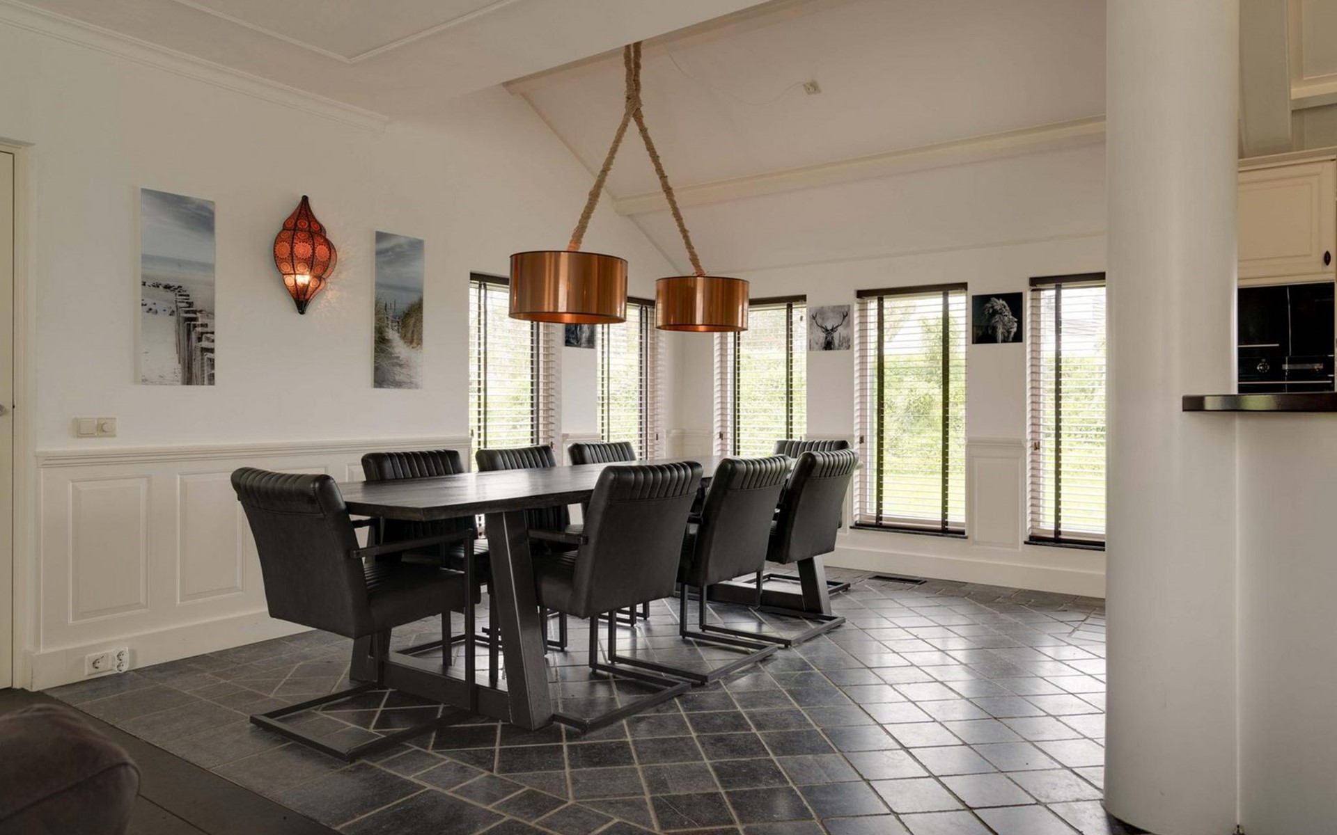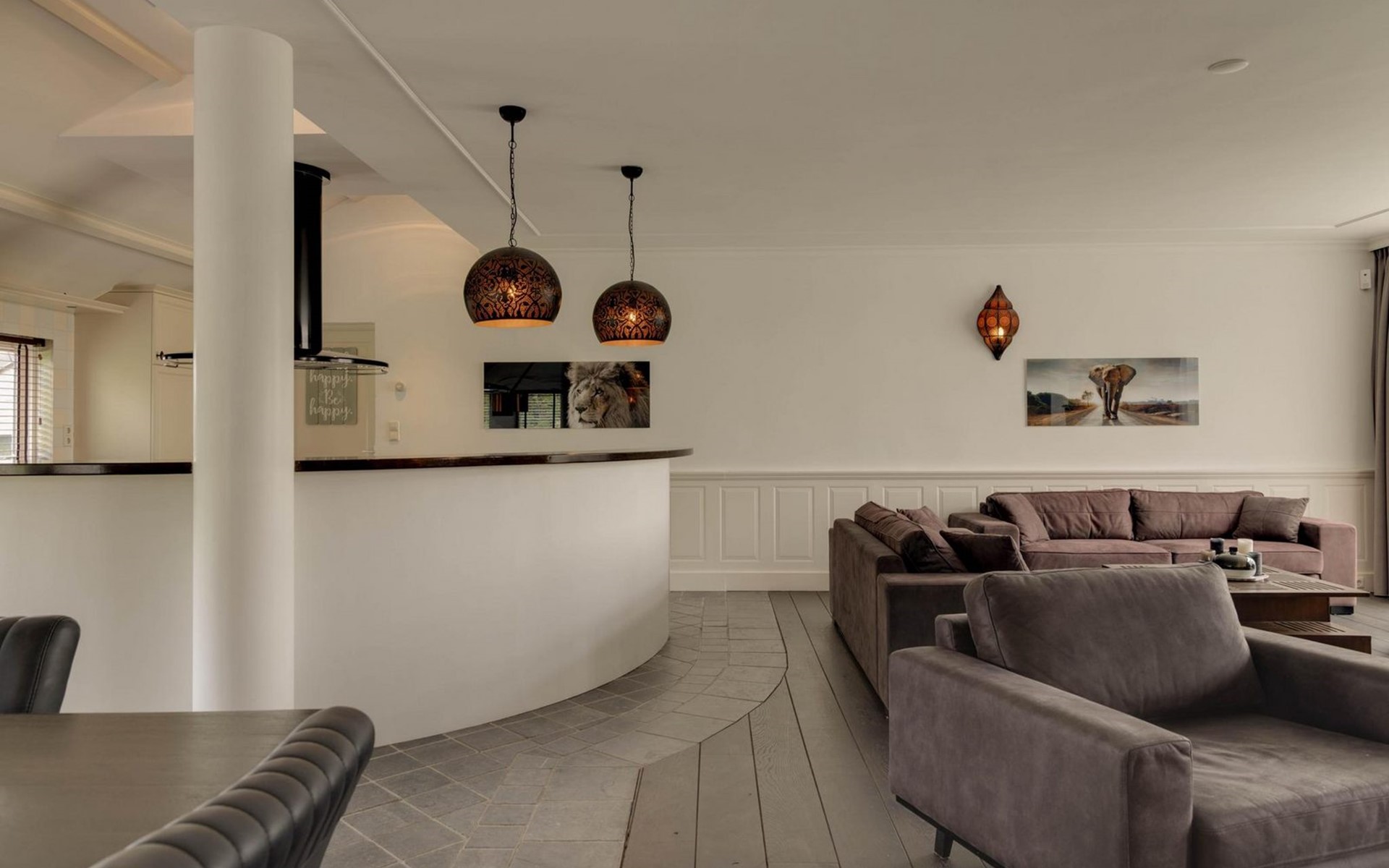 Die Eingangstür ist gleichzeitig der Zugang zum Garten auf der Südseite sowie in einen langen Flur. Von diesem führen weitere 5 Türen in verschiede Räume. So finden Sie ein Schlafzimmer mit Doppel-Box-Spring-Bett 180 x 200 cm und großem Fernseher. Daneben ist ein Badezimmer mit Dusche, Doppel-Waschbecken und Toilette sowie zusätzlich ein zweiter Toilettenraum mit WC, Wandurinal und Handwaschbecken. Eine weitere Tür führt in den Nord-Garten und die Fünfte in den komfortablen Wohn-/Essbereich. In der gigantischen, sehr gut ausgestatteten Küche mit Kochinsel und Stehbar, lassen sich köstliche Menüs für die ganze Belegschaft zubereiten, die dann gemeinsam am großen Esstisch genossen werden. Ebenfalls finden alle Platz in der sehr bequemen XXL-Polstergruppe für angeregt Diskussionen oder bei einem Film über Netflix mit ihrem eigenen Konto. Aber noch viel entspannter ist es einfach das lodernde Feuer im Kamin zu betrachten und dem Knistern des brennenden Holzes zu lauschen.