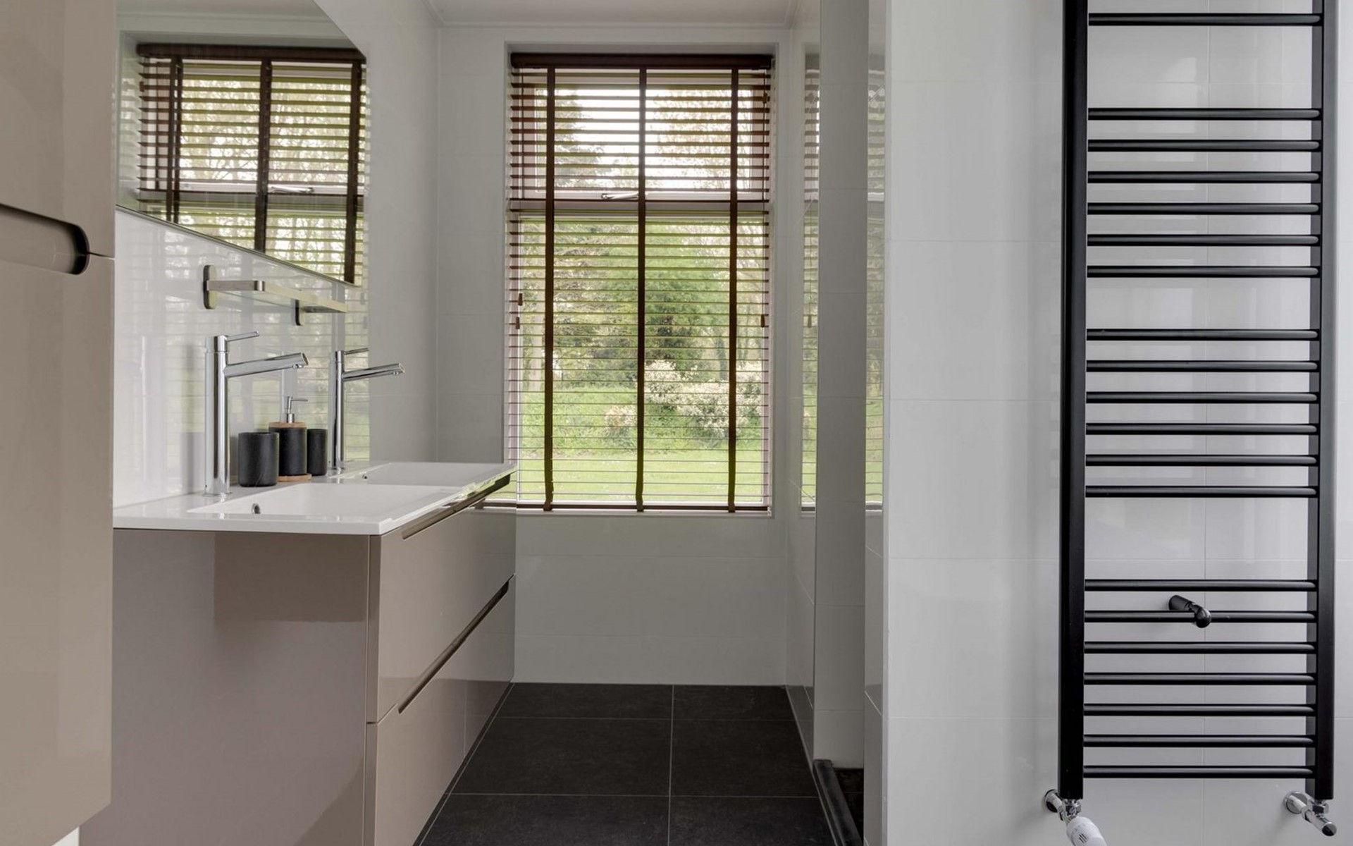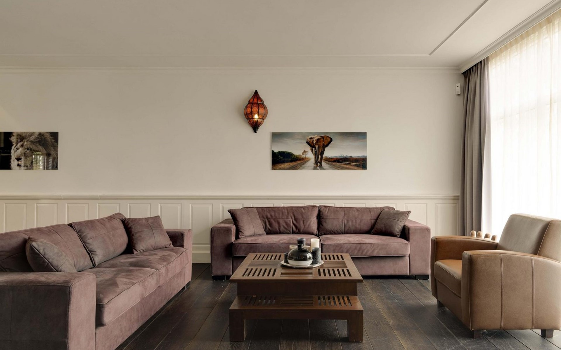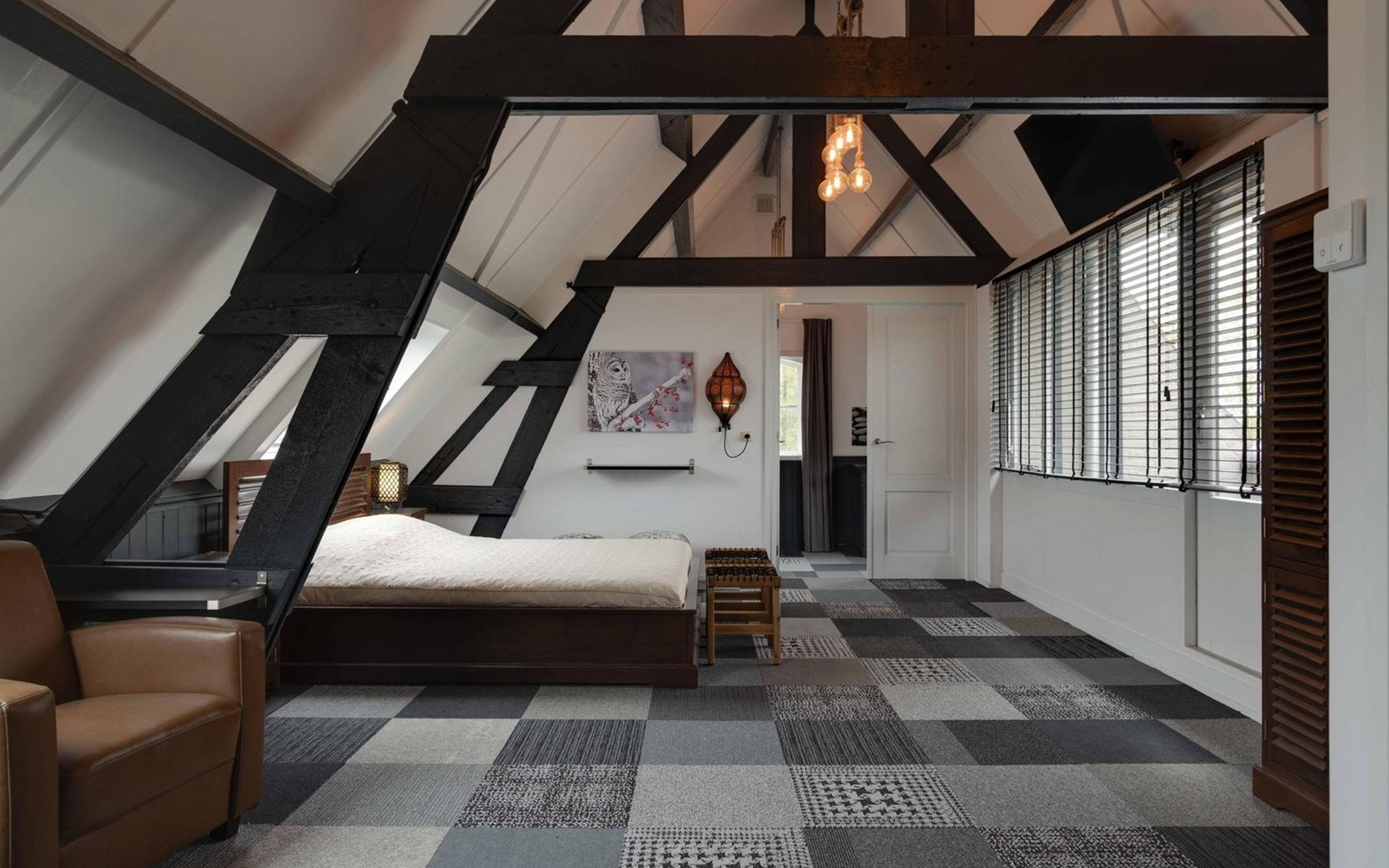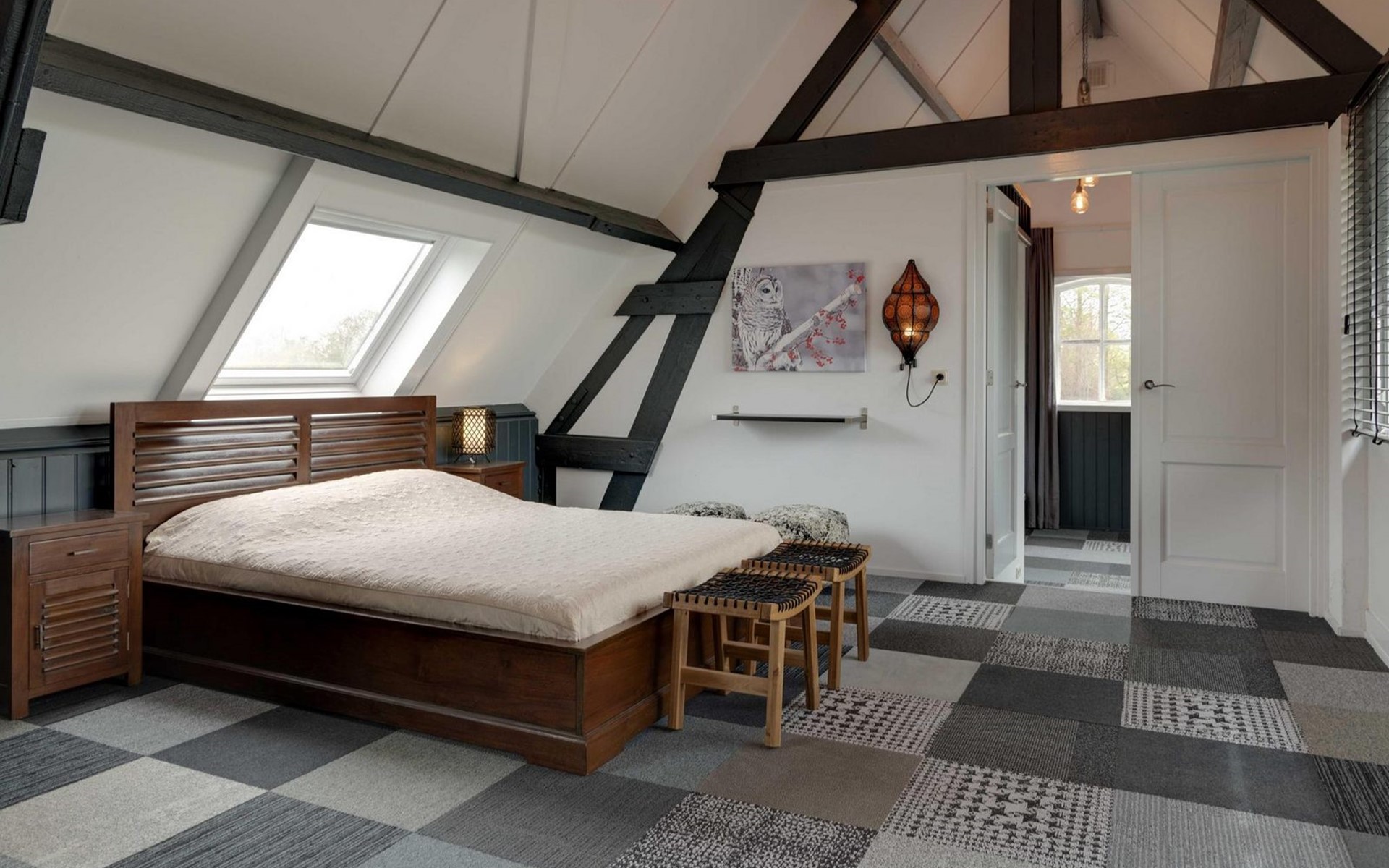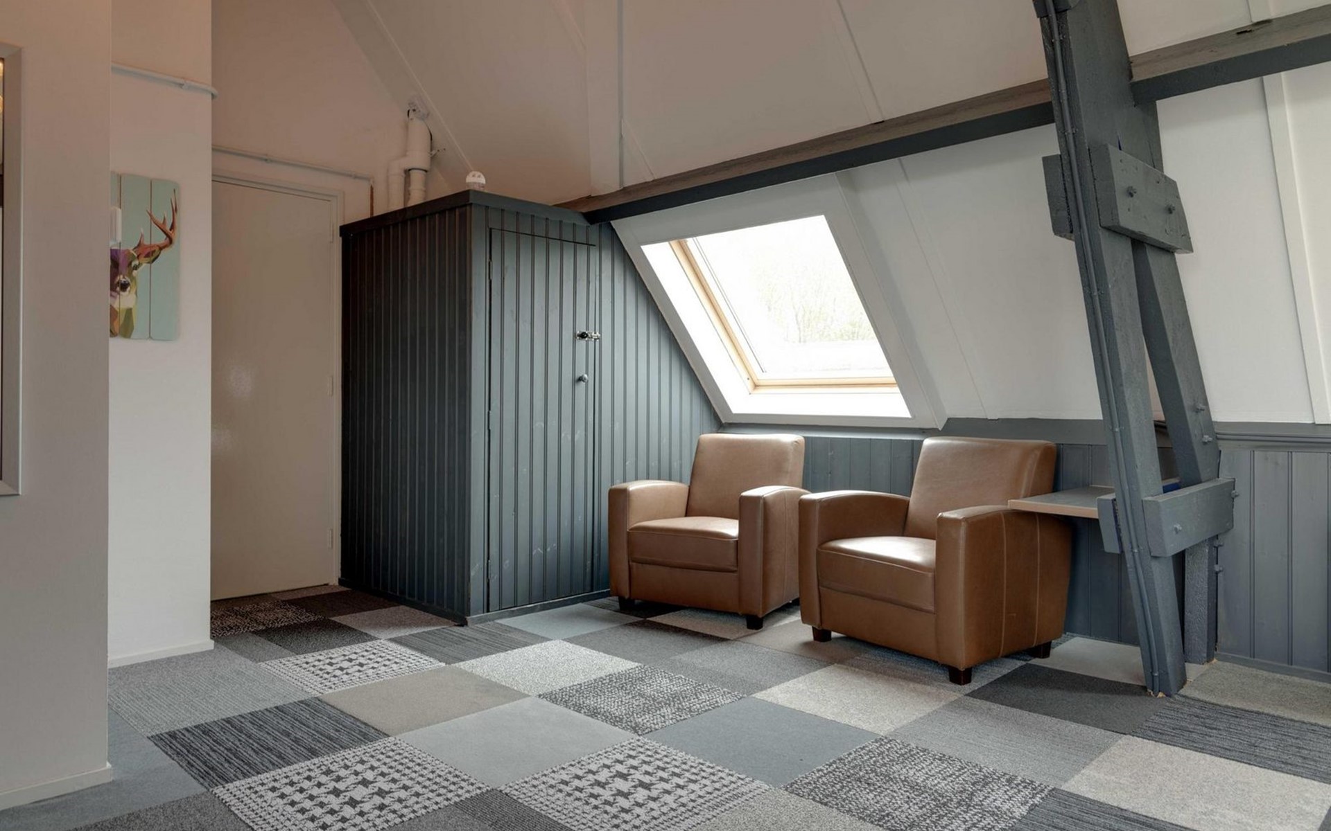 Die Eingangstür ist gleichzeitig der Zugang zum Garten auf der Südseite sowie in einen langen Flur. Von diesem führen weitere 5 Türen in verschiede Räume. So finden Sie ein Schlafzimmer mit Doppel-Box-Spring-Bett 180 x 200 cm und großem Fernseher. Daneben ist ein Badezimmer mit Dusche, Doppel-Waschbecken und Toilette sowie zusätzlich ein zweiter Toilettenraum mit WC, Wandurinal und Handwaschbecken. Eine weitere Tür führt in den Nord-Garten und die Fünfte in den komfortablen Wohn-/Essbereich. In der gigantischen, sehr gut ausgestatteten Küche mit Kochinsel und Stehbar, lassen sich köstliche Menüs für die ganze Belegschaft zubereiten, die dann gemeinsam am großen Esstisch genossen werden. Ebenfalls finden alle Platz in der sehr bequemen XXL-Polstergruppe für angeregt Diskussionen oder bei einem Film über Netflix mit ihrem eigenen Konto. Aber noch viel entspannter ist es einfach das lodernde Feuer im Kamin zu betrachten und dem Knistern des brennenden Holzes zu lauschen.