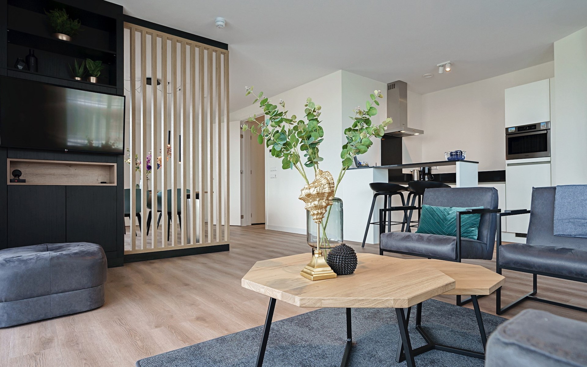 Das großzügige Wohnzimmer verfügt über einen Sitzbereich mit einem Smart-TV mit Streaming-Funktion. Es gibt auch einen Essbereich. Die moderne, offene Küche ist komplett ausgestattet und verfügt über eine Kühl-Gefrierkombination, einen Kombi-Backofen, eine Nespresso-Maschine und eine Geschirrspülmaschine.