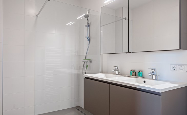 Es gibt auch 2 Schlafzimmer in der Ferienwohnung, jedes mit einem Doppelbett und einem Smart-TV. Beide Schlafzimmer haben ein En-Suite-Badezimmer. Ein En-Suite-Badezimmer hat eine begehbare Dusche, ein Doppelwaschbecken und eine Toilette. Das andere Badezimmer ist mit einer Dusche und einem Waschbecken ausgestattet. Es gibt ebenfalls eine separate Toilette.