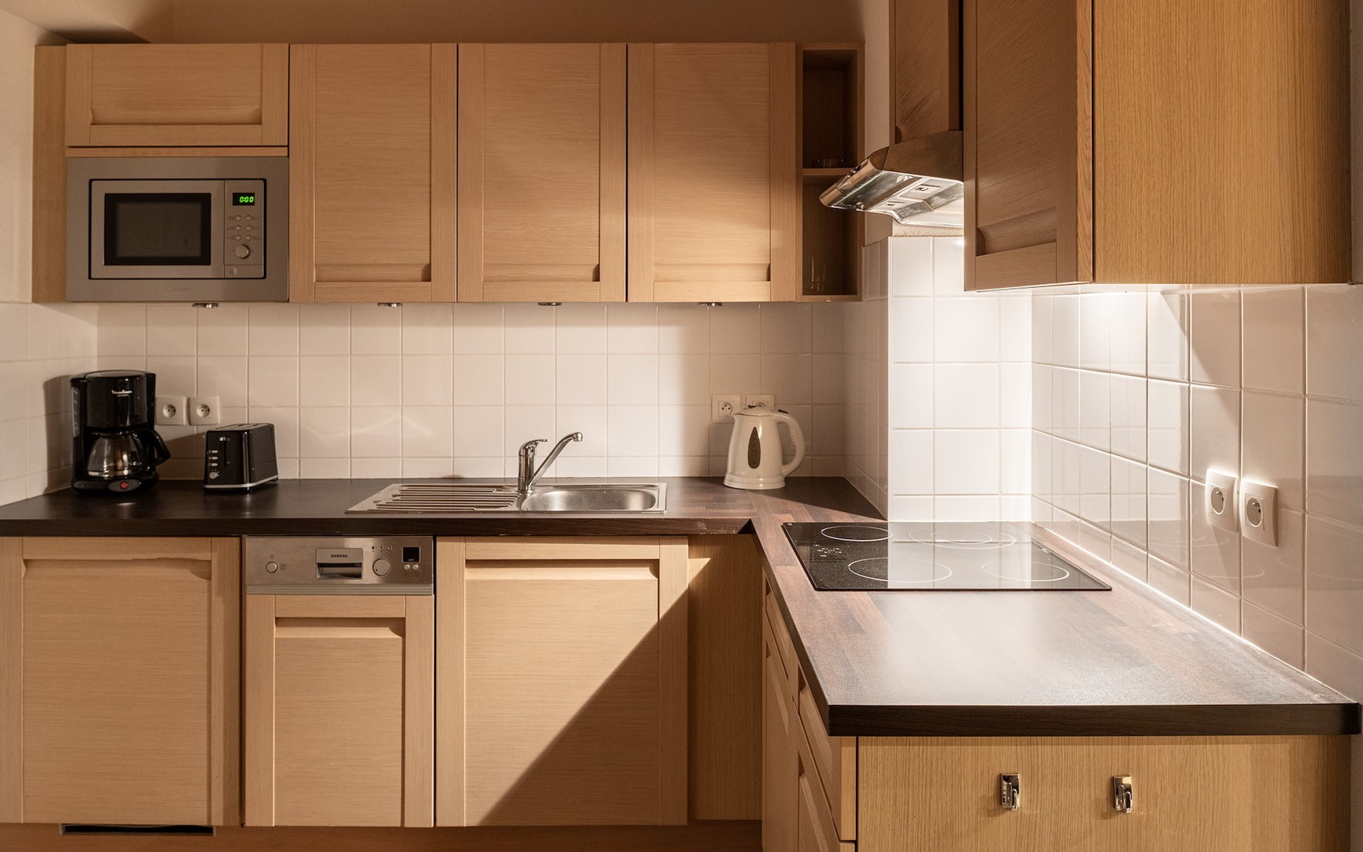 Die große Ferienwohnung verfügt über ein Wohnzimmer mit Essecke, eine Sitzecke mit Schlafsofa für 2 Personen und einen Fernseher. Die Küche ist mit Kühlschrank, Cerankochfeld, Mikrowelle, Geschirrspüler, Toaster, Filterkaffeemaschine und Wasserkocher ausgestattet.