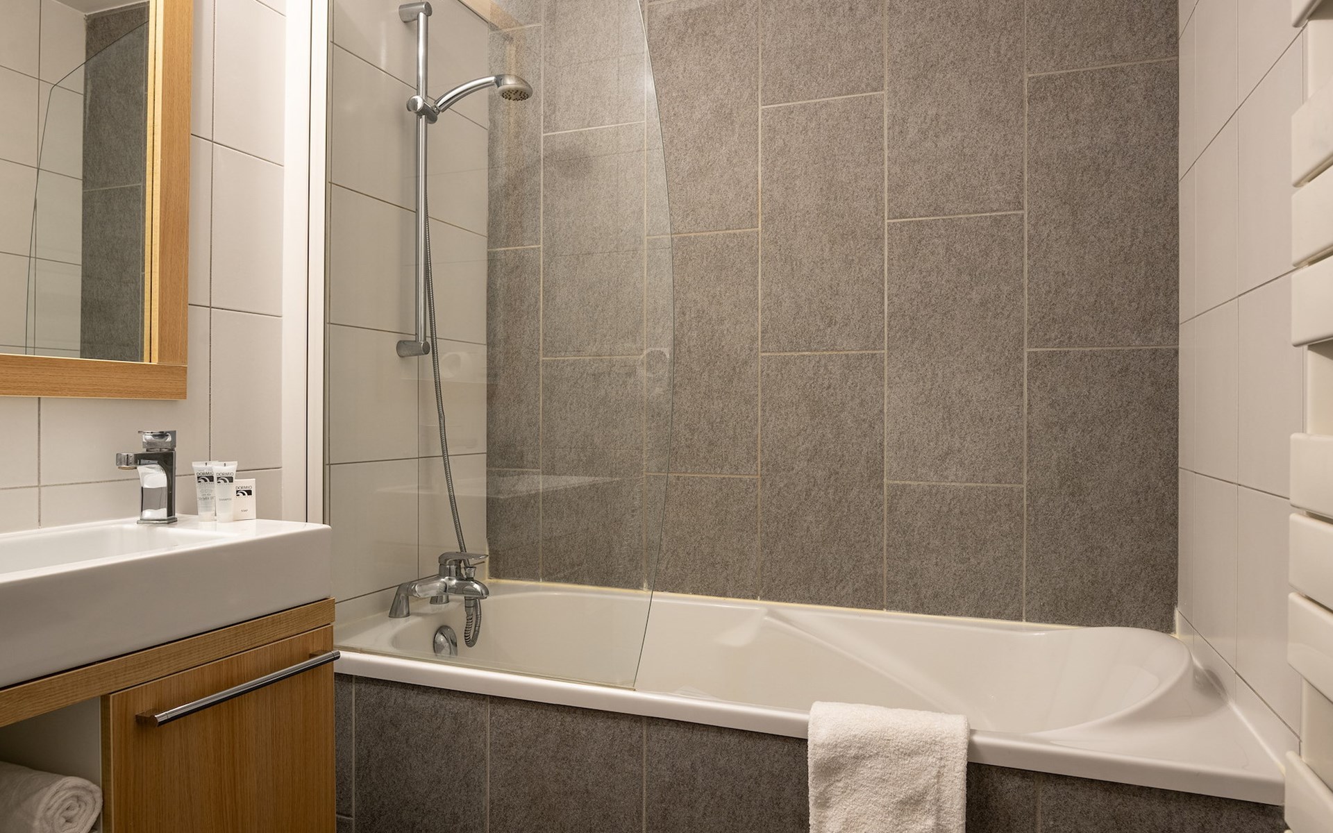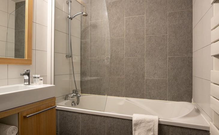 Es gibt 2 Schlafzimmer mit 1 Doppelbett und einem Fernseher. Das Badezimmer ist mit einer Badewanne, Waschbecken und einer Toilette ausgestattet.