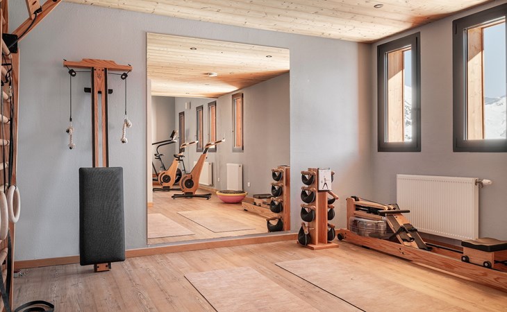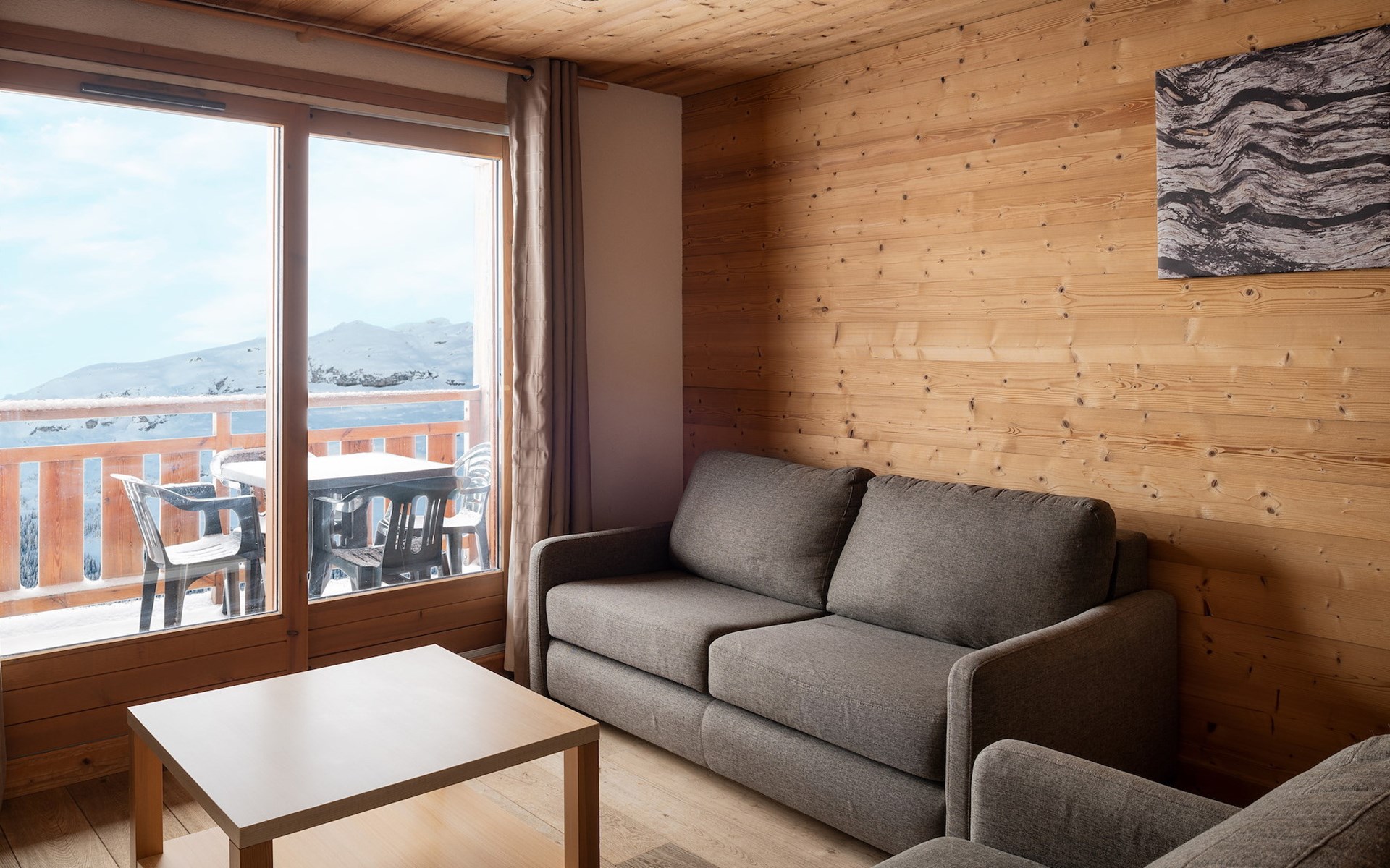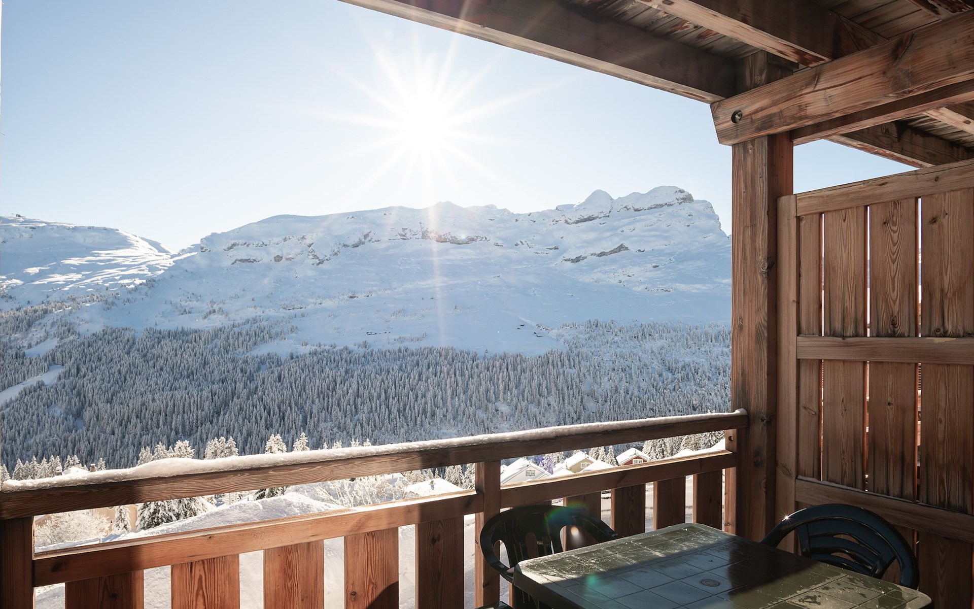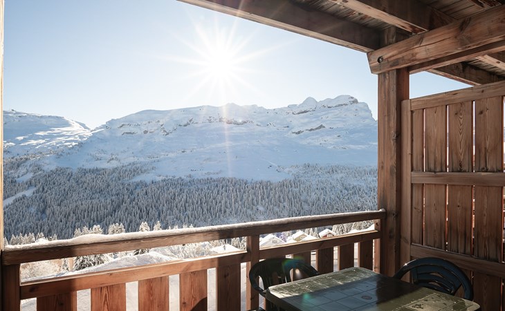 Vom Wohnzimmer aus gelangt man auf den Balkon oder die Terrasse mit Sitzgelegenheit und schönem Bergblick.