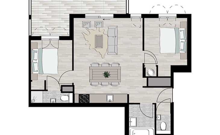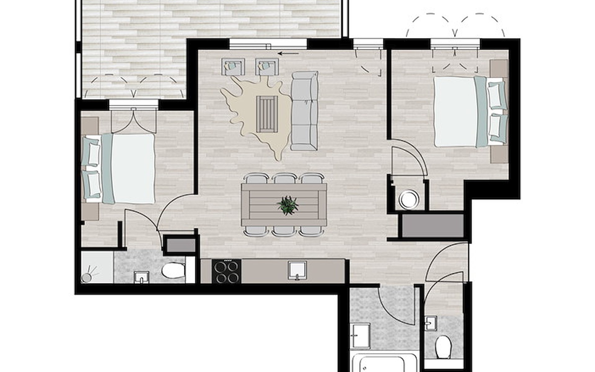 Es gibt 2 Schlafzimmer, 1 mit einem Doppelbett und 1 mit 2 Einzelbetten. Beide Schlafzimmer haben einem Fernseher. Die Ferienwohnung hat auch 2 Badezimmer, 1 mit Dusche, Waschbecken und Toilette und 1 mit Badewanne und/oder Dusche und Waschbecken.