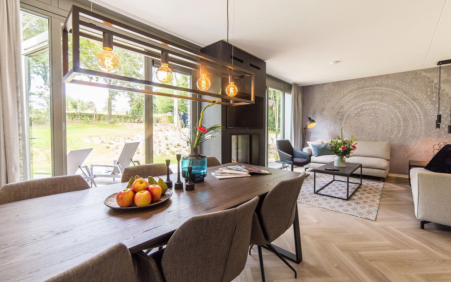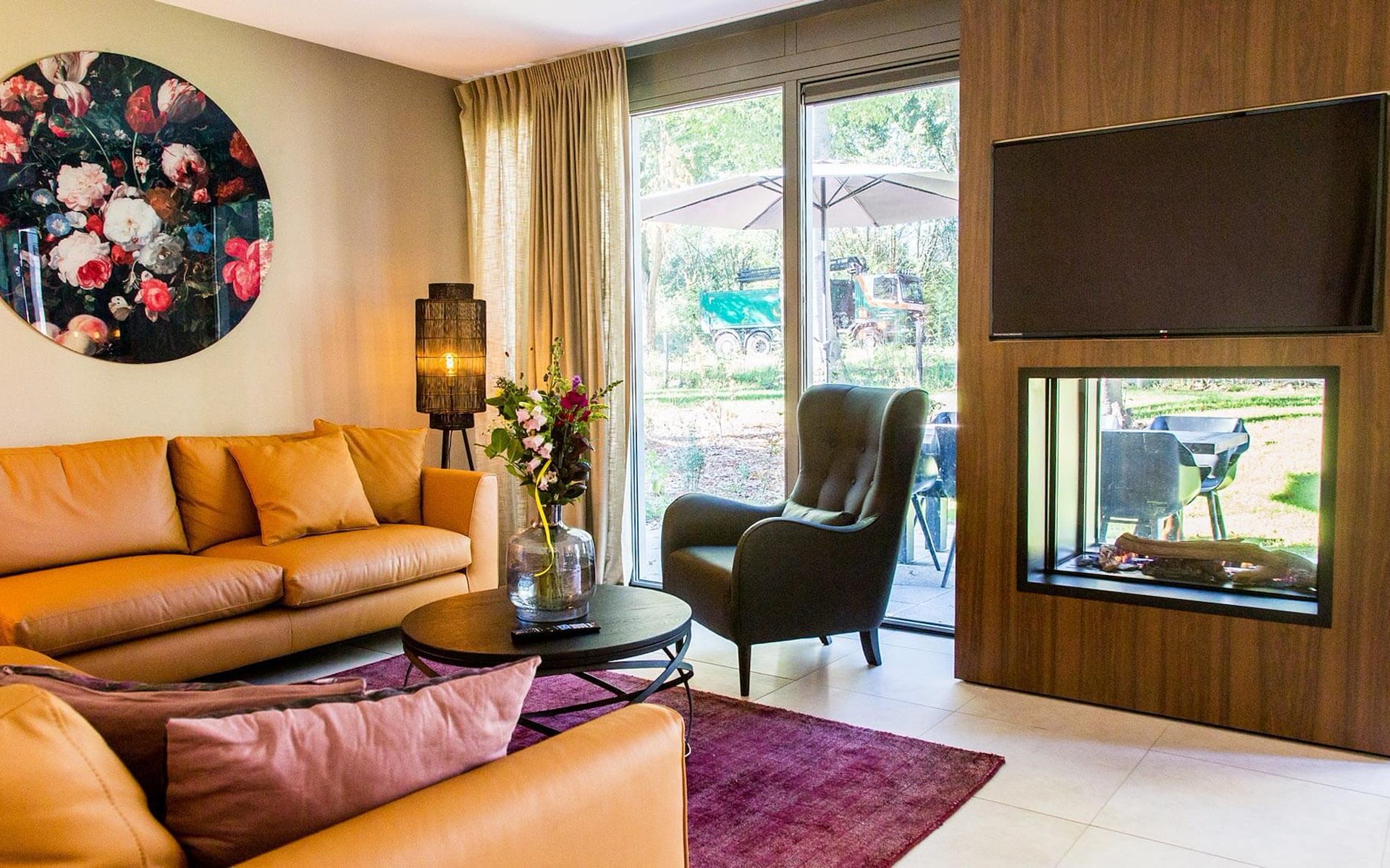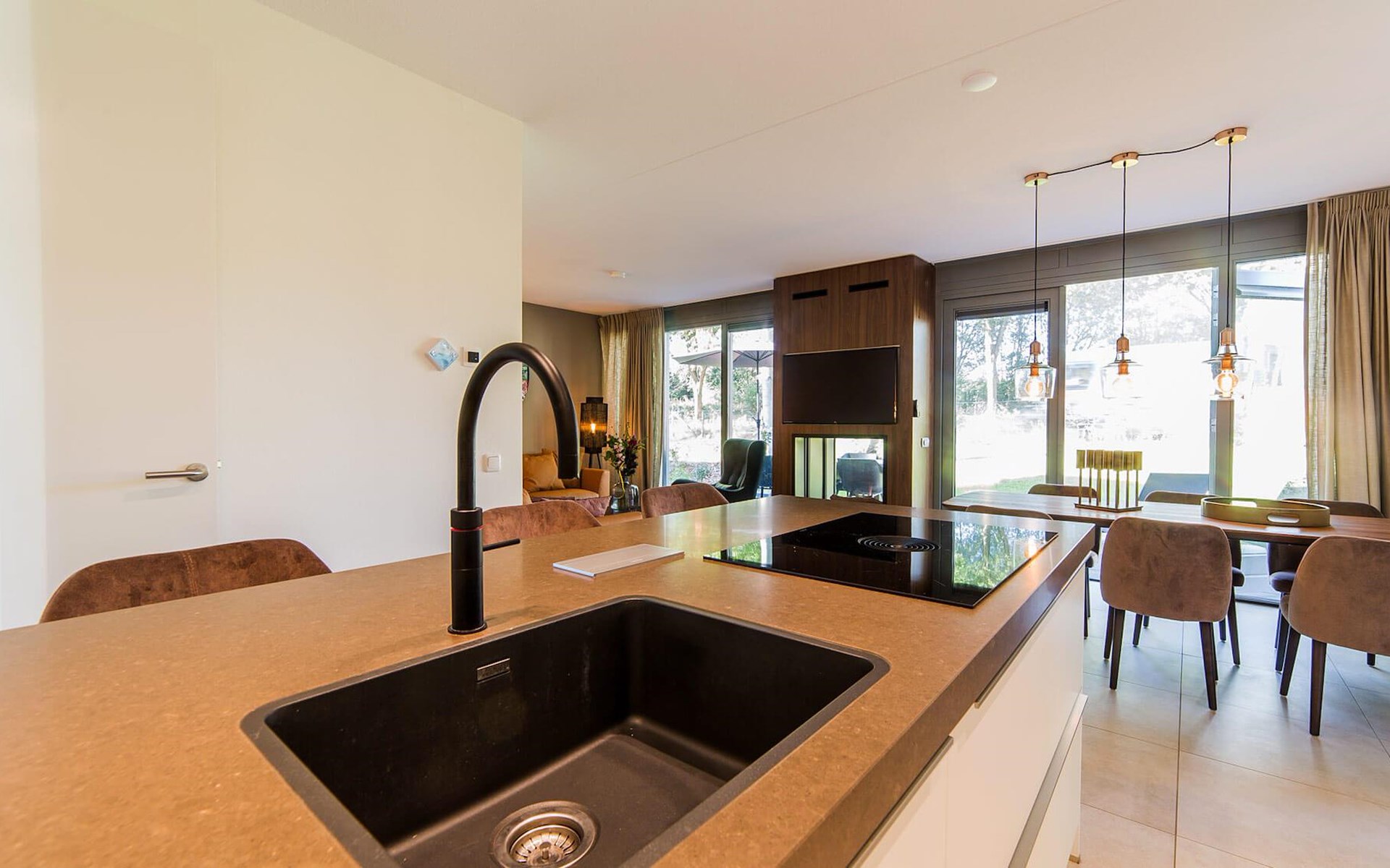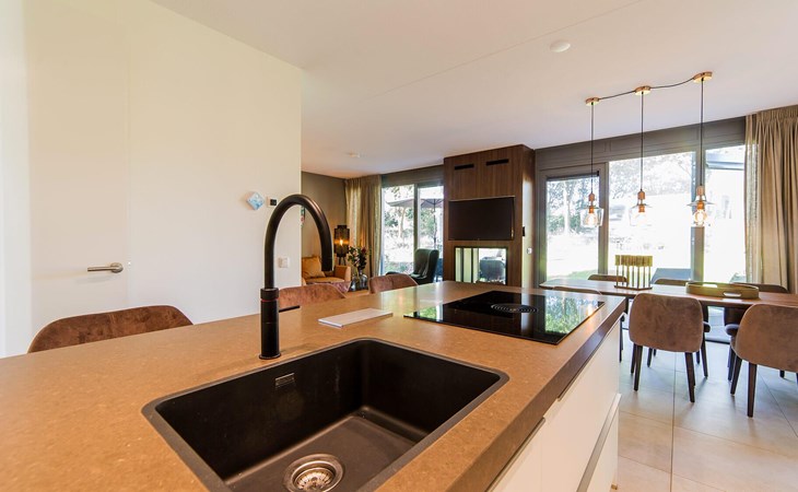 Von der Eingangshalle aus gelangen Sie in das moderne Wohnzimmer mit einer großer Sitzecke mit Fernseher, einem gemütlichen Gaskamin und einem Essbereich. In dieser Villa haben Sie Zugang zu einer offenen Küche, die mit Luxusgeräten und einer Kücheninsel ausgestattet ist. Die Küche verfügt über einen Wasserhahn für heißes Wasser, einen Kombiofen, einen Geschirrspüler und eine Nespresso-Maschine.