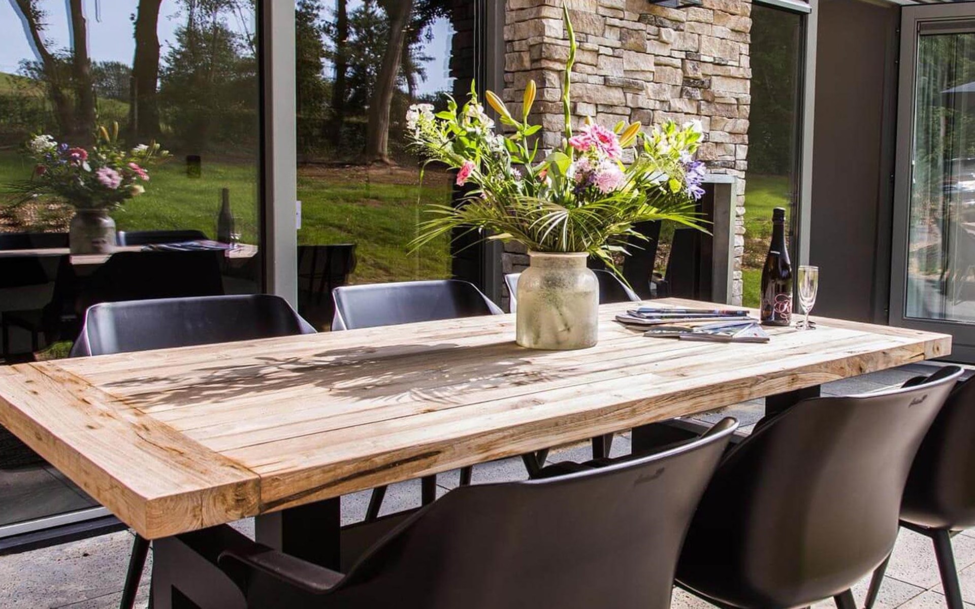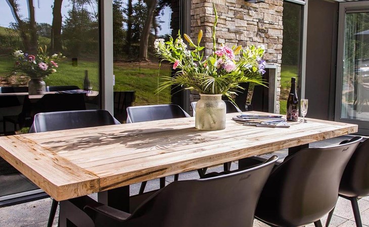 Draußen können Sie auf der möblierten Gartenterrasse mit Außenkamin herrlich Ihre Zeit verbringen. Sie gelangen vom Wohnzimmer aus auf diese Terrasse.