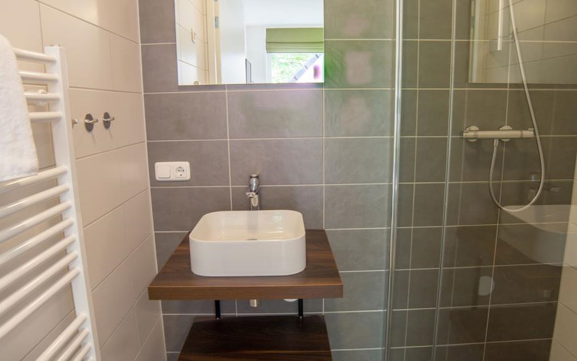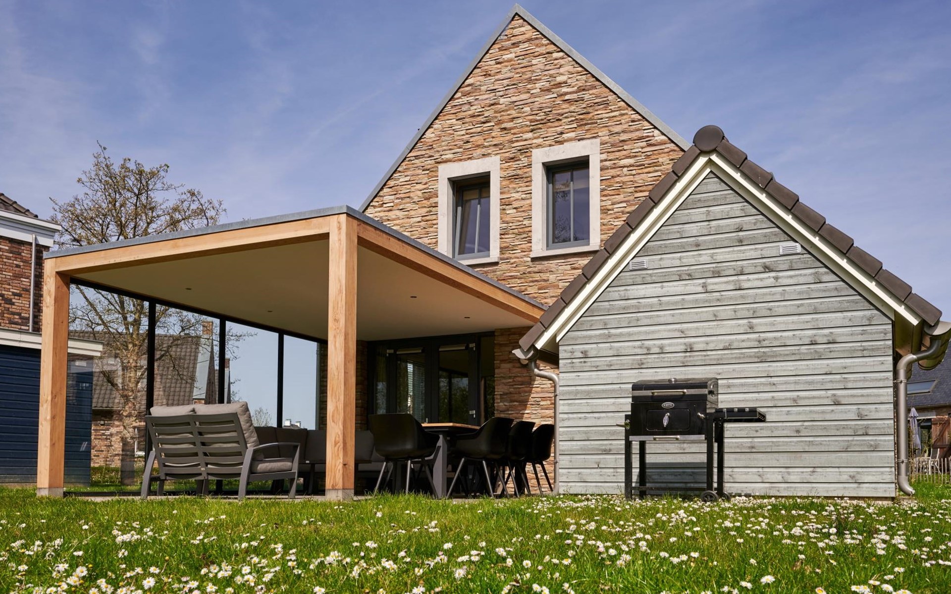 Das Wohnzimmer wird durch eine großzügige Veranda erweitert. Hier haben Sie Zugang zu einer Gartengarnitur, einem bequemen Loungeset und einer Heizung. Außerdem können Sie hier den Grill nutzen.
