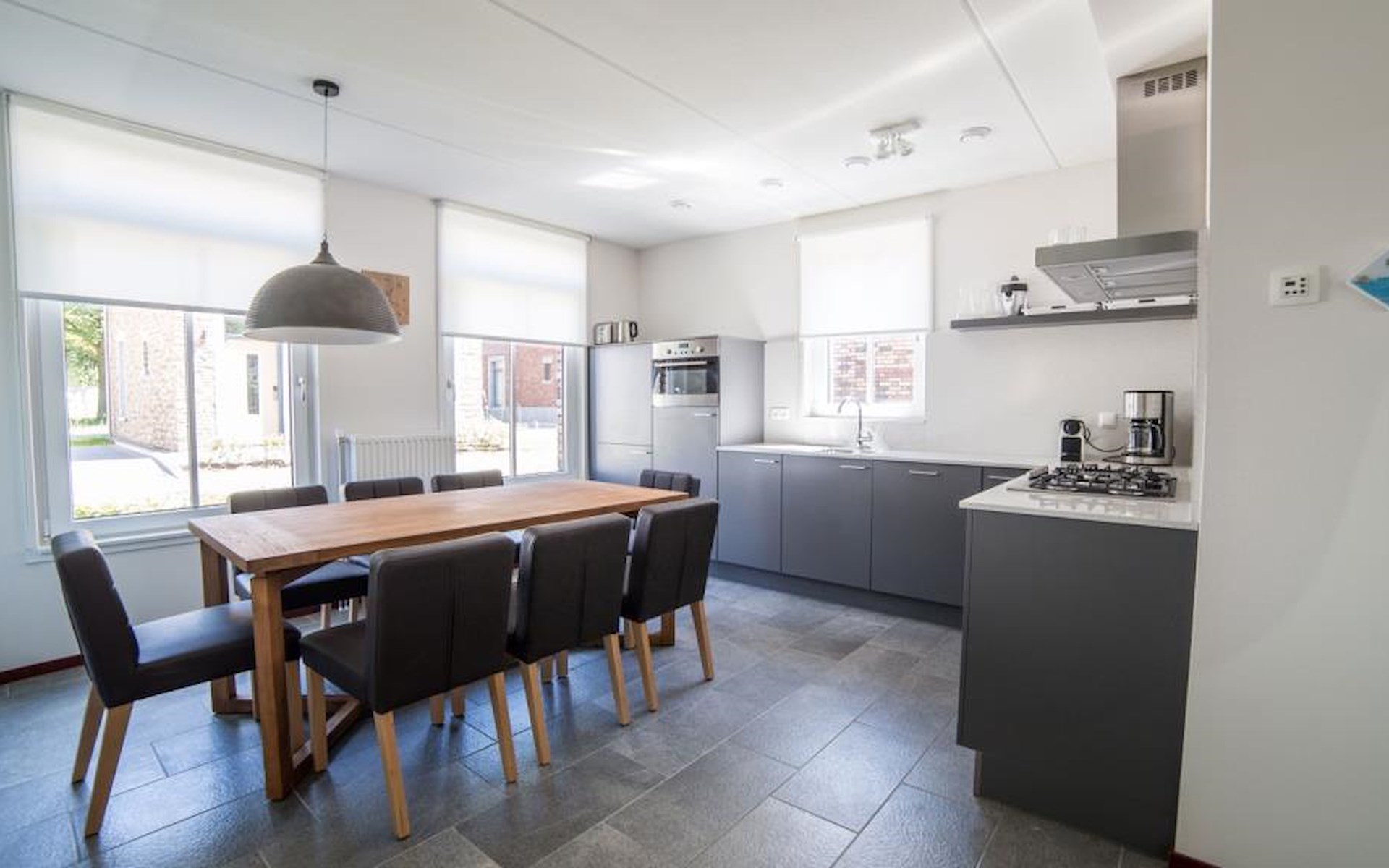 Das großzügige Wohnzimmer verfügt über einen Sitzbereich mit freistehendem Holzofen und Fernseher. Es gibt auch einen Essbereich mit Esstisch. Die Küche ist mit Luxusgeräten ausgestattet, darunter ein Kühlschrank, eine Mikrowelle, ein Geschirrspüler, ein Wasserkocher, ein Ofen, ein Kochfeld, ein Toaster und eine Nespresso-Maschine.