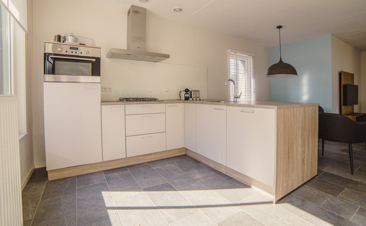 Das großzügige Wohnzimmer verfügt über gemütliche Sitzbereich mit freistehendem Holzofen und Fernseher. Es gibt auch einen Essbereich mit Esstisch. Die luxuriöse Küche ist komplett ausgestattet mit einem Kühlschrank, einer Mikrowelle, einem Geschirrspüler, einem Wasserkocher, einem Ofen, einem Kochfeld, einem Toaster und einer Nespresso-Maschine.