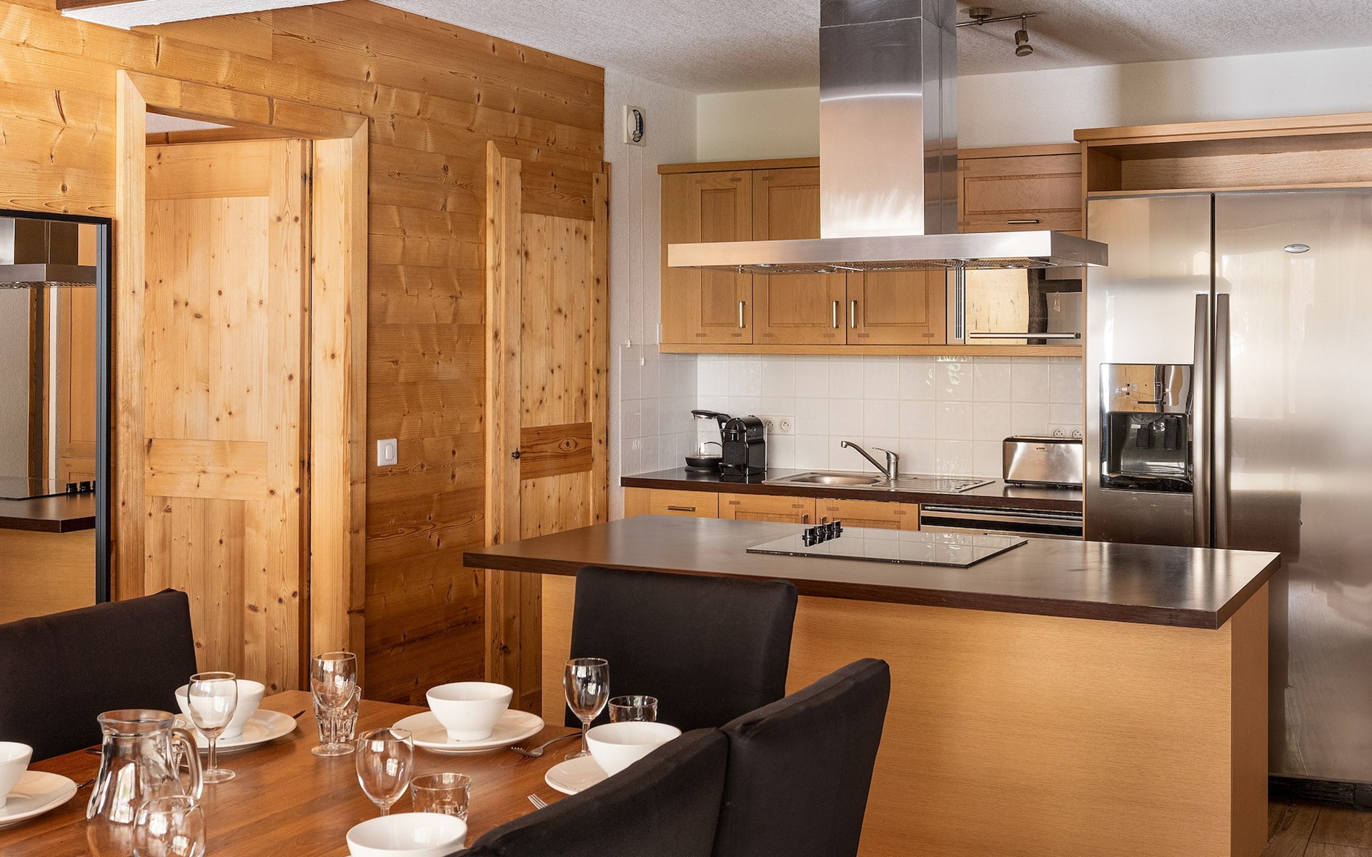 Das gemütlichen Wohnzimmer verfügt über einen Sitzbereich mit einem Schlafsofa für 2 Personen, einen Fernseher mit Streaming-Funktion und einen Esstisch. Die Küche ist mit Kochinsel, amerikanischen Kühlschrank, Cerankochfeld, Geschirrspüler, Backofen, Mikrowelle/Grill, Toaster, Filterkaffeemaschine und Wasserkocher ausgestattet.
