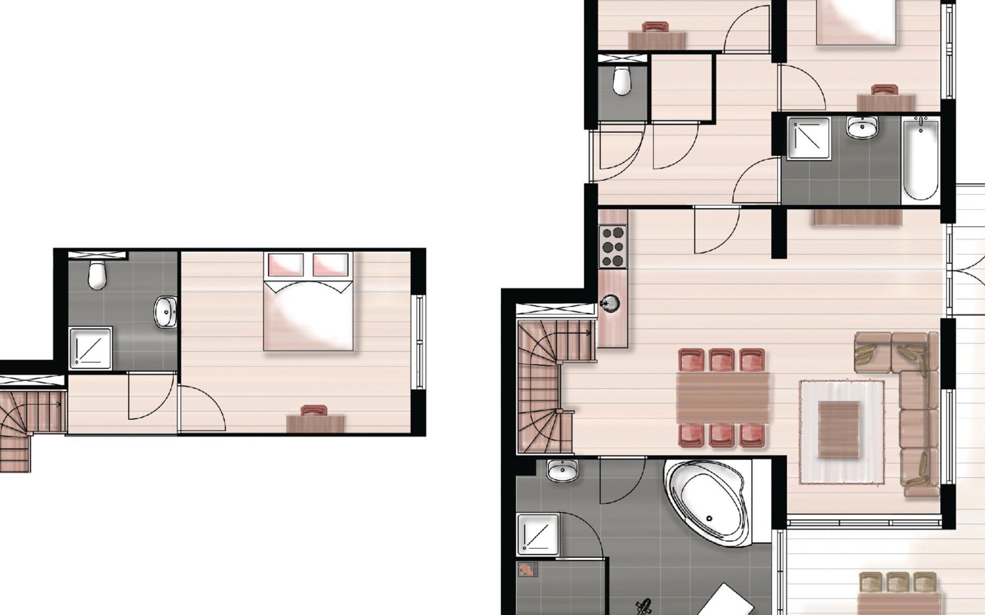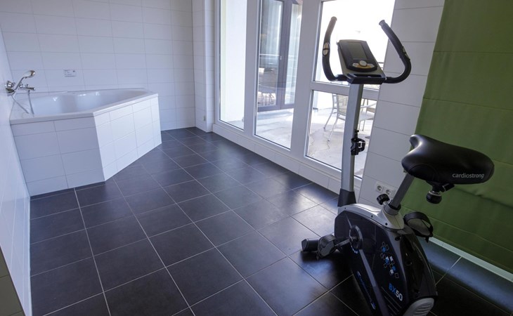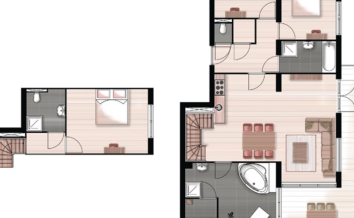 In der unteren Etage finden Sie das das großzügige Wohnzimmer mit einer Essecke und einer Sitzecke mit Fernseher. Die voll ausgestattete, offene Küche verfügt über Luxusgeräte wie Gasherd, Mikrowelle und Geschirrspüler. Vom Wohnzimmer aus haben Sie Zugang zum Balkon mit Terrassenmöbeln. Genießen Sie die schöne Aussicht von diesem großzügigen Balkon oder entspannen Sie sich in Ihrem privaten Wellnessbereich! Dieser Wellnessbereich verfügt über eine Sauna und einen Whirlpool. Hier finden Sie auch Fitnessgeräte, eine Dusche und ein Waschbecken.