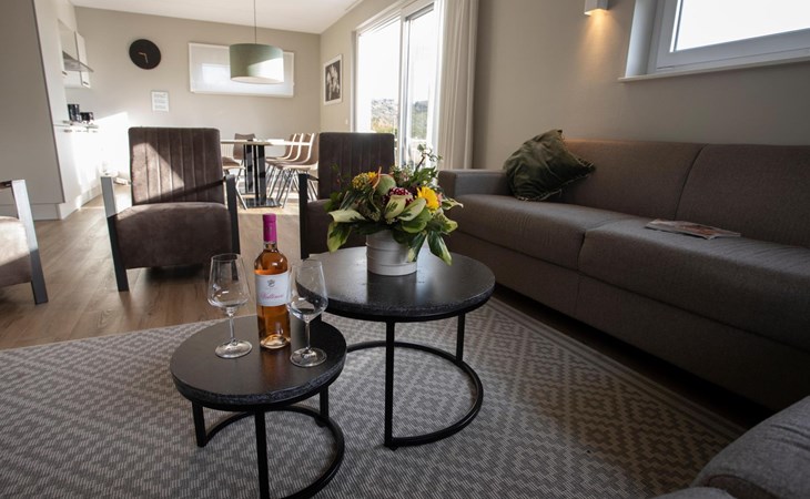 Im Erdgeschoss des Ferienhauses finden Sie das gemütliche Wohnzimmer mit einer Sitzecke mit Fernseher. Die offene Küche verfügt über Luxusgeräte wie Gasherd, Mikrowelle und Geschirrspüler. Das Wohnzimmer bietet Zugang zum großen Balkon mit Terrassenmöbeln.