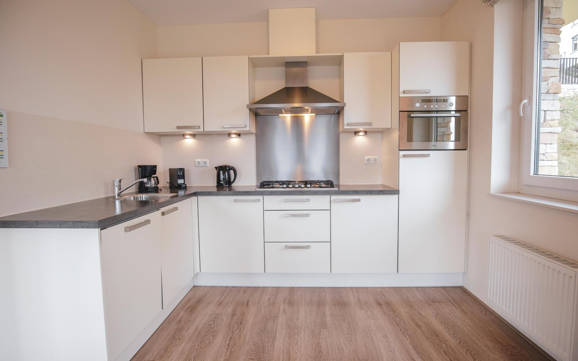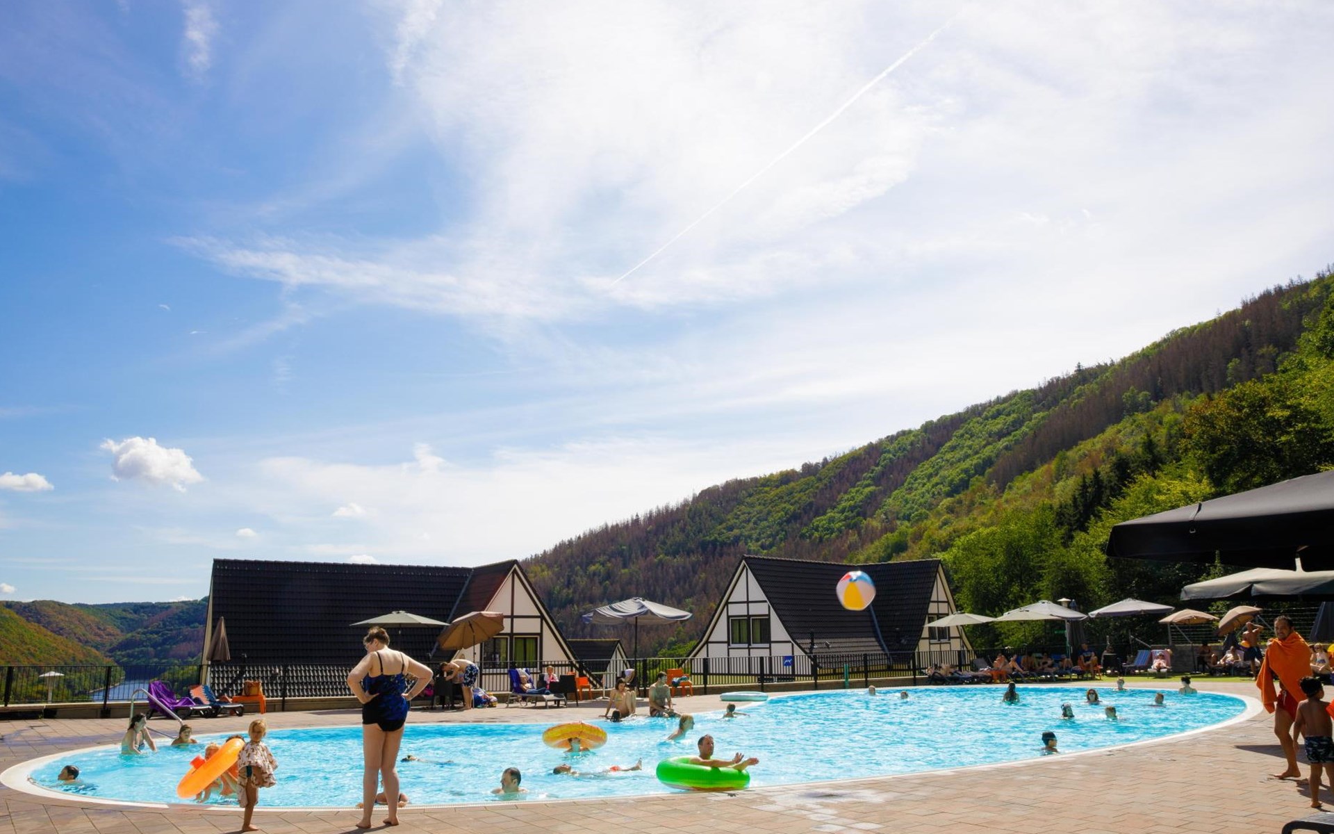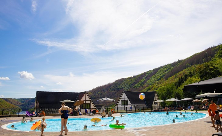 Im Erdgeschoss finden Sie das gemütliche Wohnzimmer mit einem Essbereich und einer Sitzecke mit Fernseher. Darüber hinaus haben Sie Zugang zu einer voll ausgestatteten offenen Küche mit u. a. Gasherd, Mikrowelle und Geschirrspüler. Es gibt auch eine separate Toilette und einen Abstellraum. Auf dem großen Balkon oder Terrasse mit Terrassenmöbeln können Sie die Aussicht auf das Rurtal genießen.