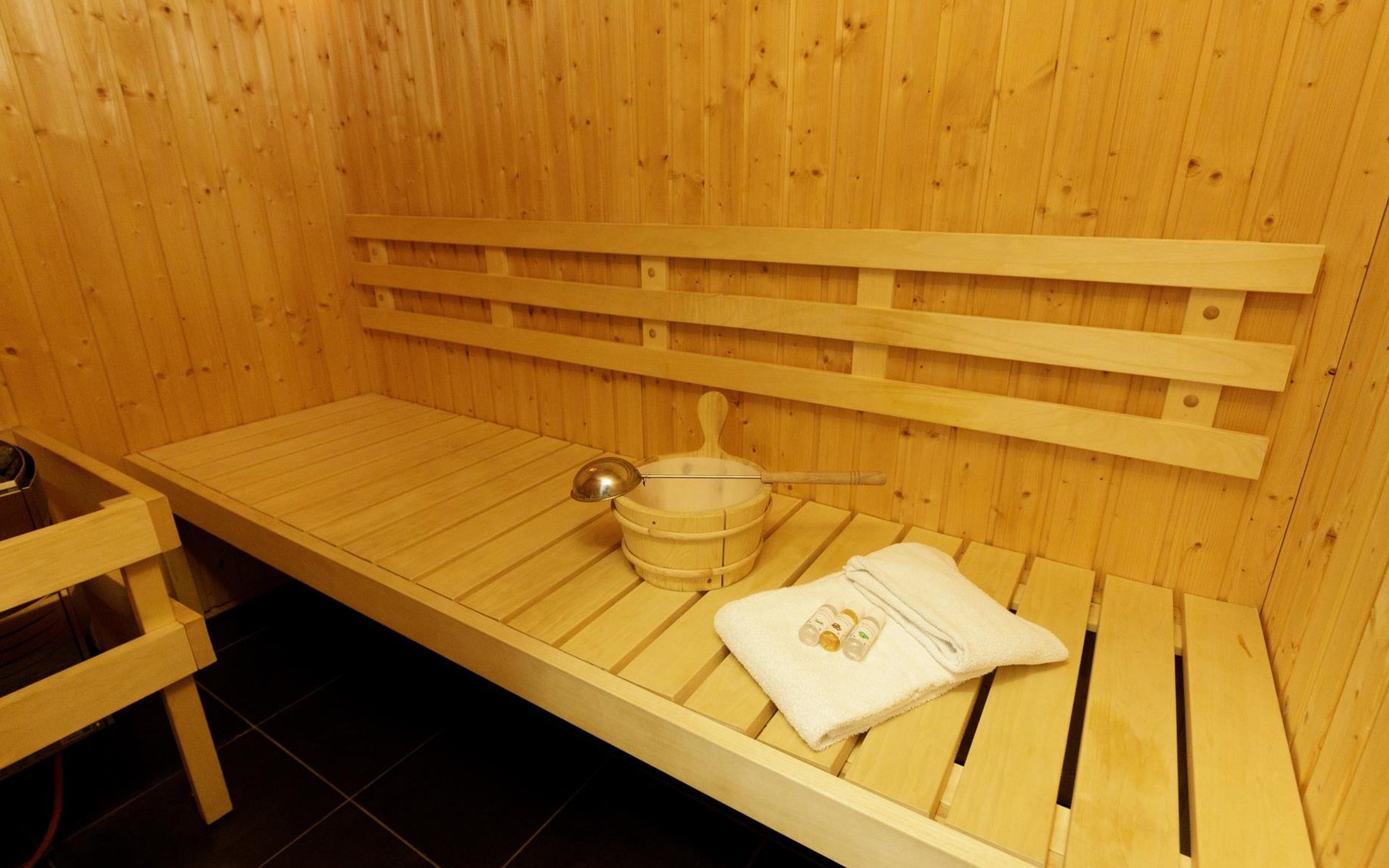Die erste Etage ist über eine Treppe erreichbar. Hier haben Sie 2 Schlafzimmer und 1 Badezimmer zur Verfügung. Ein Schlafzimmer hat ein Doppelbett, einen Fernseher und einen Kleiderschrank. Das andere Schlafzimmer ist mit 2 Einzelbetten und einem Kleiderschrank ausgestattet. Das Badezimmer verfügt über eine Whirlpool, separate Dusche, Waschbecken und eine private Sauna. Es gibt auch eine separate Toilette in der ersten Etage.