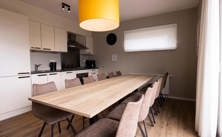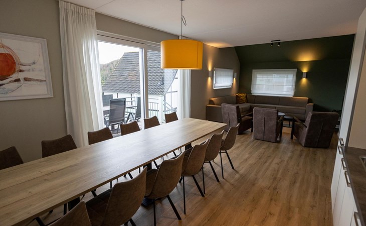 Das Erdgeschoss besteht aus einem gemütlichen Wohnzimmer mit einer Sitz- und Essecke. Die Sitzecke ist mit einem Fernseher ausgestattet. Die voll ausgestattete offene Küche verfügt über einen Gasherd, eine Mikrowelle und einen Geschirrspüler. Von diesem Zimmer aus gelangen Sie auch auf den Balkon mit Gartenmöbeln, wo Sie die Natur genießen können. Im Erdgeschoss gibt es auch eine separate Toilette und einen Abstellraum.