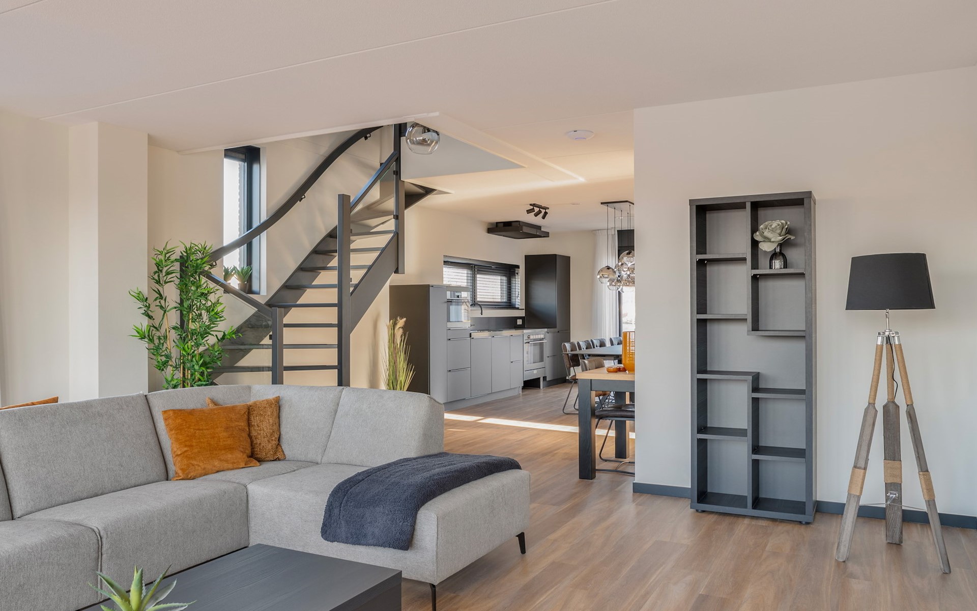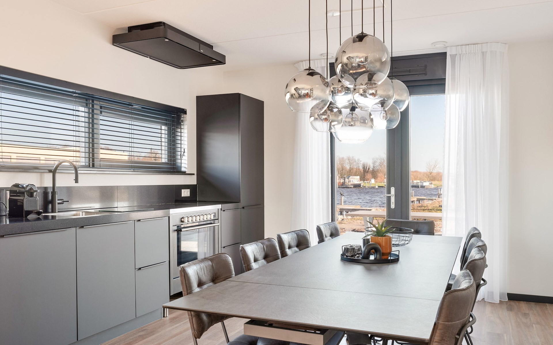 Das Wohnzimmer hat eine Sitzecke mit Smart-TV und einer Soundbar. In der angrenzenden offenen Küche befindet sich die Essecke. Die Küche verfügt über einen Wasserhahn für kochendes Wasser, einen Kühlschrank mit Gefrierfach, eine Geschirrspülmaschine, eine Nespresso-Maschine, eine Filterkaffeemaschine, eine Mikrowelle und einen Backofen.