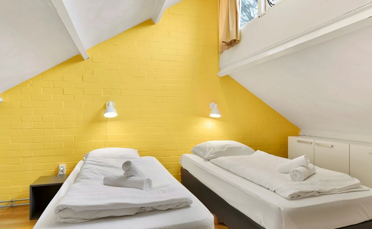 In der ersten Etage gibt es 1 Schlafzimmer mit jeweils 2 Einzel-Boxspringbetten.