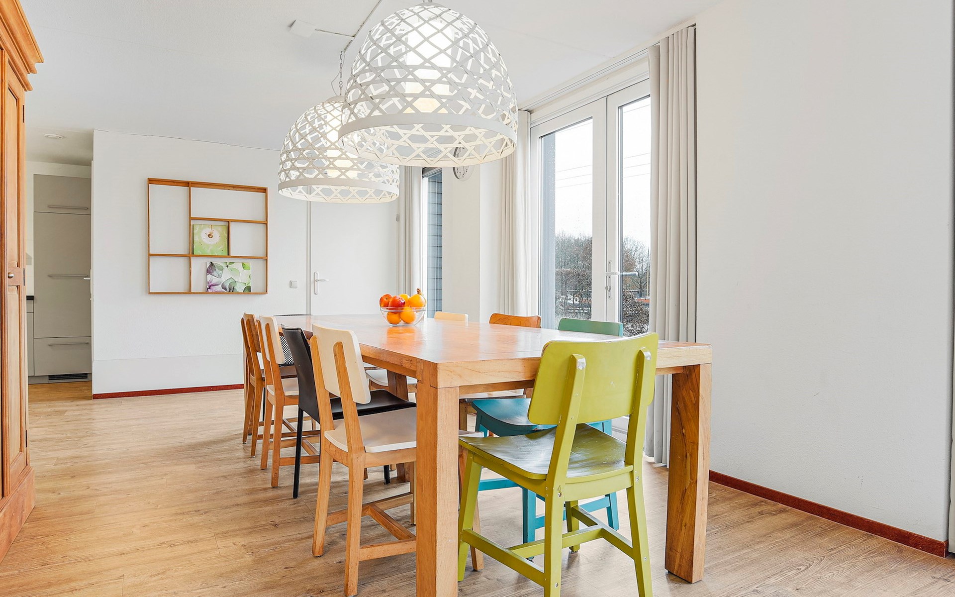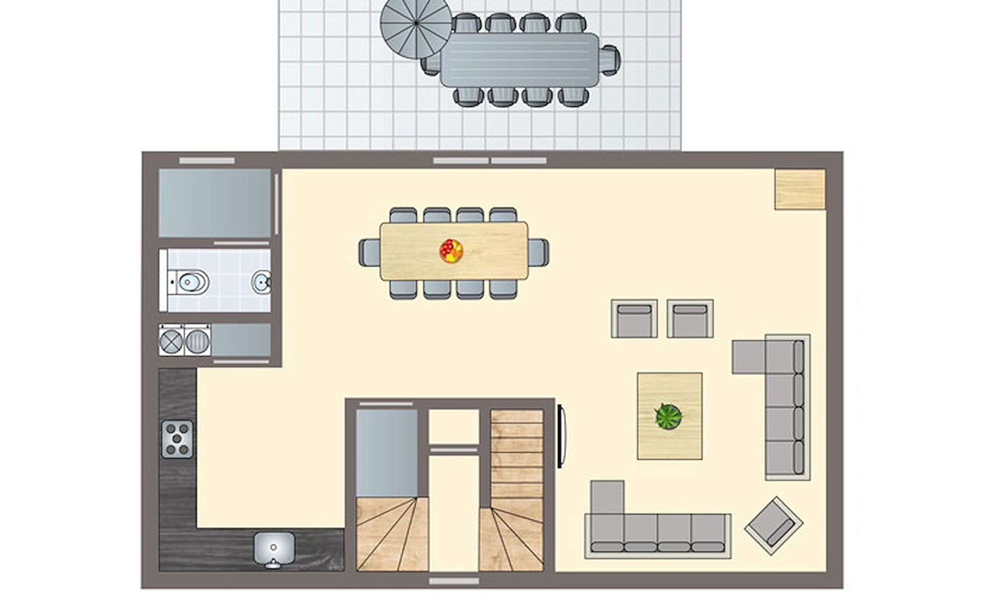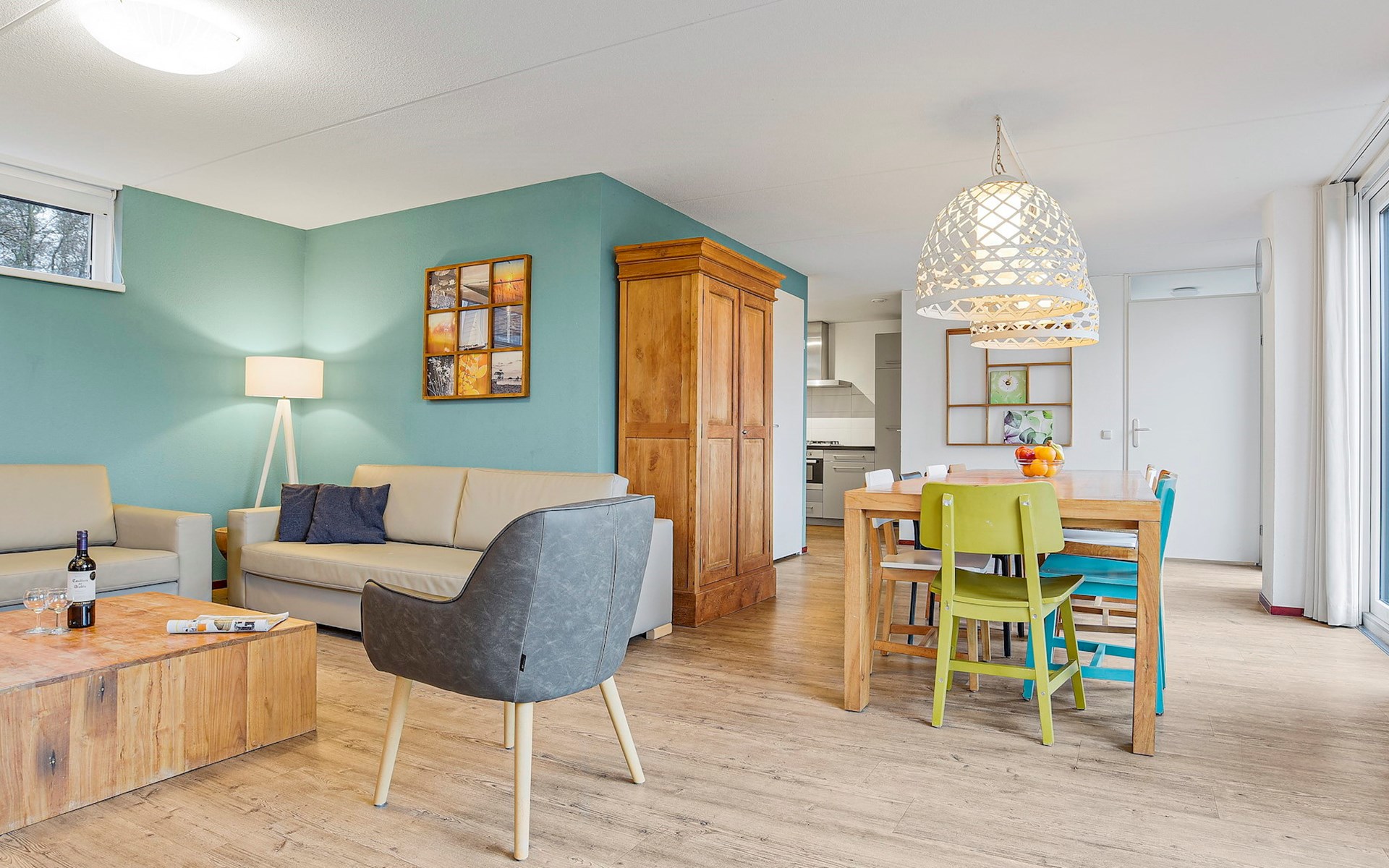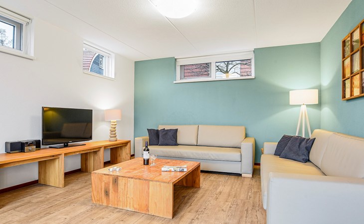 Das Wohnzimmer ist mit einer Sitzecke, Fernseher, CD- und DVD-Player und Radio ausgestattet. Der Bungalow verfügt über eine offene Küche mit Essecke. Die Küche ist u.a. mit einem Kühlschrank mit Gefrierfach, einer Nespresso-Kaffeemaschine, Mikrowelle und einer Geschirrspülmaschine ausgestattet. Im Erdgeschoss gibt auch eine separate Toilette und einen Waschraum mit Waschmaschine und Wäschetrockner.
