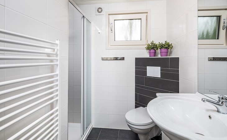 Das Chalet hat 2 Schlafzimmer mit je 2 Einzelbetten oder 1 Schlafzimmer mit 2 Einzelbetten und einem Etagenbett im anderen Schlafzimmer. Das Badezimmer hat eine Dusche, ein Waschbecken und eine Toilette.