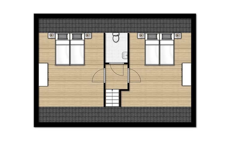 Im ersten Stock gibt es 2 Schlafzimmer und 1 Badezimmer. Die Schlafzimmer haben jeweils 2 Einzelbetten. Das Badezimmer hat eine Dusche, Waschbecken und Toilette.