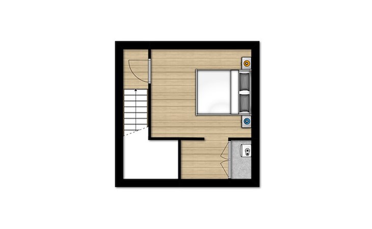 Der Bungalow verfügt auch über einen Schlafboden. Dieser Schlafboden ist 1,25 m hoch und enthält ein doppeltes Boxspringbett.