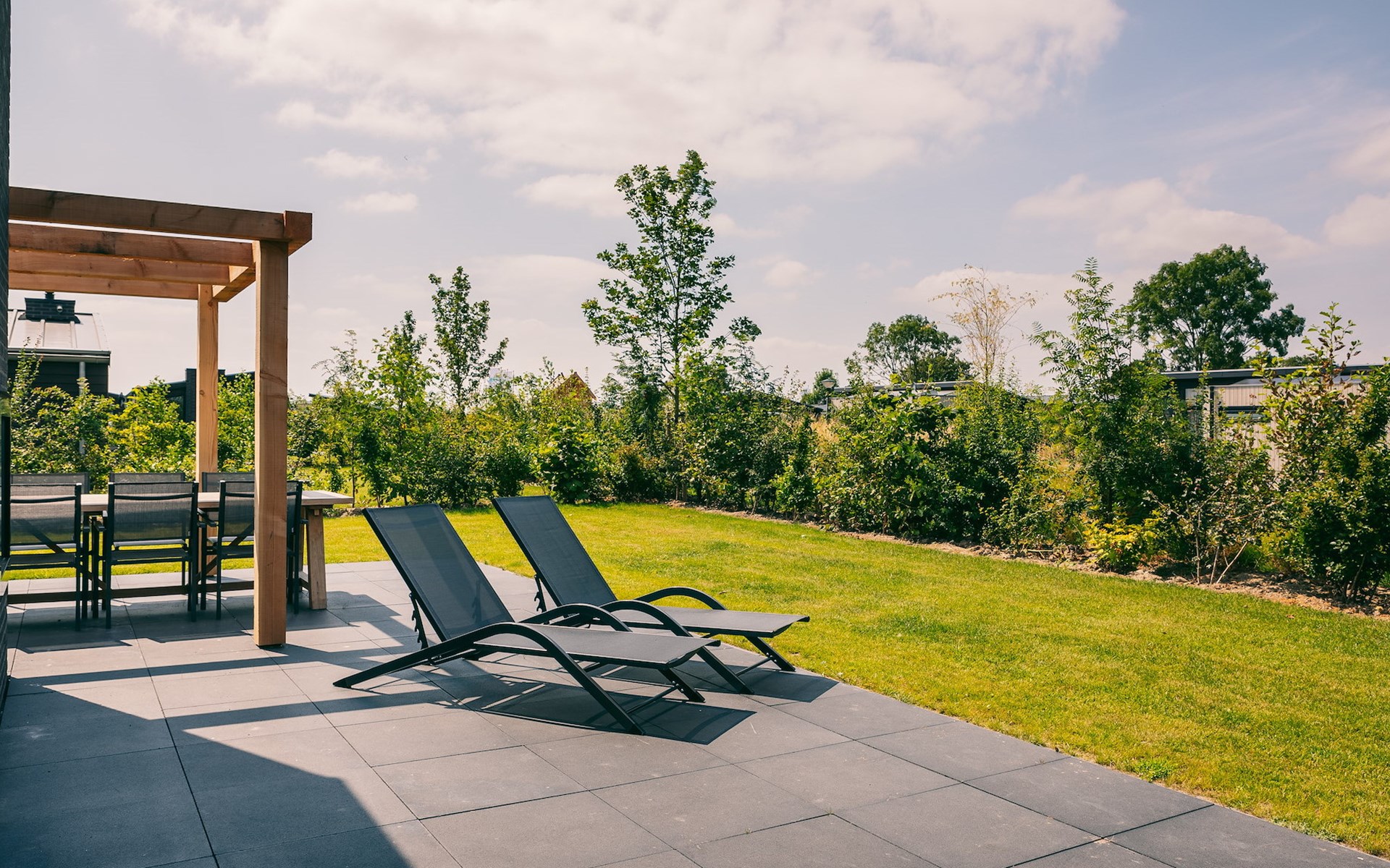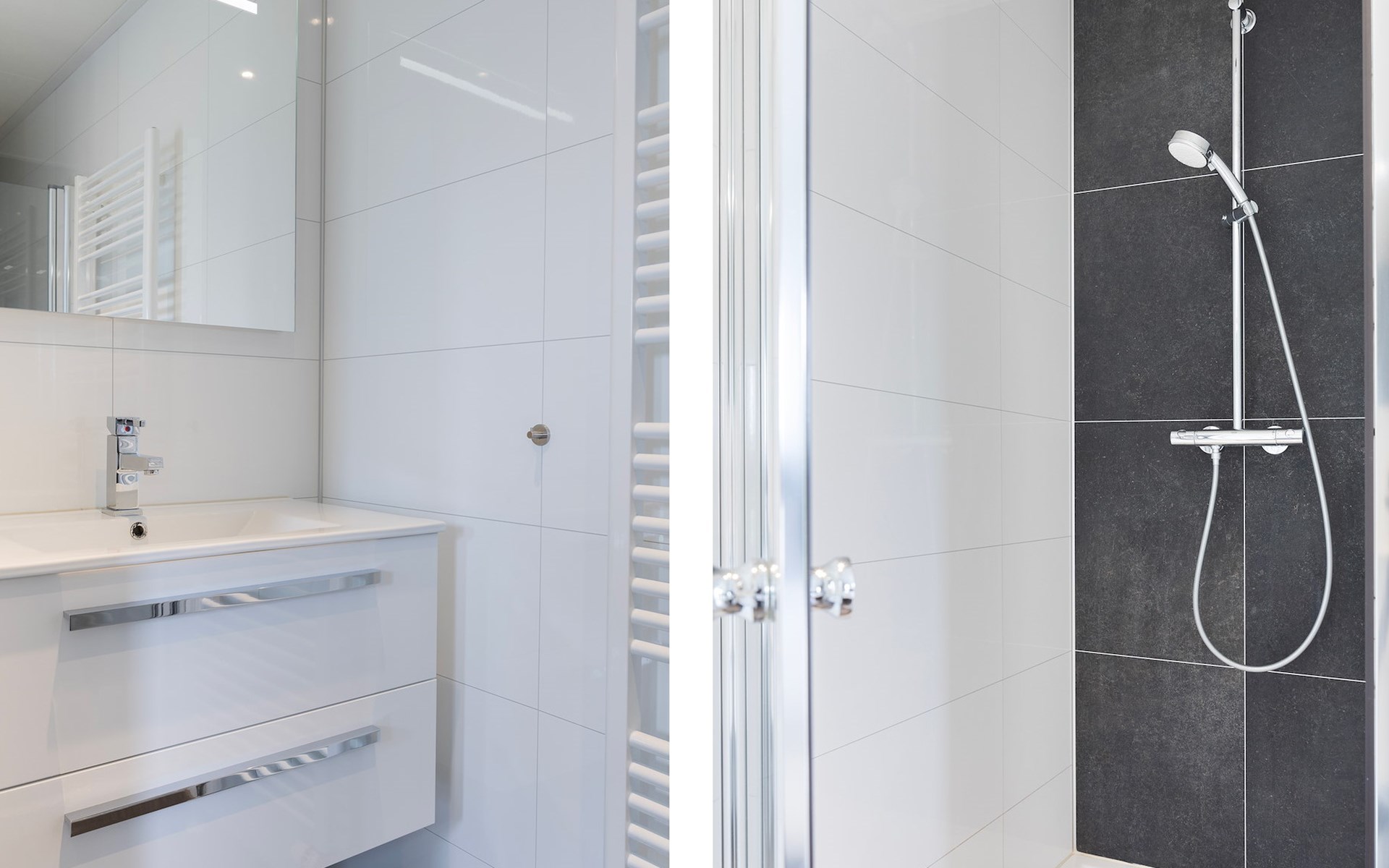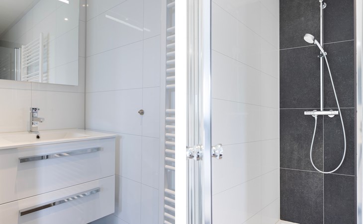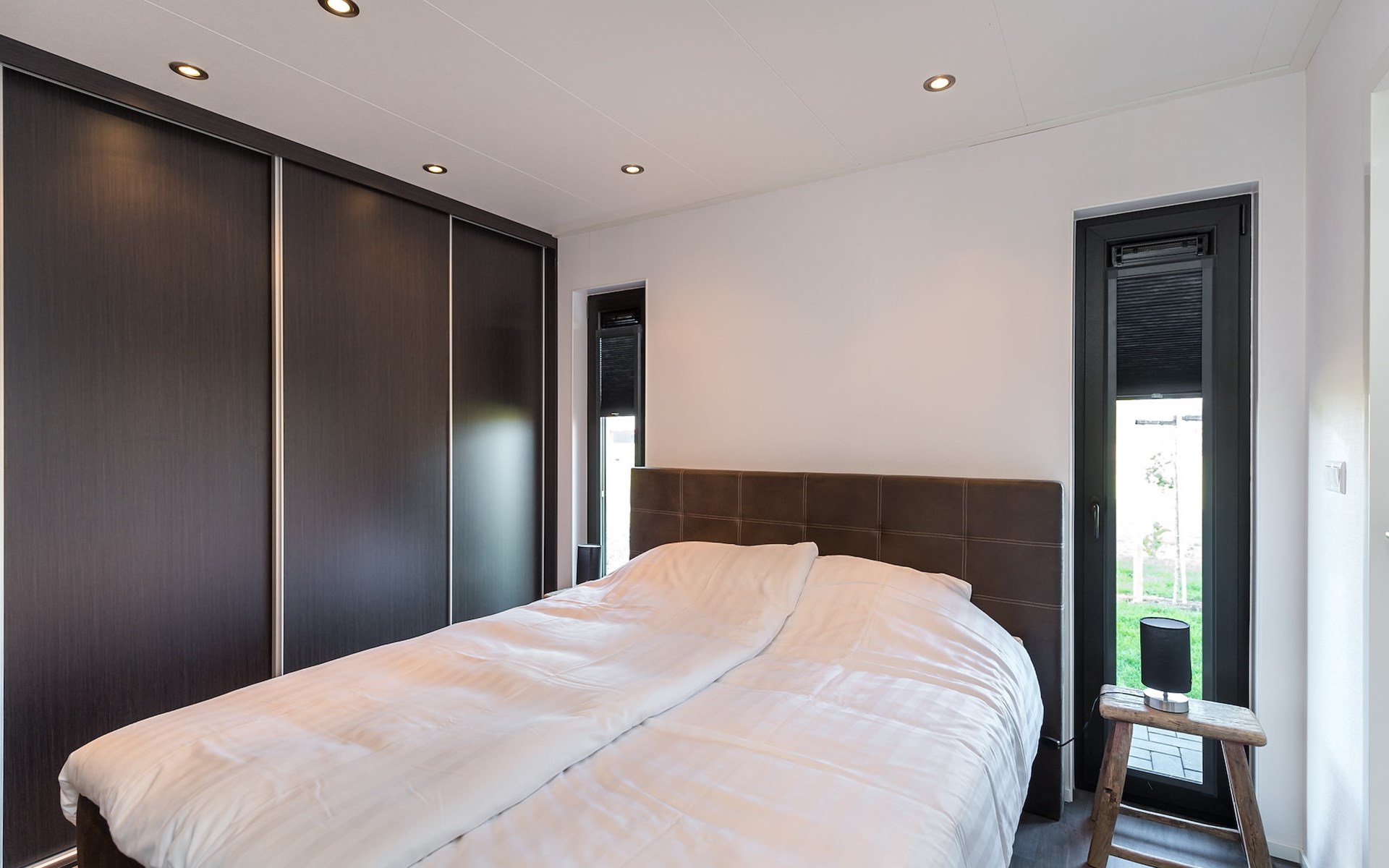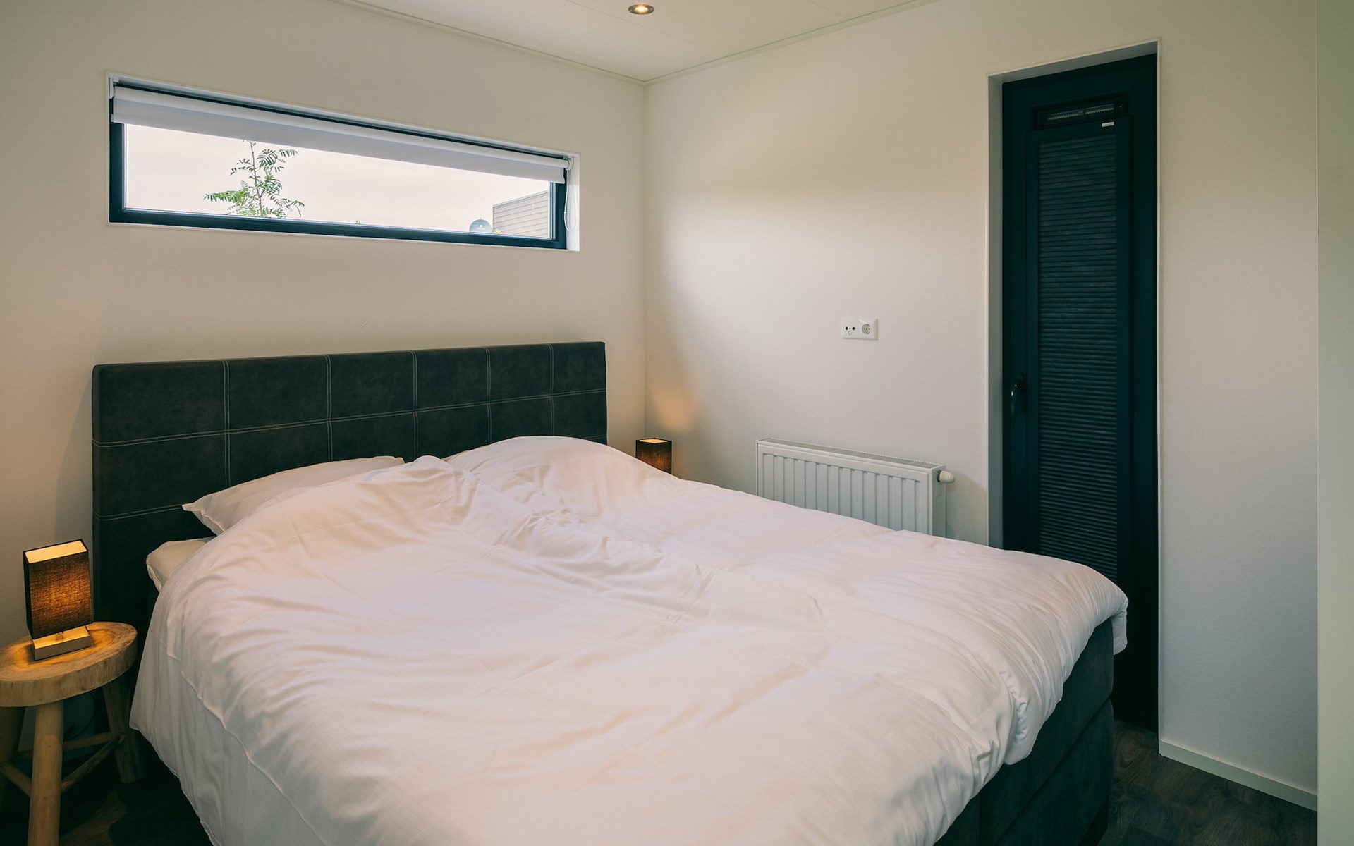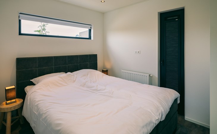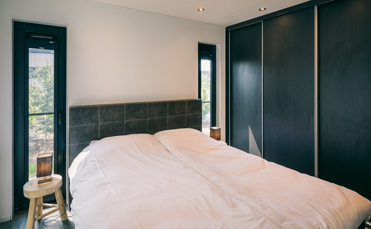Es gibt 2 Schlafzimmer und 1 Badezimmer im Erdgeschoss. Beide Schlafzimmer haben ein doppeltes Boxspringbett. Das Badezimmer hat eine Regendusche und ein Waschbecken und ist über eines der Schlafzimmer erreichbar. Es gibt auch eine separate Toilette. Außerdem verfügt der Bungalow über einen separaten Raum mit einer Wasch-Trockenkombination.