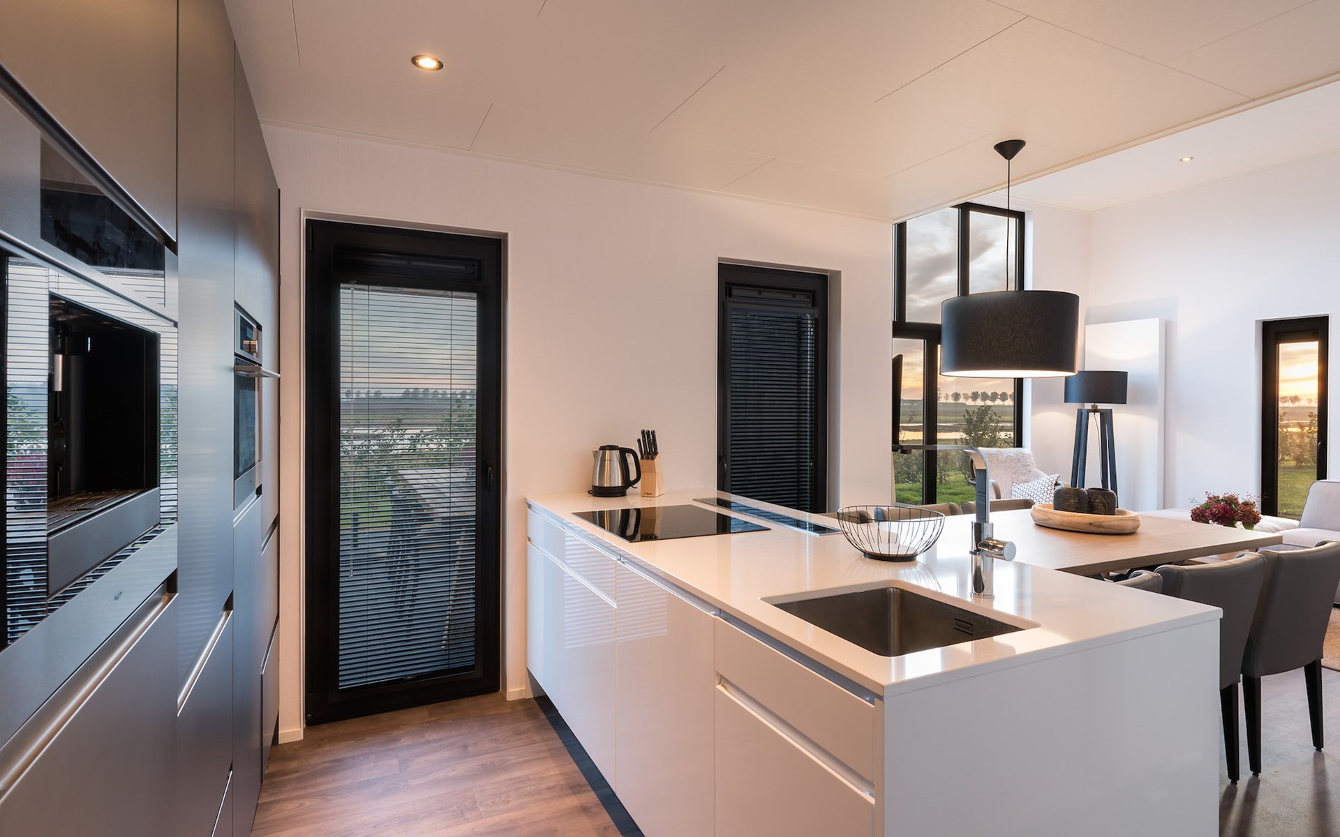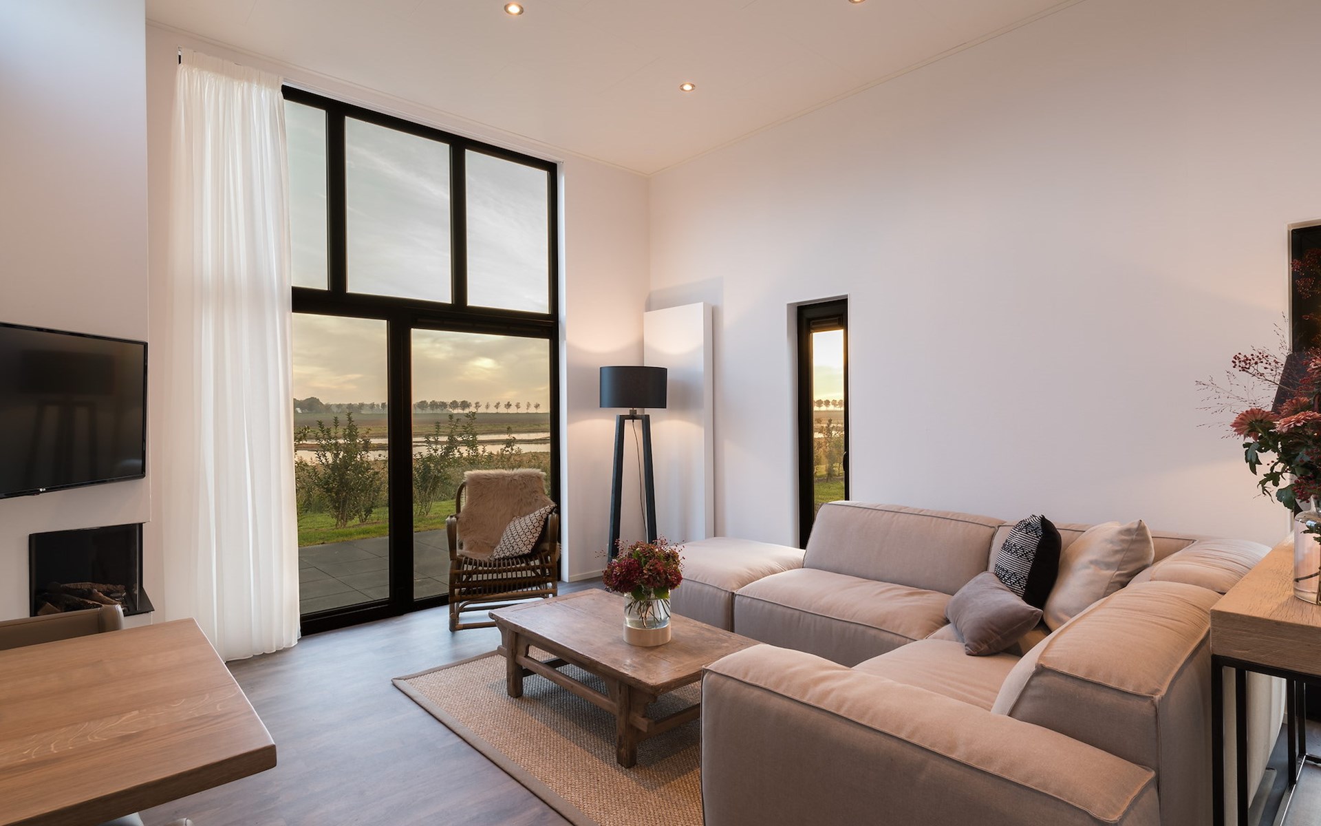 Das Wohnzimmer ist mit einer Sitzecke, einem Kamin und einem Smart-TV ausgestattet. Neben dem Wohnzimmer befindet sich die offene Küche mit Essecke. Die Küche verfügt u.a. über eine Kochinsel, einen Kühlschrank mit Gefrierfach, eine Kombimikrowelle, eine Filterkaffeemaschine, eine Kaffeebohnenmaschine und einen Geschirrspülmaschine.
