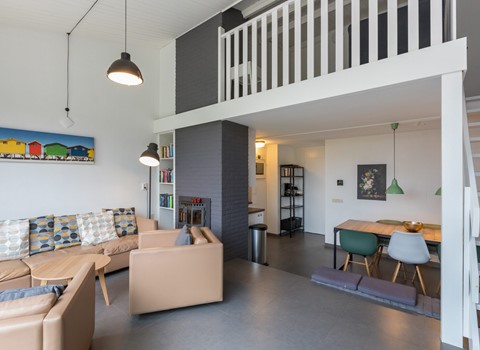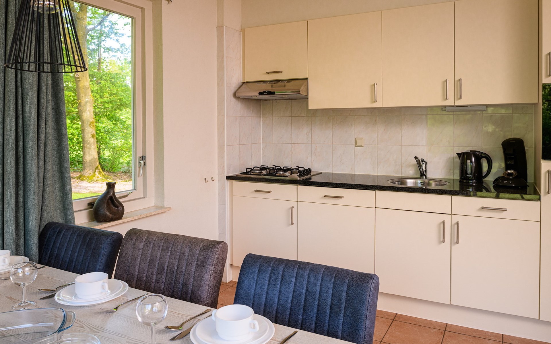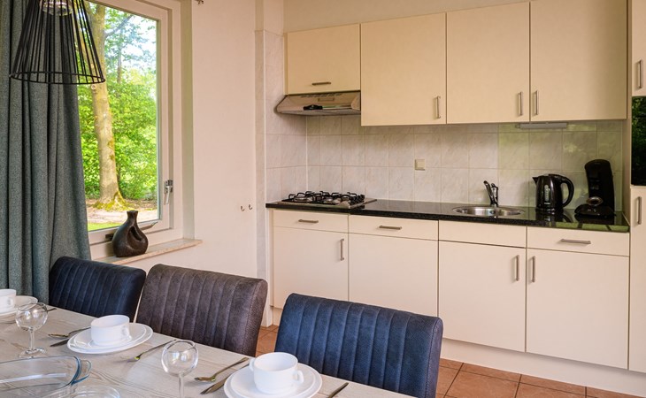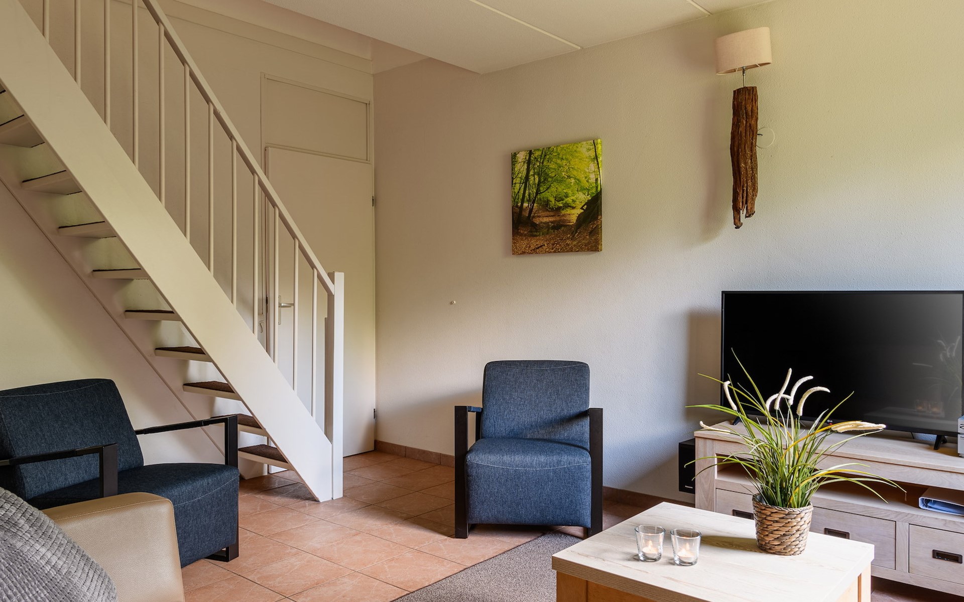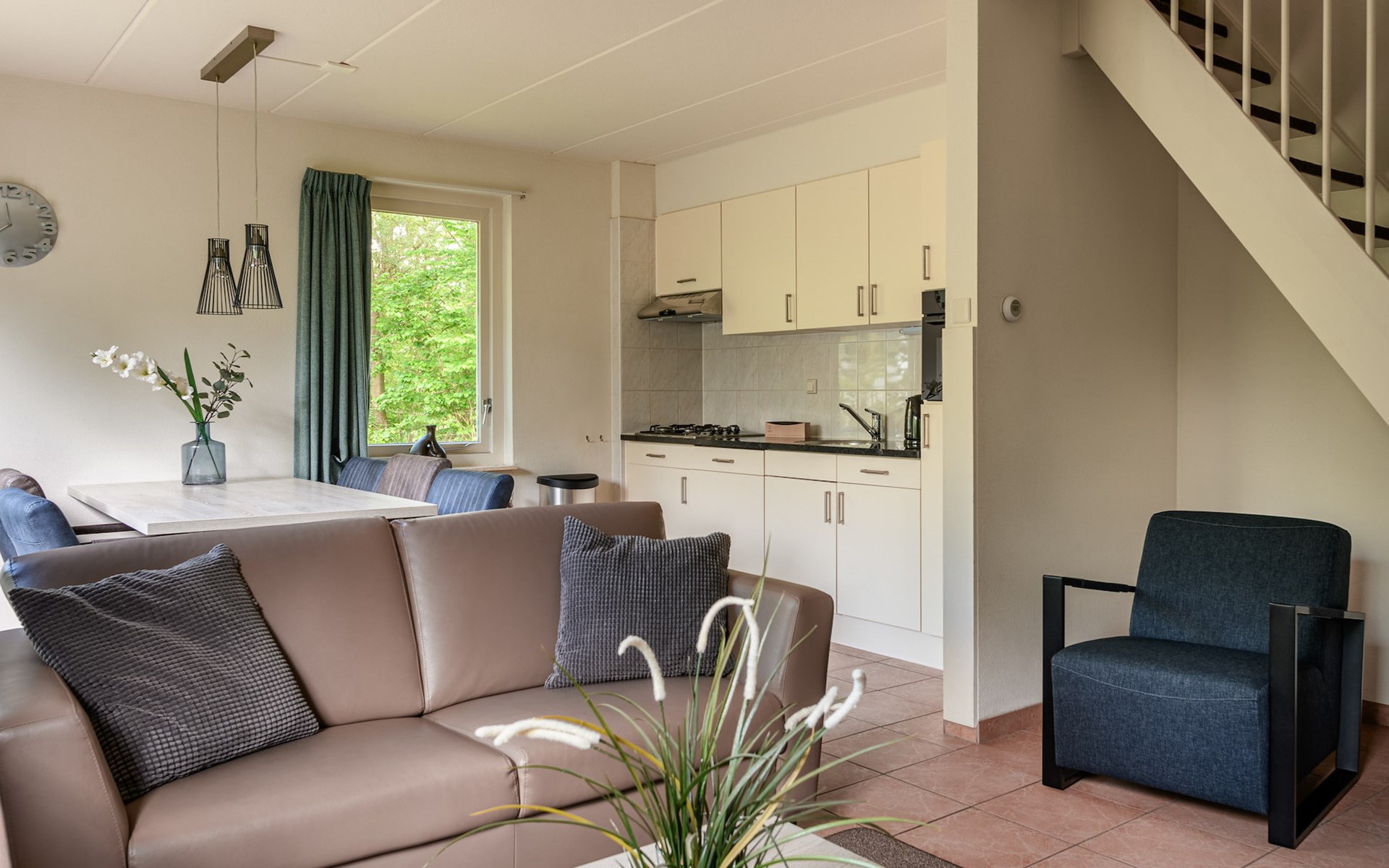 Das Wohnzimmer ist mit einer Essecke, einer Sitzecke mit einem Fernseher und einem Holzofen ausgestattet. Die Küche ist u.a. mit einem Kühlschrank mit Gefrierfach, einer Senseo-Kaffeemaschine, einer Filterkaffeemaschine, einer Kombimikrowelle und eine Geschirrspülmaschine ausgestattet. Der Bungalow verfügt über einen offenen Abstellraum mit einer Ladestation für Elektrofahrräder.