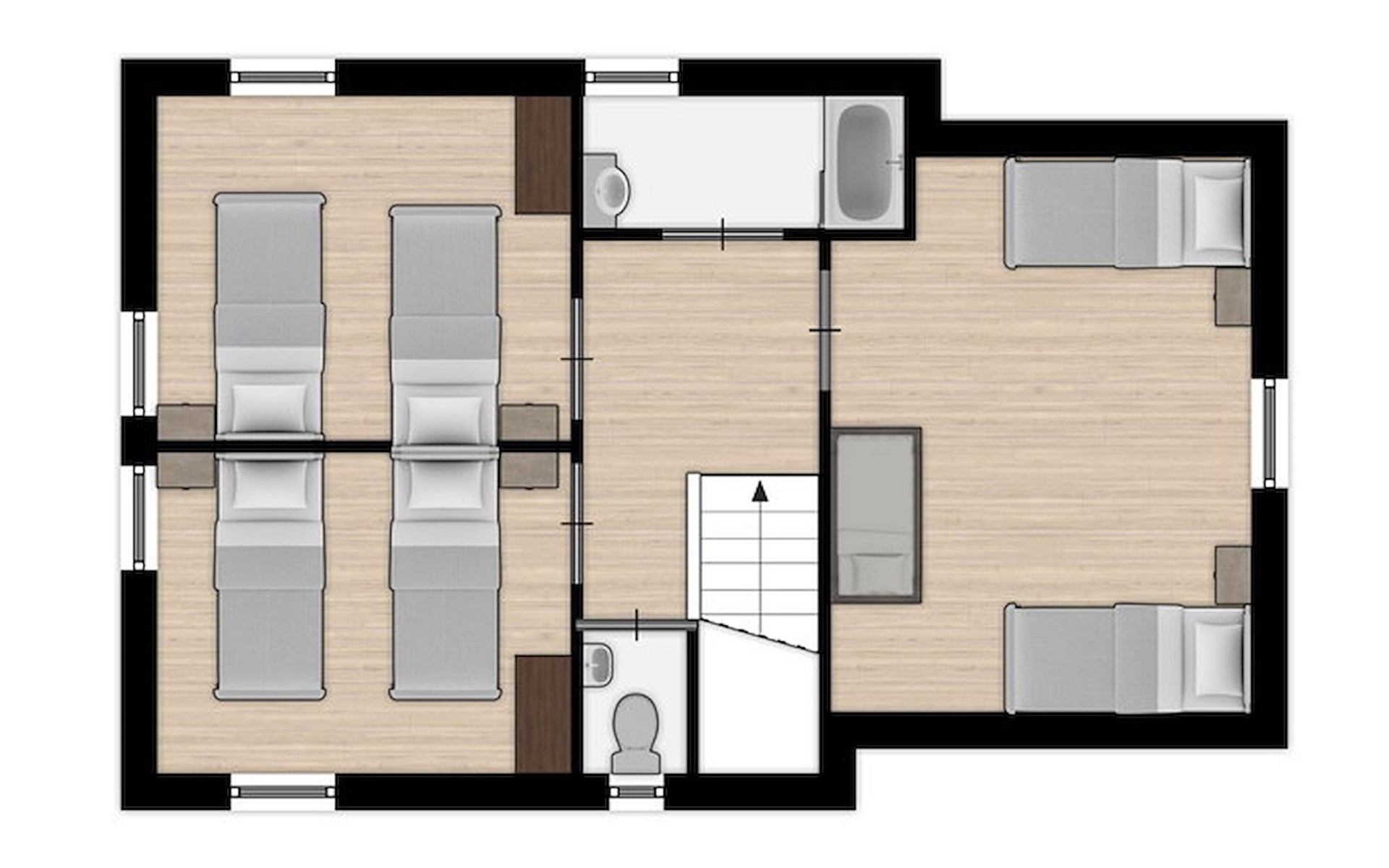 In der ersten Etage befinden sich 3 Schlafzimmer mit je 2 Einzelbetten. Das Badezimmer im ersten Stock hat eine Badewanne und ein Waschbecken. Es gibt auch eine separate Toilette.